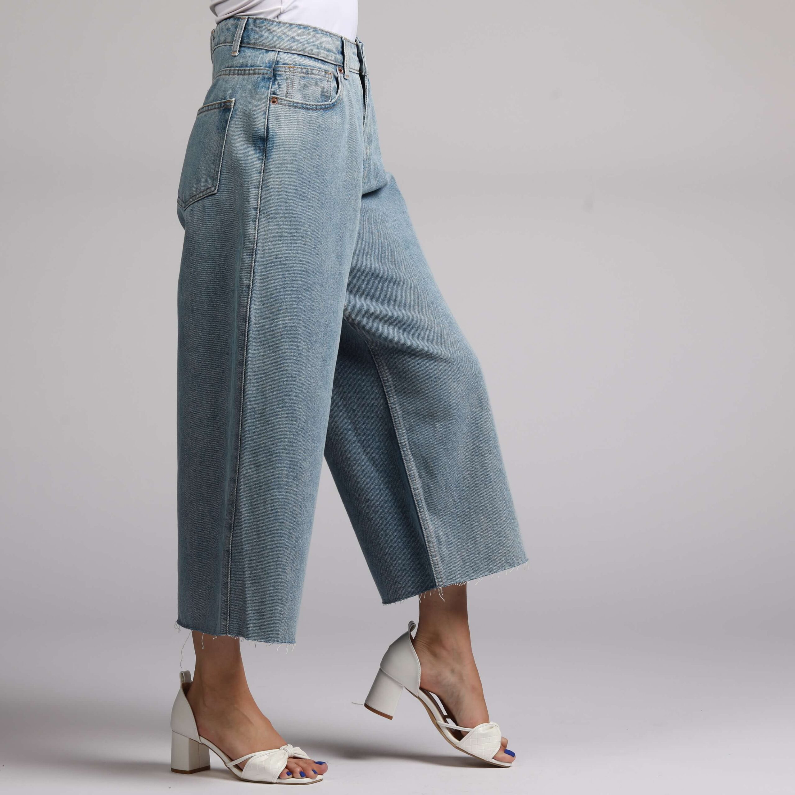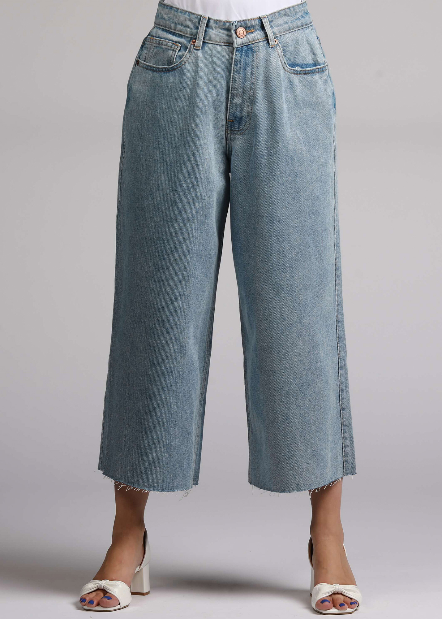جينز تصميم مقطع ساق عريضة نظام خمسة جيوب بزر و سحاب للأغلاق.