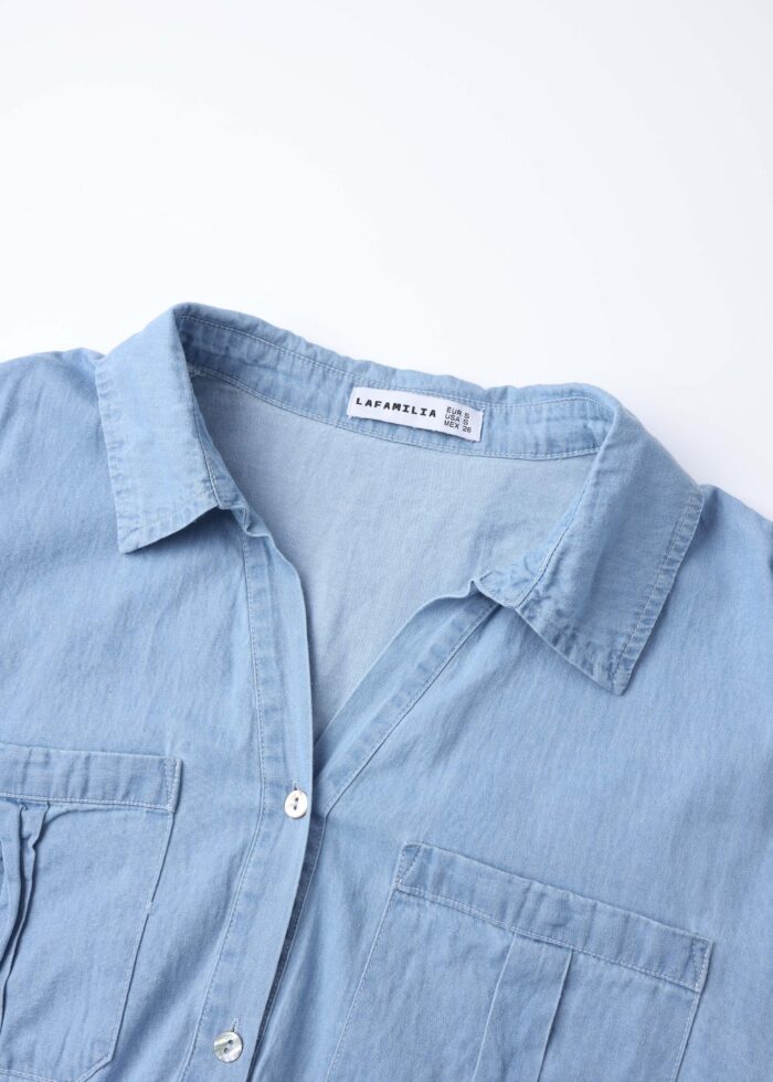 قميص نسائي, دينيم, ياقة مثنية سبعة من الامام, ازرار من الامام للاغلاق, جيوب من الامام, اكمام طويلة مع معصم ضيق, عملي وعصري
