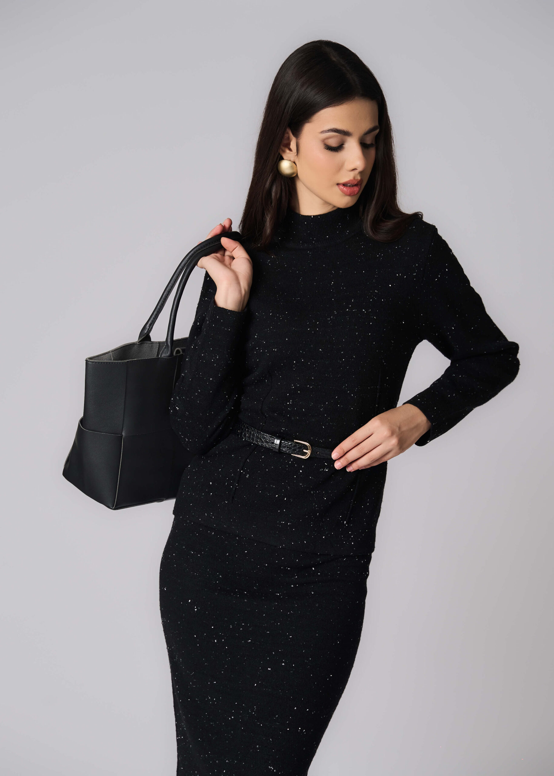 بلوزة نسائي, نسيج منقط, ياقة مرتفعة, اكمام طويلة, حزام, انيقة وعصرية