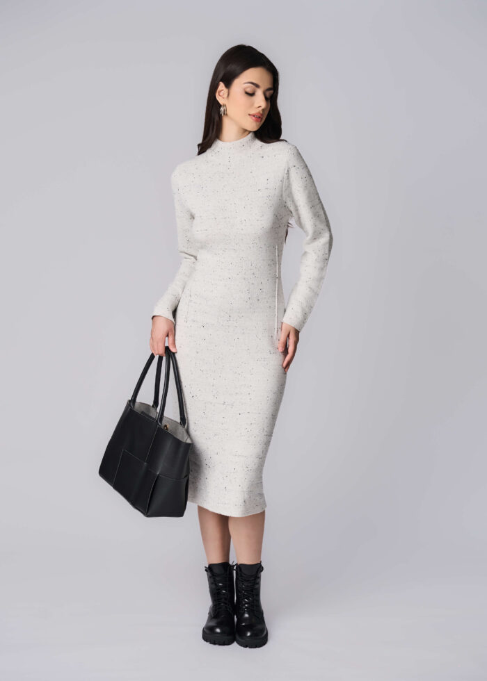 فستان نسائي, طويل, نسيج منقط, محبوك, ياقة مرتفعة, اكمام طويلة, انيق وعصري