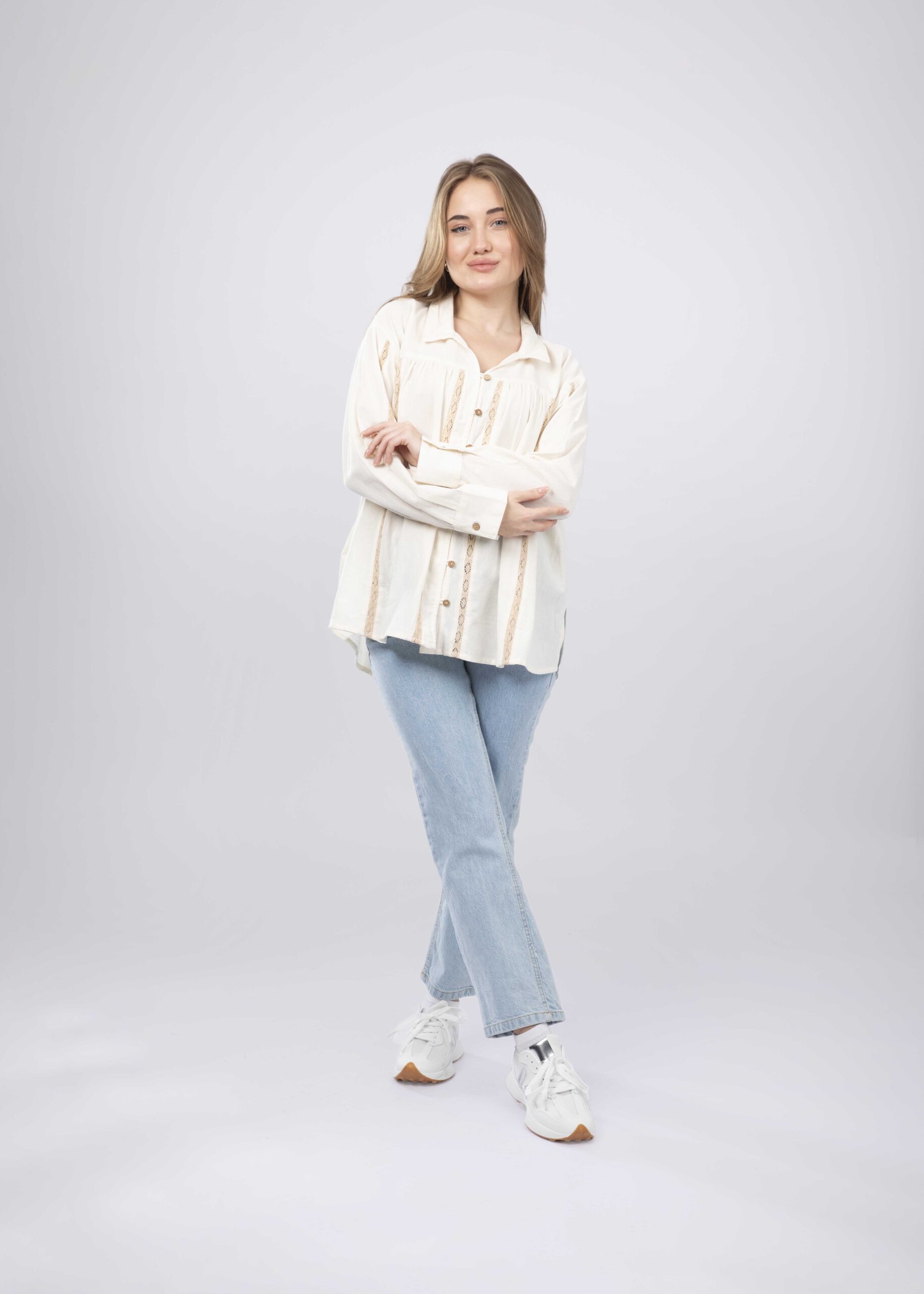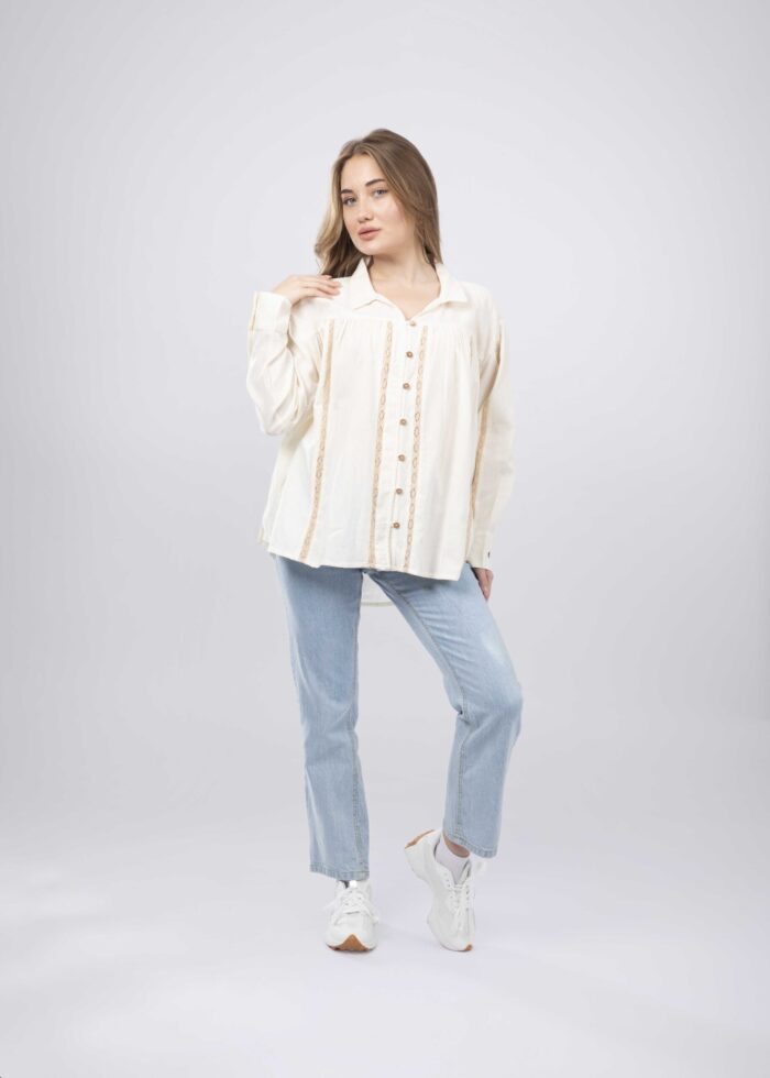 قميص نسائي, مزين بتطريز, ياقة سبعة مثنية, ازرار من الامام للاغلاق, اكمام طويلة مع معصم ضيق, انيق وعملي