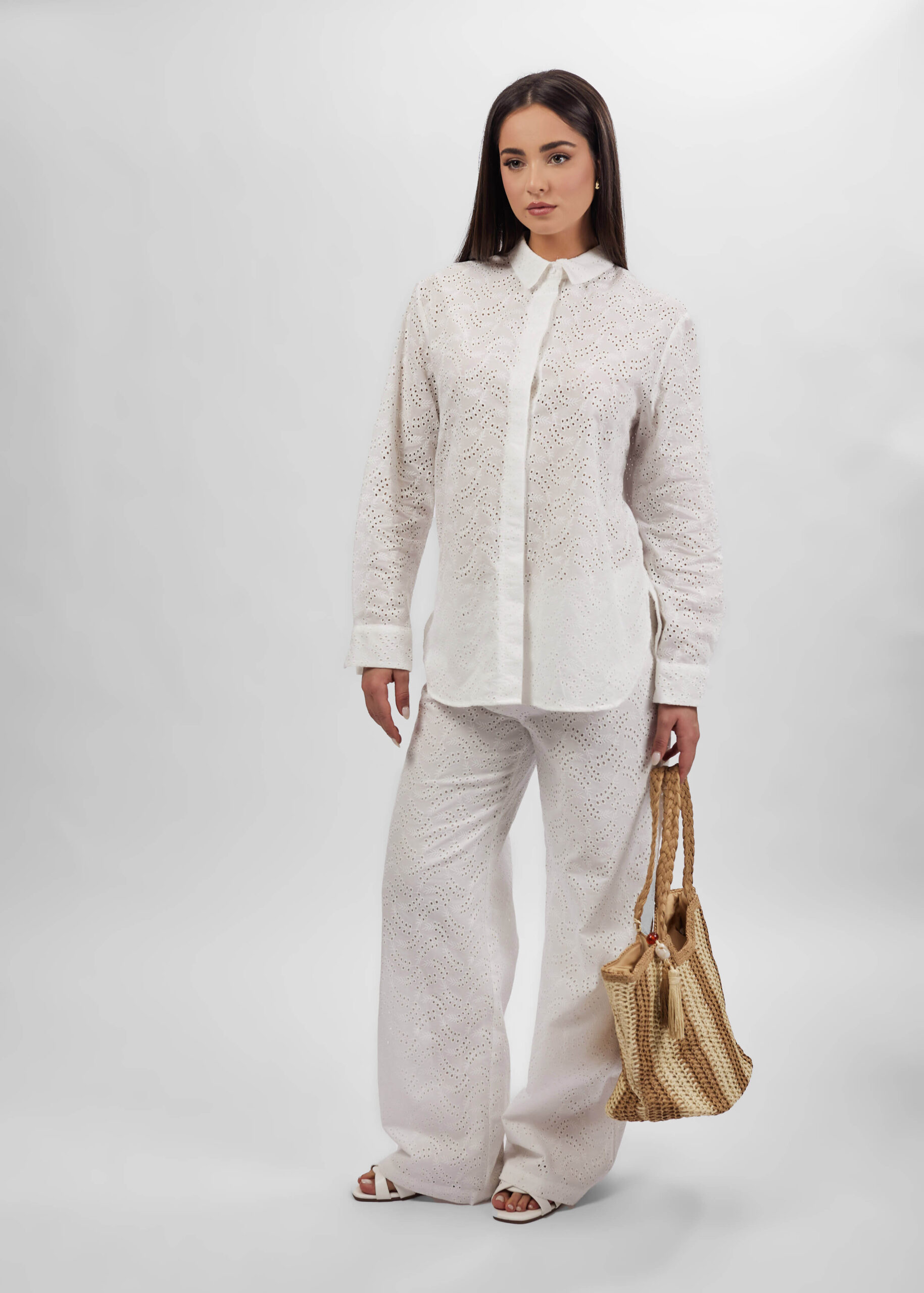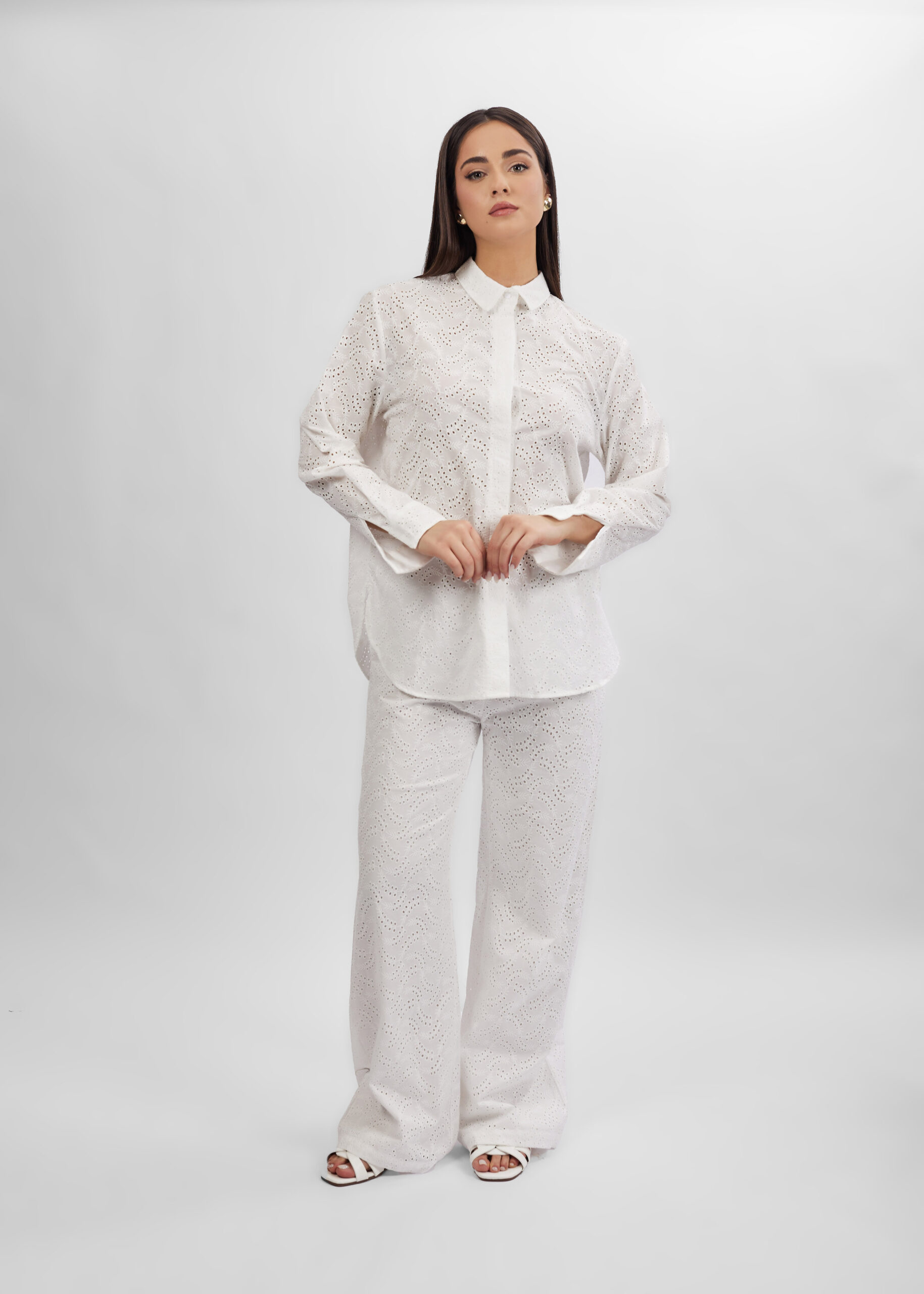 قميص نسائي, مزين بتطريز, ياقة مثنية مع زر من الامام, ازرار من الامام للاغلاق, اكمام طويلة مع معصم ضيق, انيق وعصري