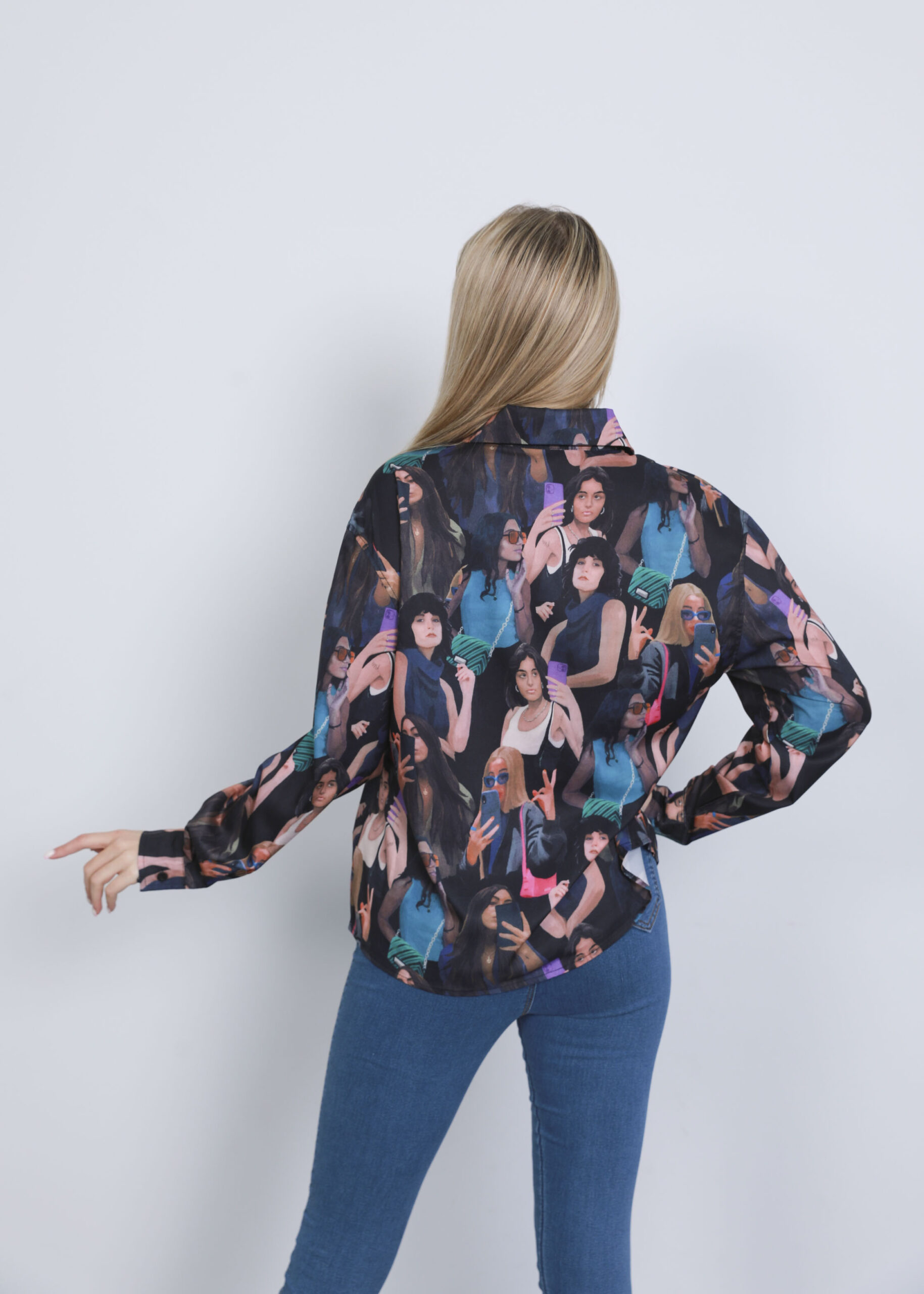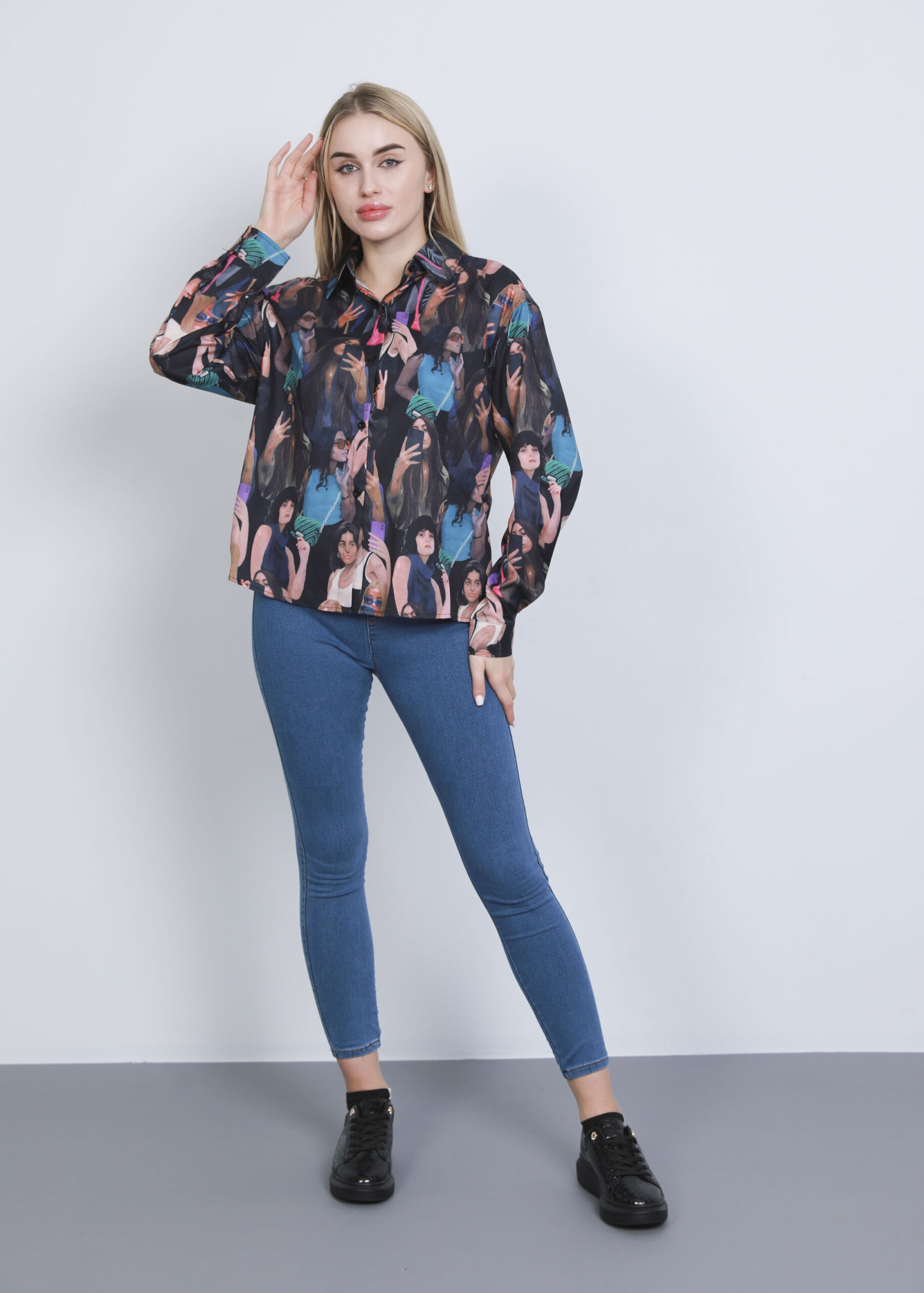 قميص نسائي, طباعة تصميم الوجوه, اكمام طويلة مع معصم ضيق وزر للاغلاق, ازرار امامية للاغلاق, ياقة مثنية مع زر امامي, انيق وعصري بالوان زاهية, 100% بوليستر