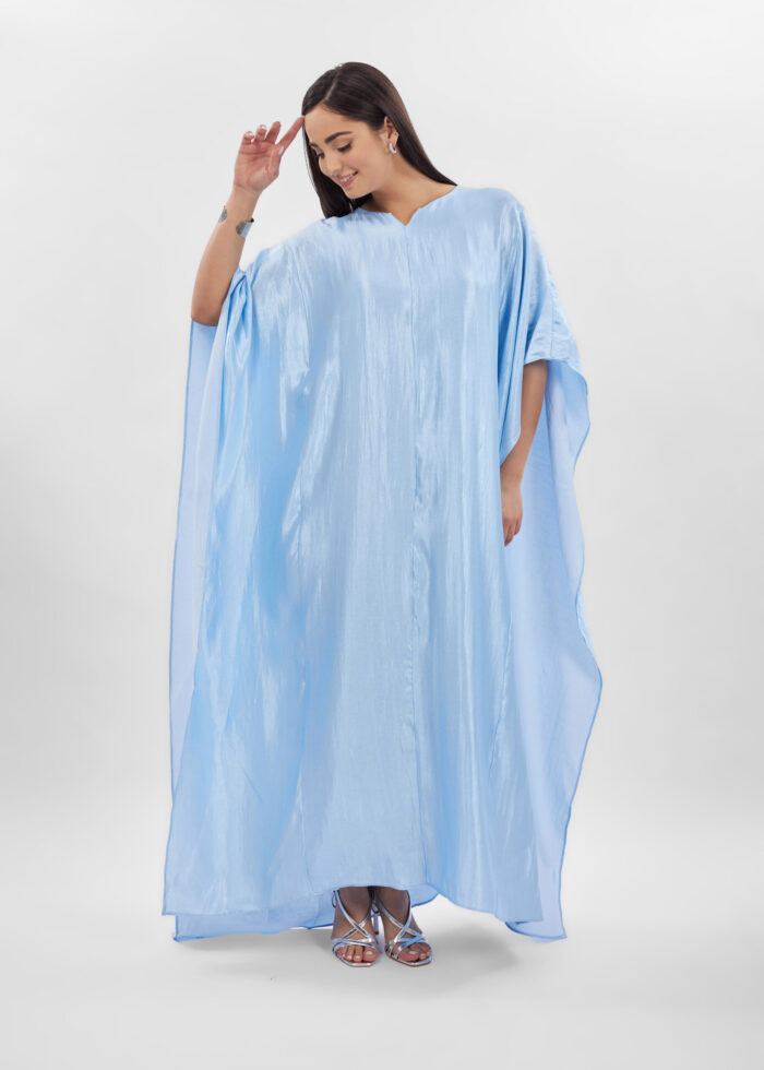 فستان نسائي, طويل, واسع, نسيج لامع, ياقة مدورة, اكمام واسعة, حزام خصر للربط, انيق وعصري