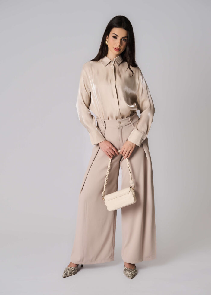 قميص نسائي, سادة, نسيج لامع, ياقة مثنية مع زر من الامام, اكمام طويلة مع معصم ضيق, ازرار من الامام للاغلاق, انيق وعصري