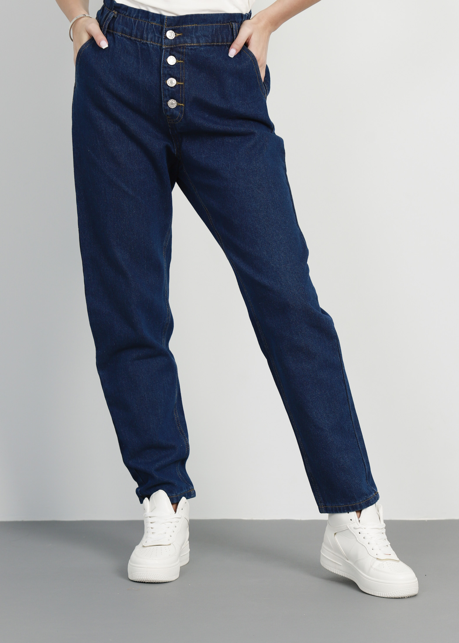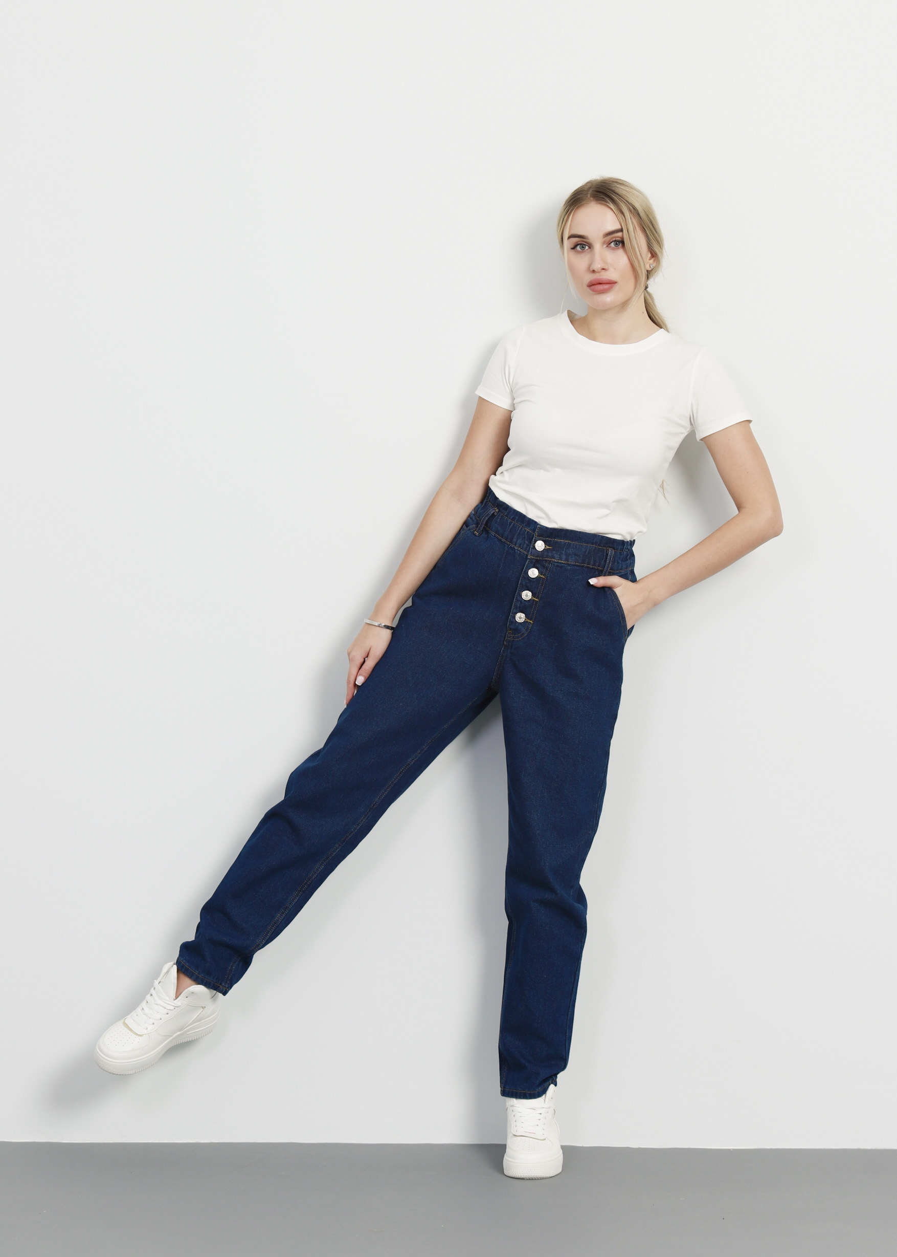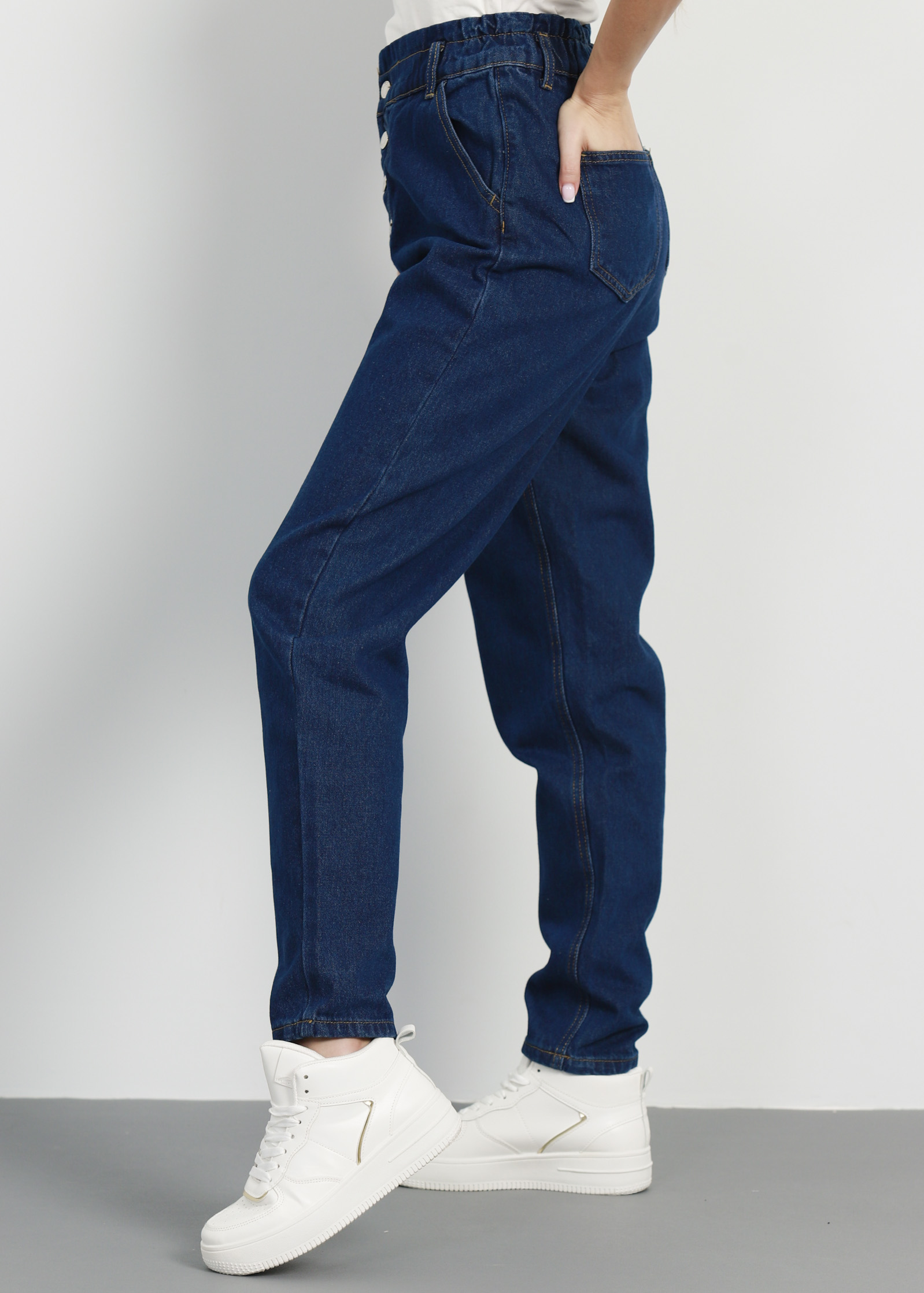 بنطلون نسائي, جينز, Mom-Fit, خصر عالي, خصر مطاطي مع أزرار أمامية للإغلاق, جيوب أمامية وخلفية, أنيق, 83% قطن 17% بوليستر