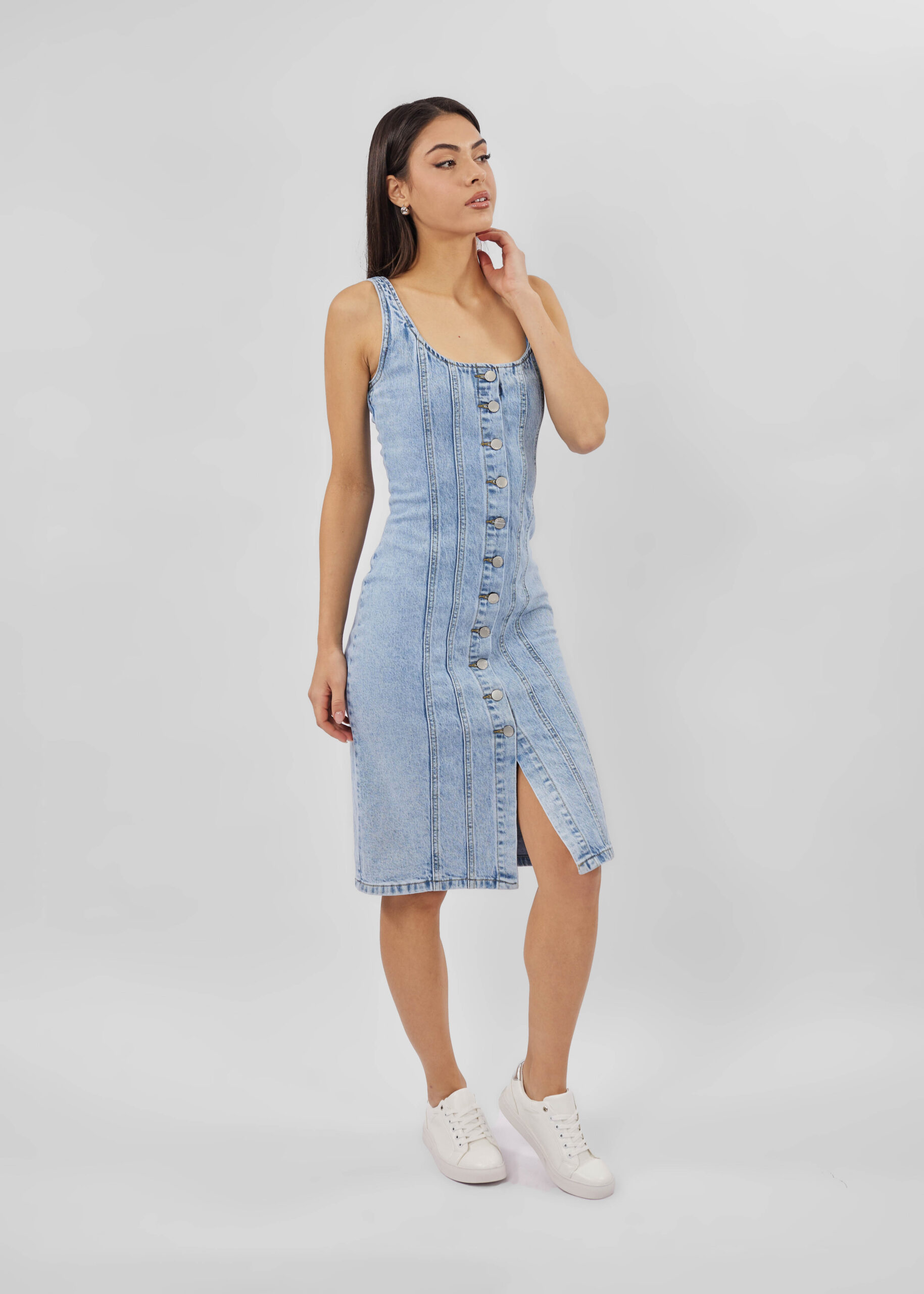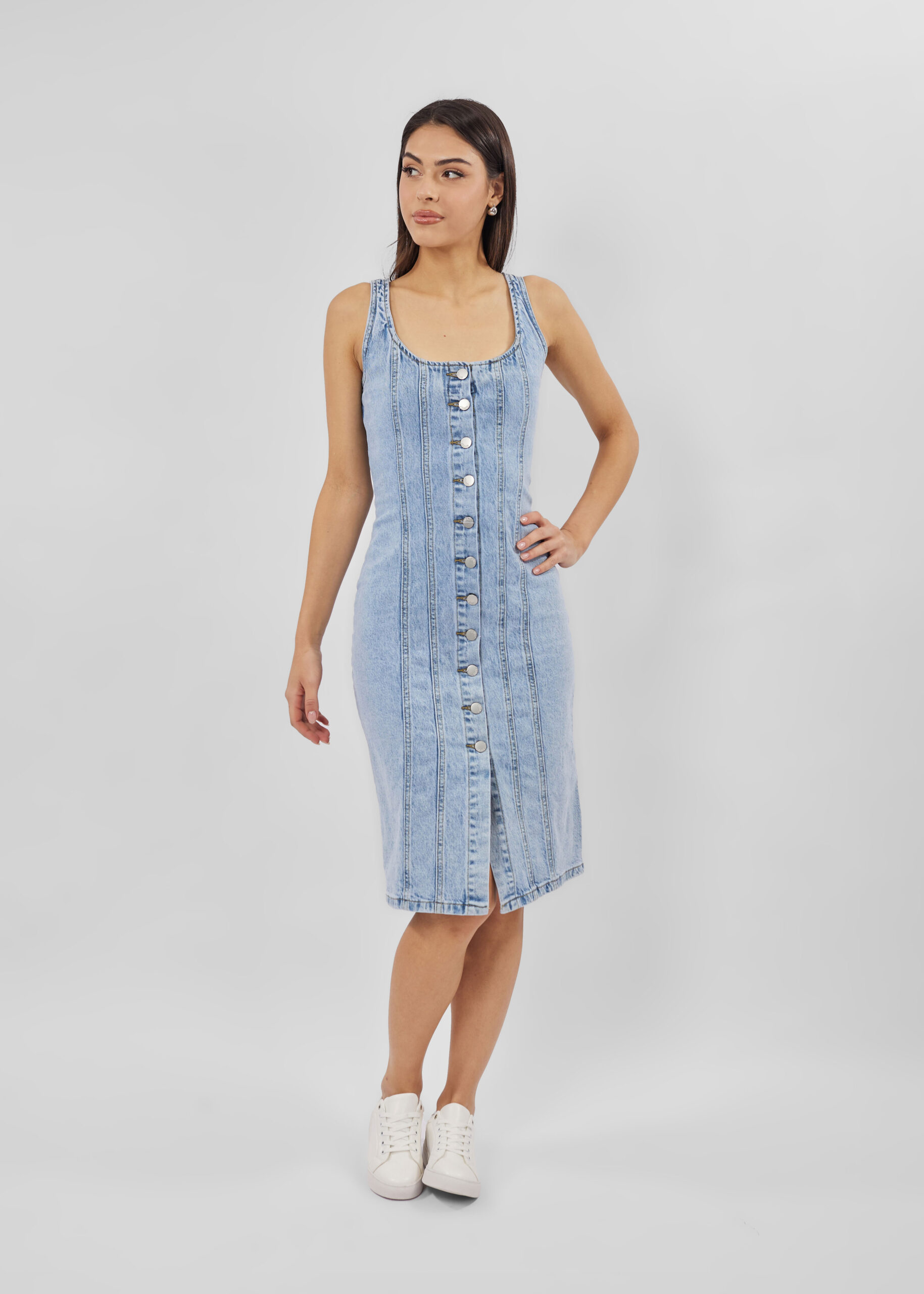 فستان نسائي, جينز, قصير, ياقة واسعة, بدون اكمام, ازرار من الامام, انيق وعصري