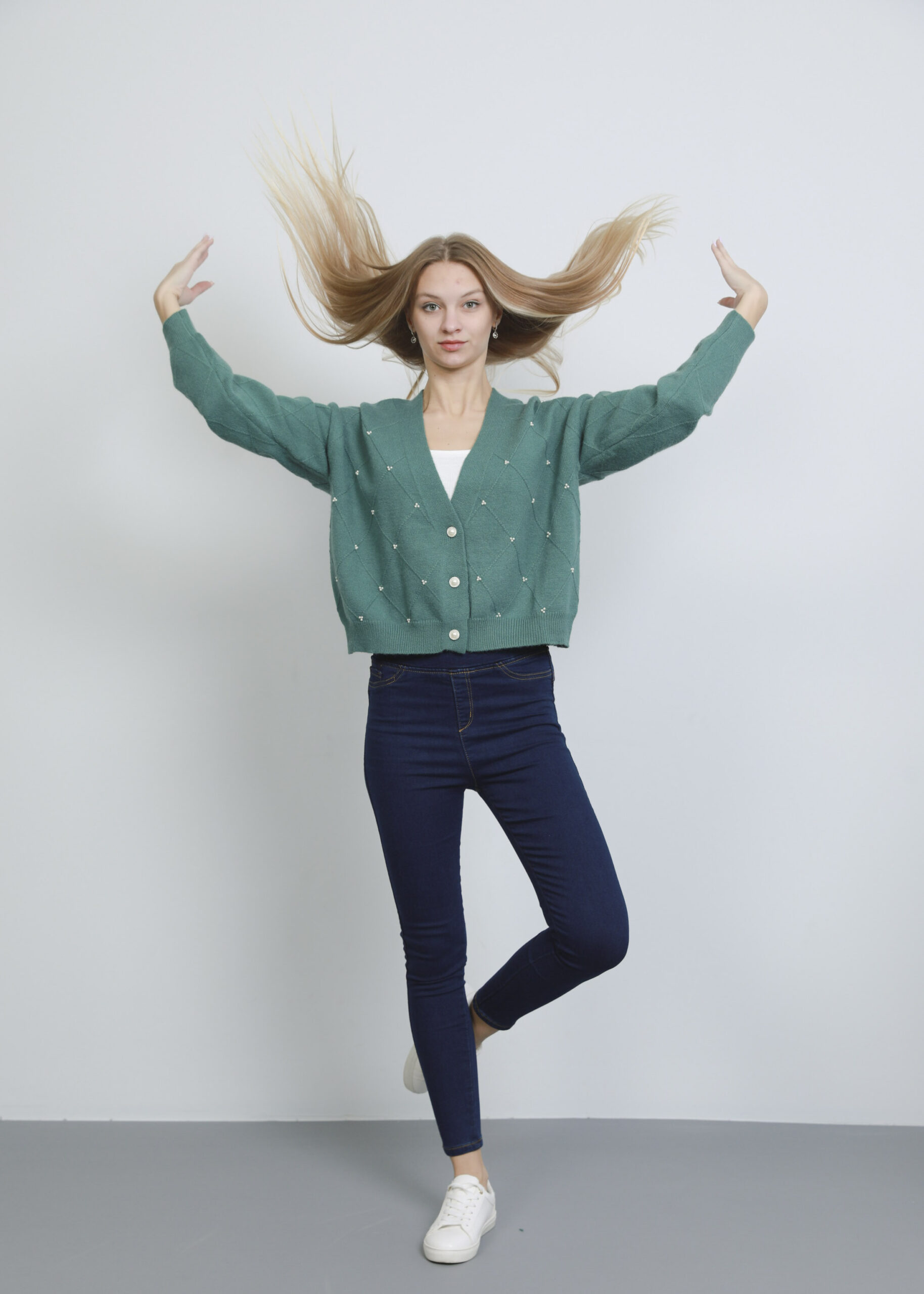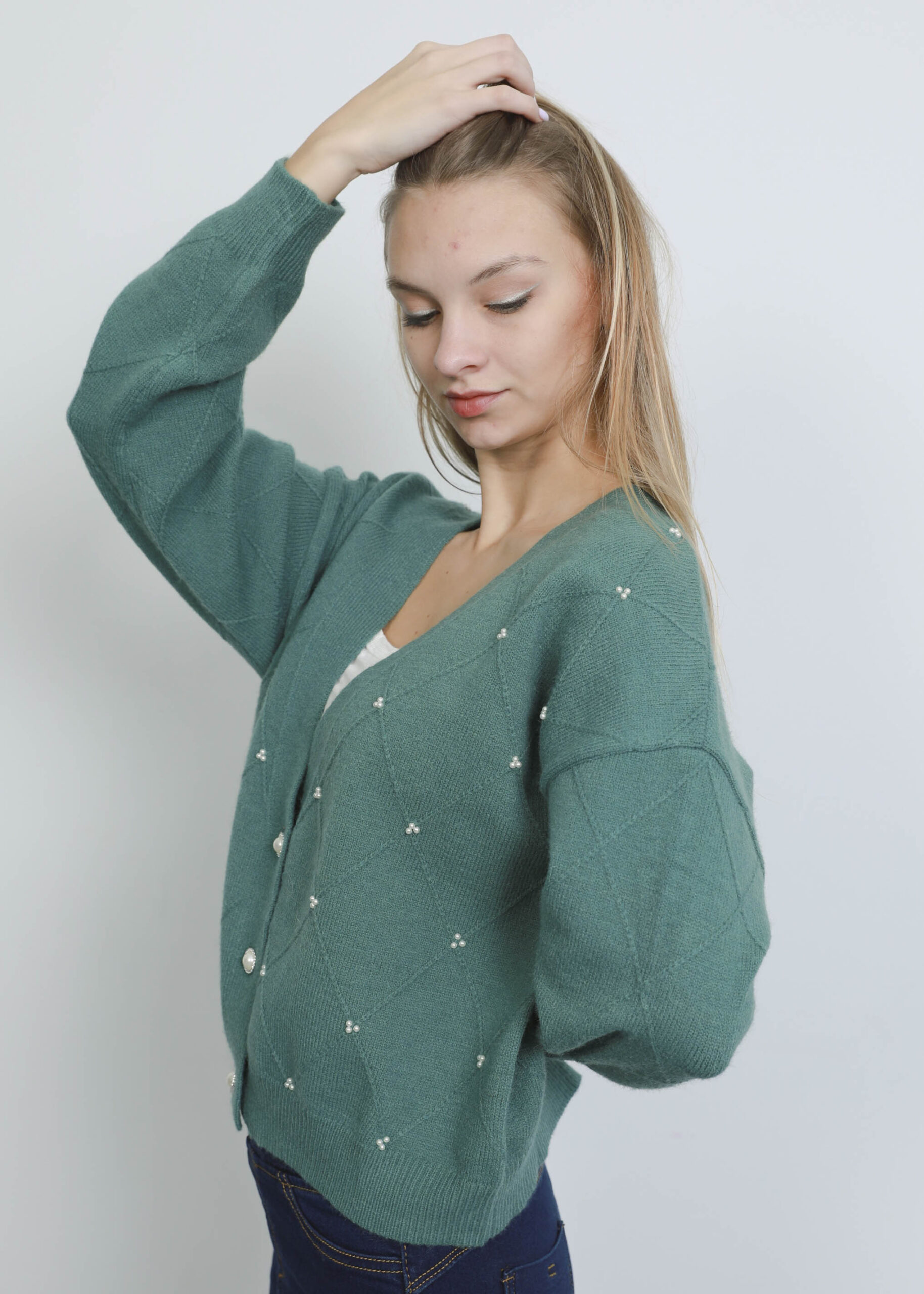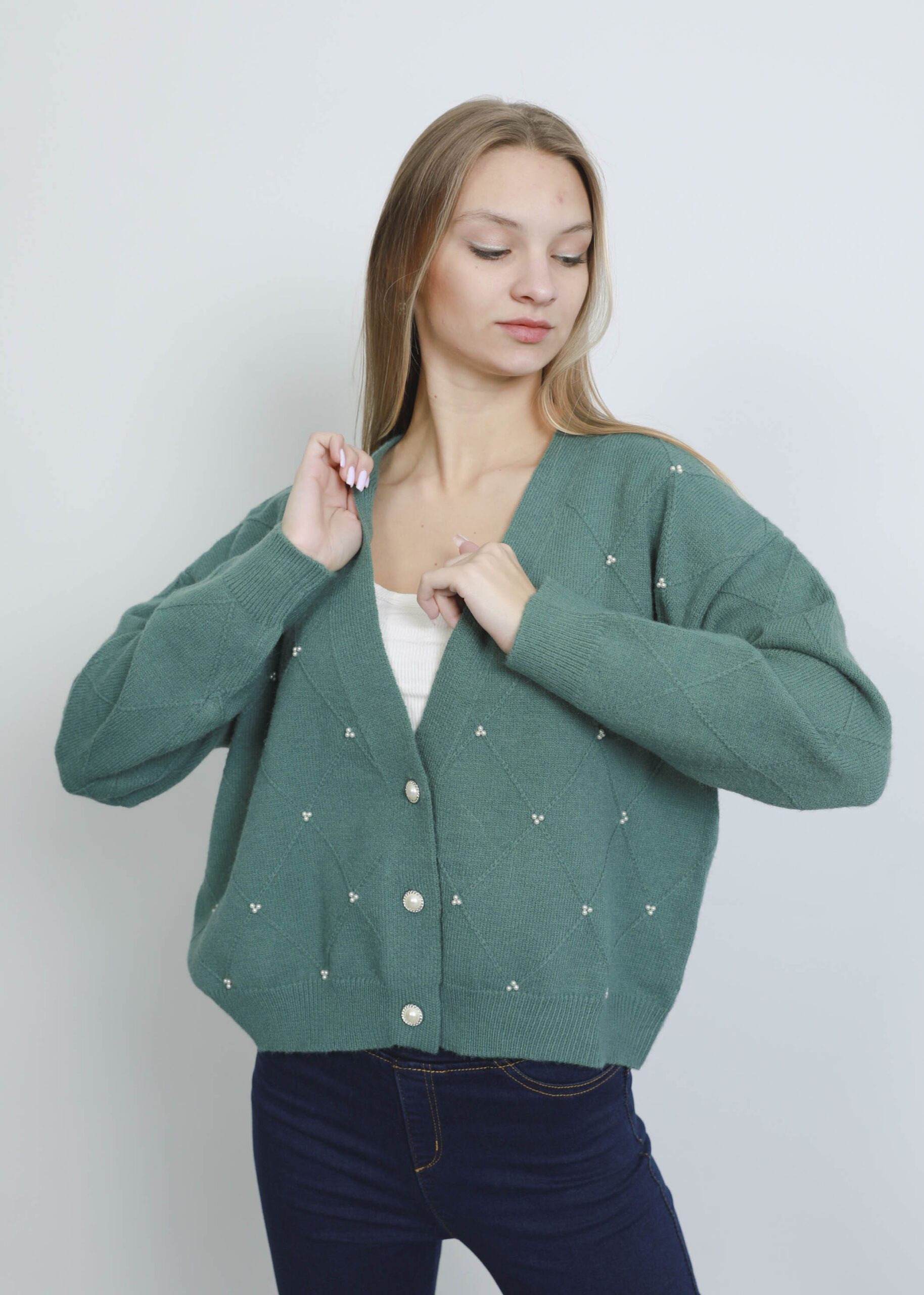 جاكيت نسائي, تصميم محبوك, مزين باللؤلؤ من الامام, اكمام طويلة, ياقة سبعة, ازرار امامية للاغلاق, انيق وعصري, 45% اكريليك 30% بوليستر 25% نايلون