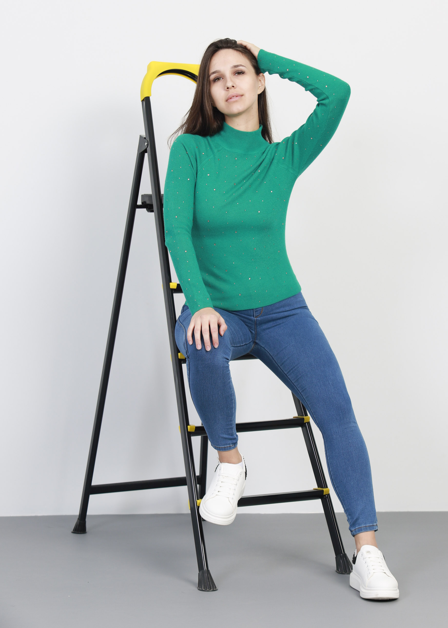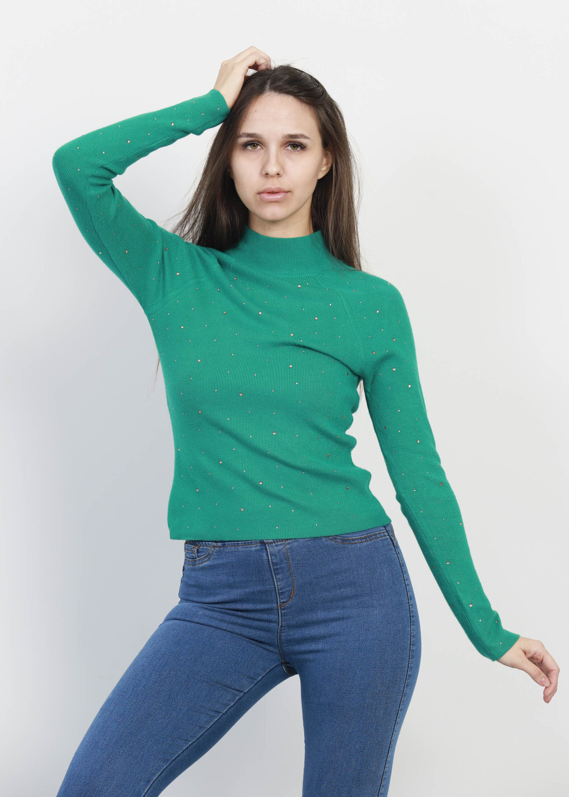بلوزة نسائي, مزينة بالستراس, تصميم محبوك, اكمام طويلة, ياقة مرتفعة, مريحة وعملية, 50% نايلون 25% مودال 25% فيسكوز