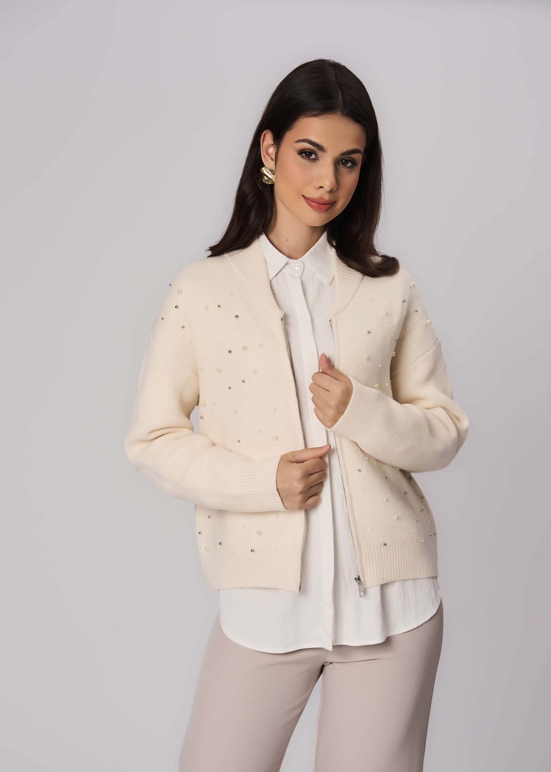 جاكيت نسائي, محبوك, مزين باللؤلؤ, ياقة مدورة, سحاب من الامام للاغلاق, اكمام طويلة مع معصم ضيق, انيق ودافيء