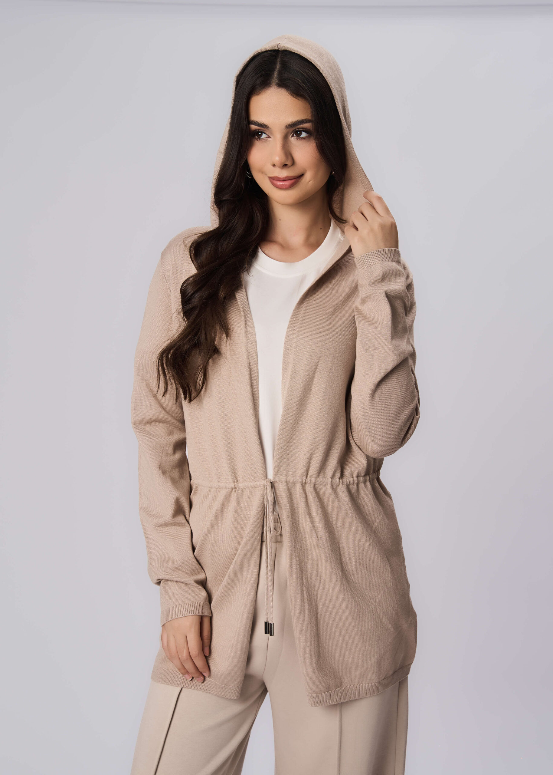 كارديجان نسائي, نسيج محبوك, سادة, مفتوح مع ربطة من الخصر, طاقية, اكمام طويلة, انيق ومناسب مع عدة تنسيقات