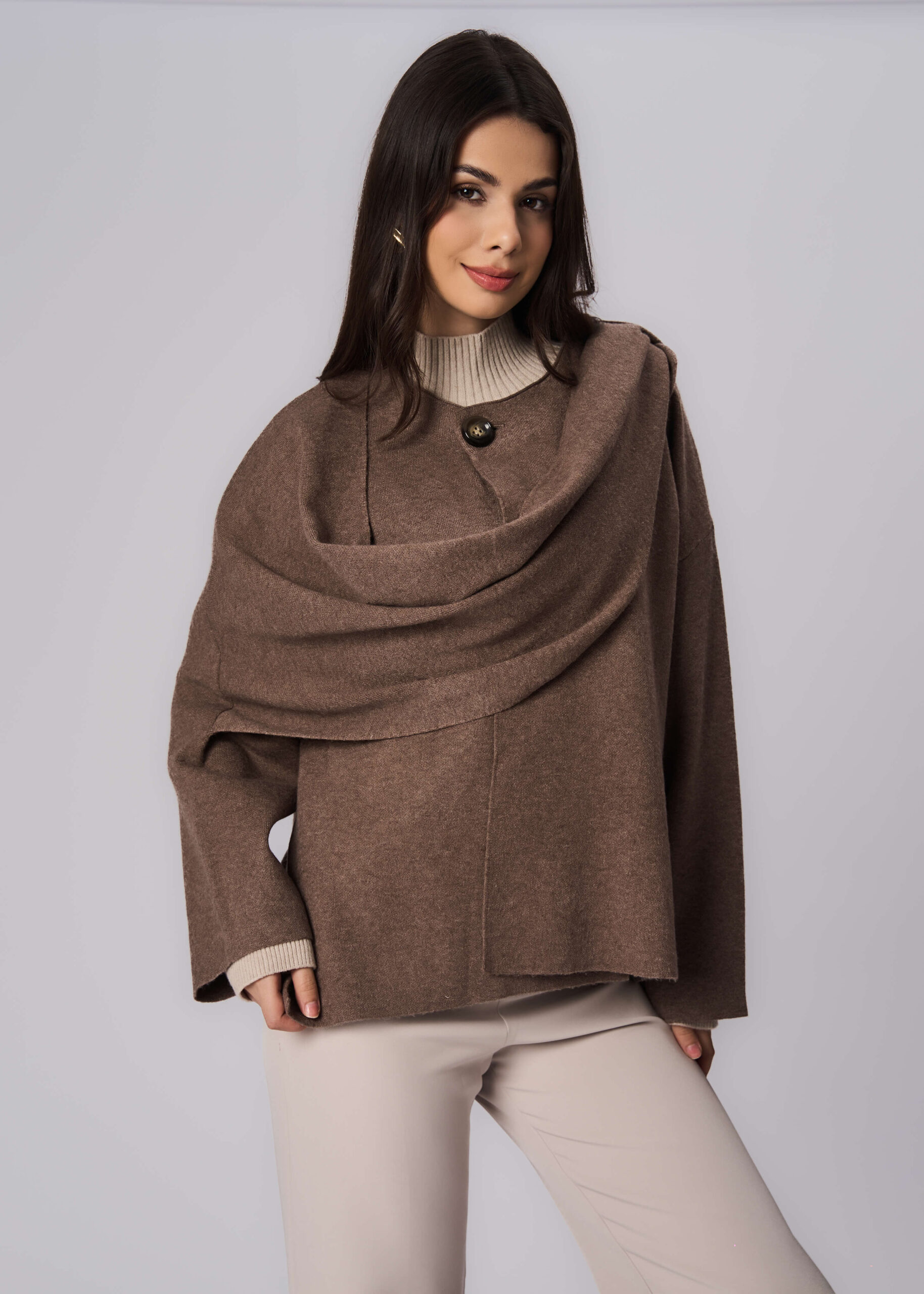 جاكيت نسائي, نسيج محبوك, سادة, تصميم طبقات, ياقة مدورة مع زر من الامام للاغلاق, اكمام طويلة, تصميم سكارف من الامام, انيق ودافيء