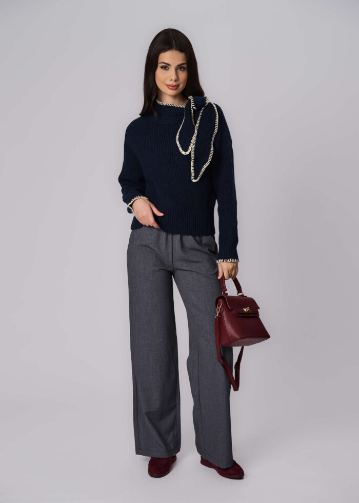 بلوزة نسائي, نسيج محبوك مخطط, ياقة مدورة مع ربطة جانبية, اكمام طويلة, انيقة ودافئة