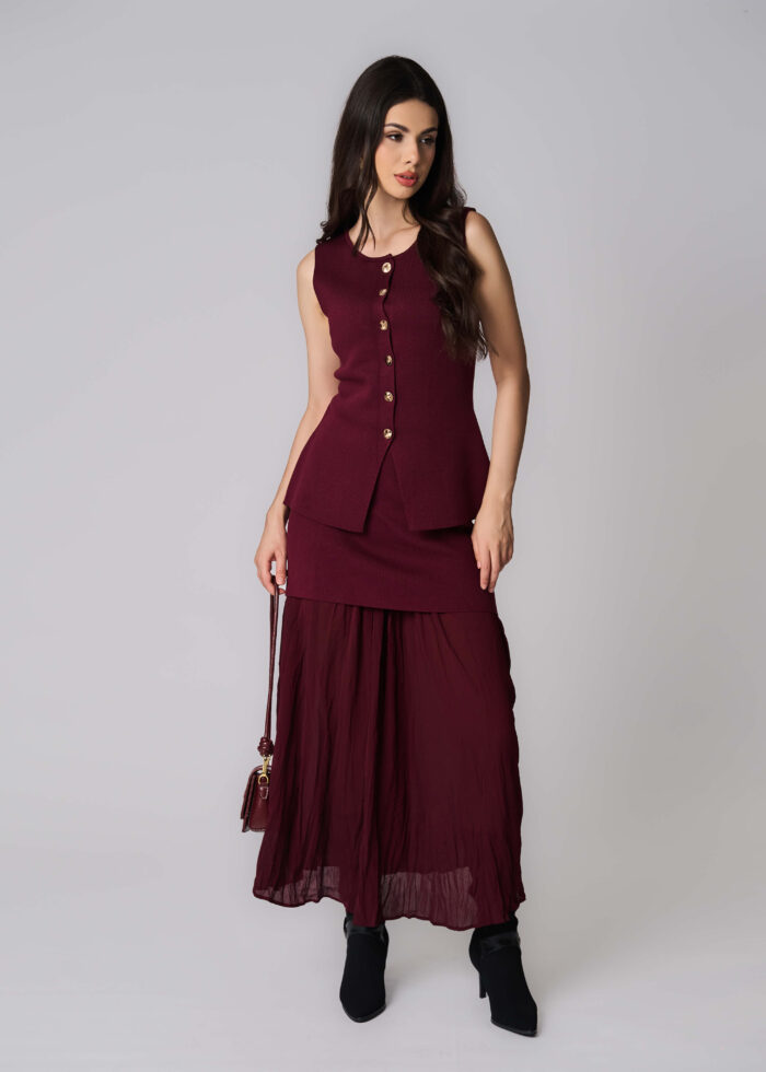 تنورة نسائي, طويلة, سادة, تصميم طبقات, سحاب من الجانب للاغلاق, طبقة من قصيرة من النسيج المحبوك من الاعلى مع طبقة من الشيفون بتصميم كسرات من الاسفل, انيقة وعصرية