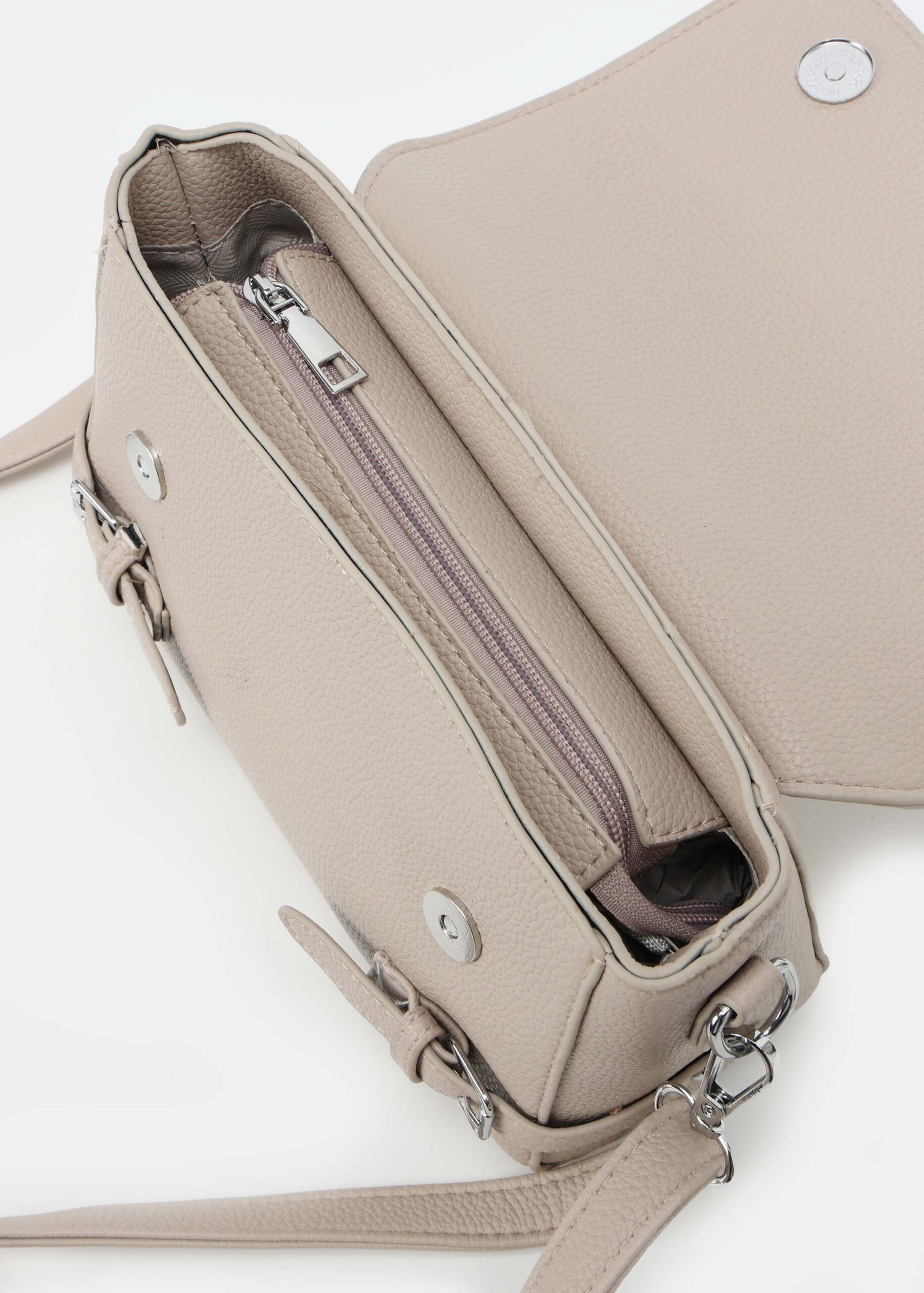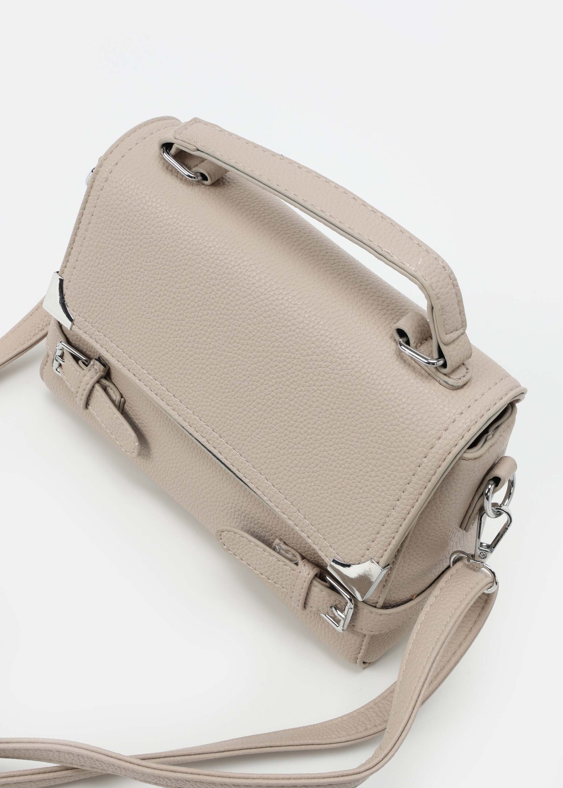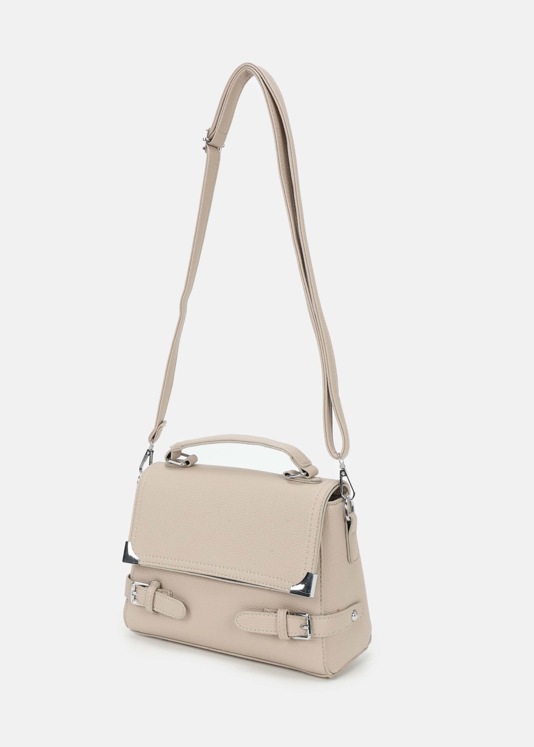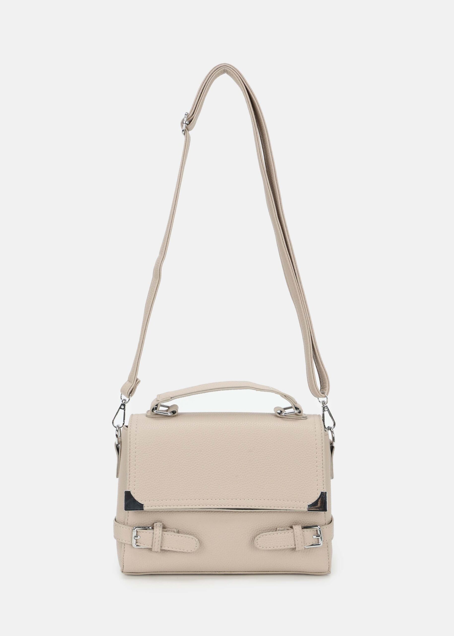 حقيبة نسائي, جلد, غطاء امامي مع ازرار مغناطيسية, مزينة باحزمة من الجانبين, حزام يد, حزام كتف قابل للتعديل والازالة, سحاب من الاعلى للاغلاق, انيقة وعصرية