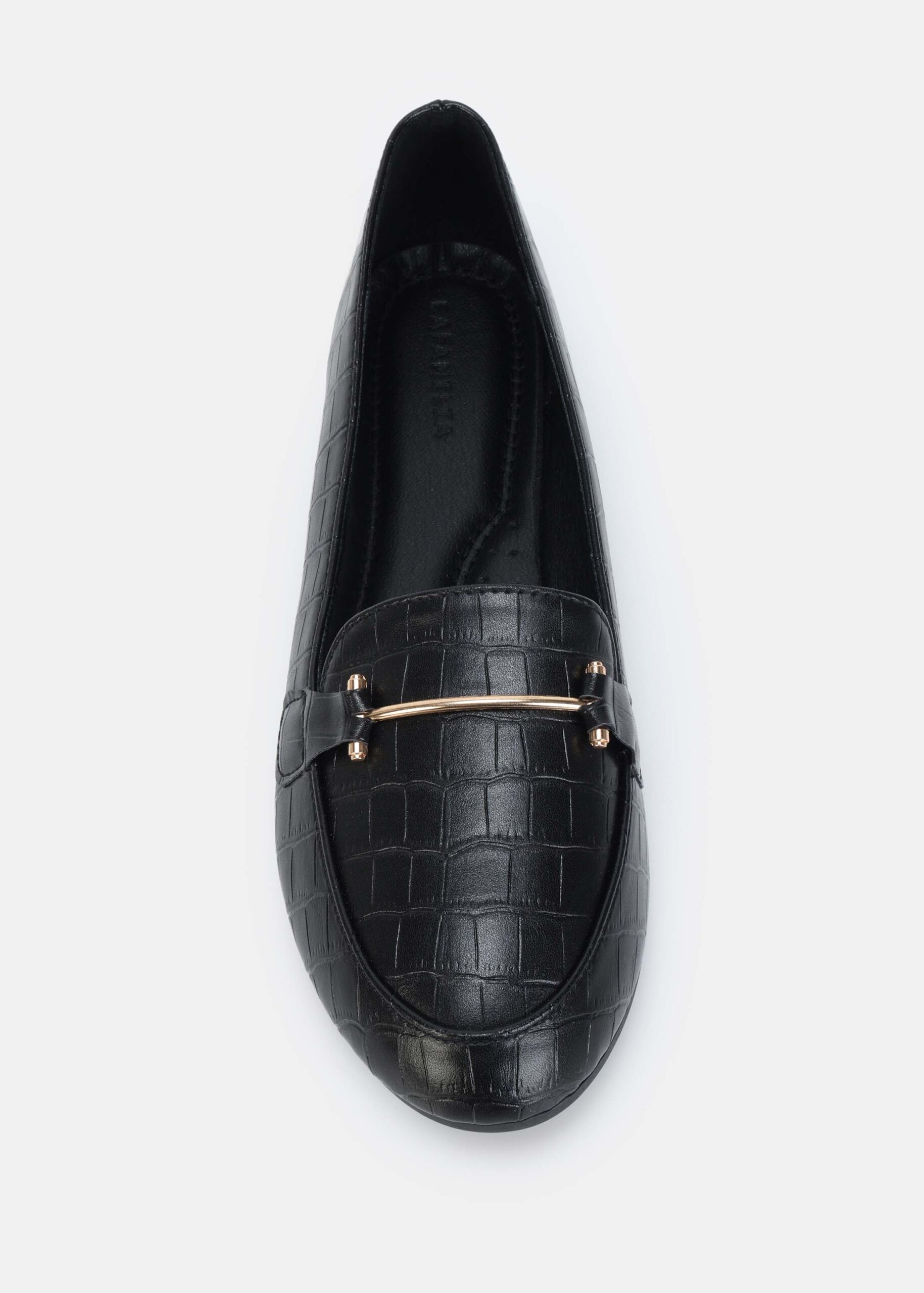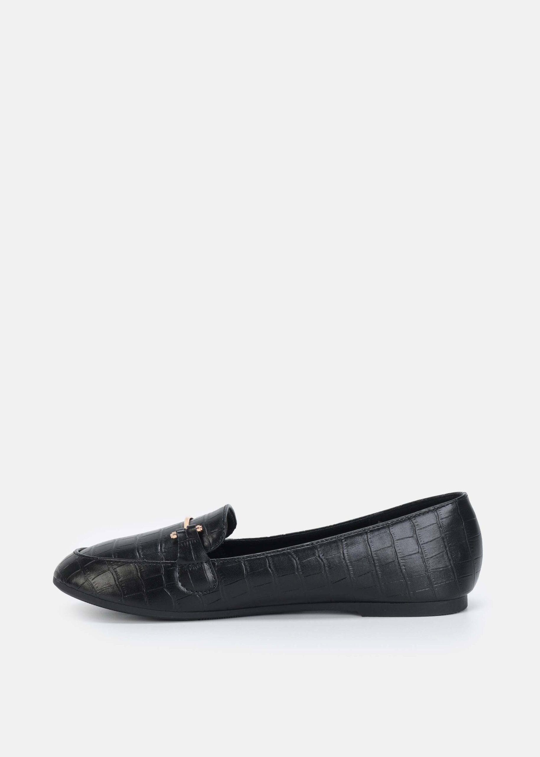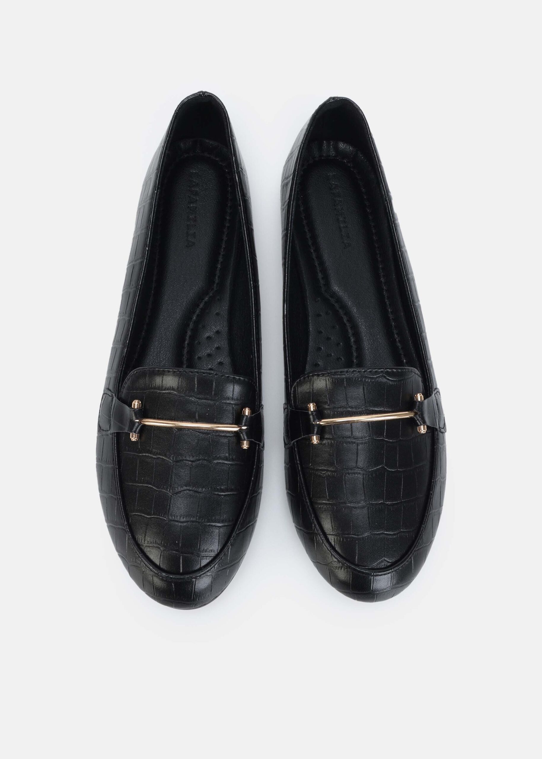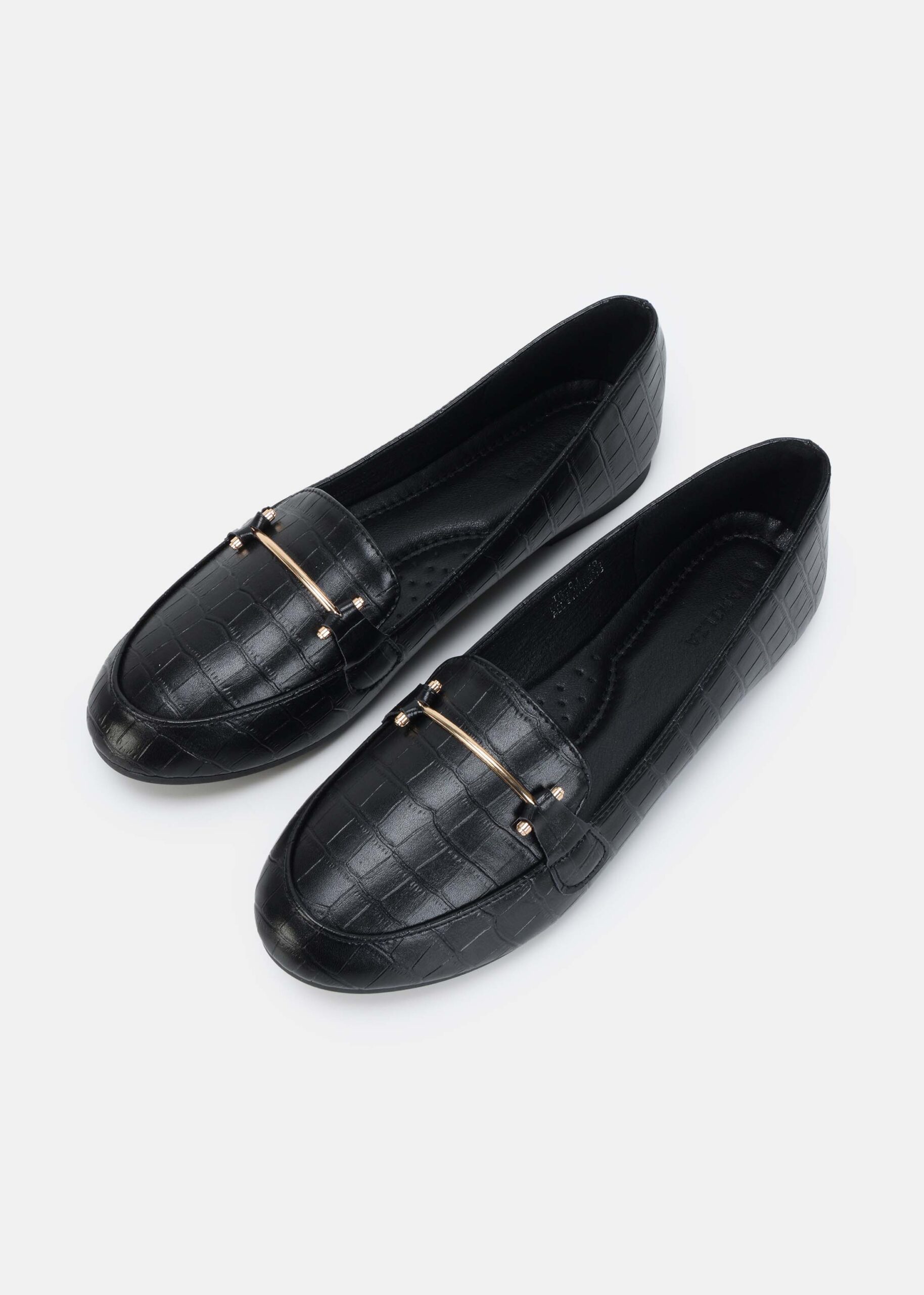 باليرينا نسائي, جلد, بنقش, مقدمة مدورة, نعل مسطح, مزين بقطعة معدنية من الاعلى, انيقة وعصرية