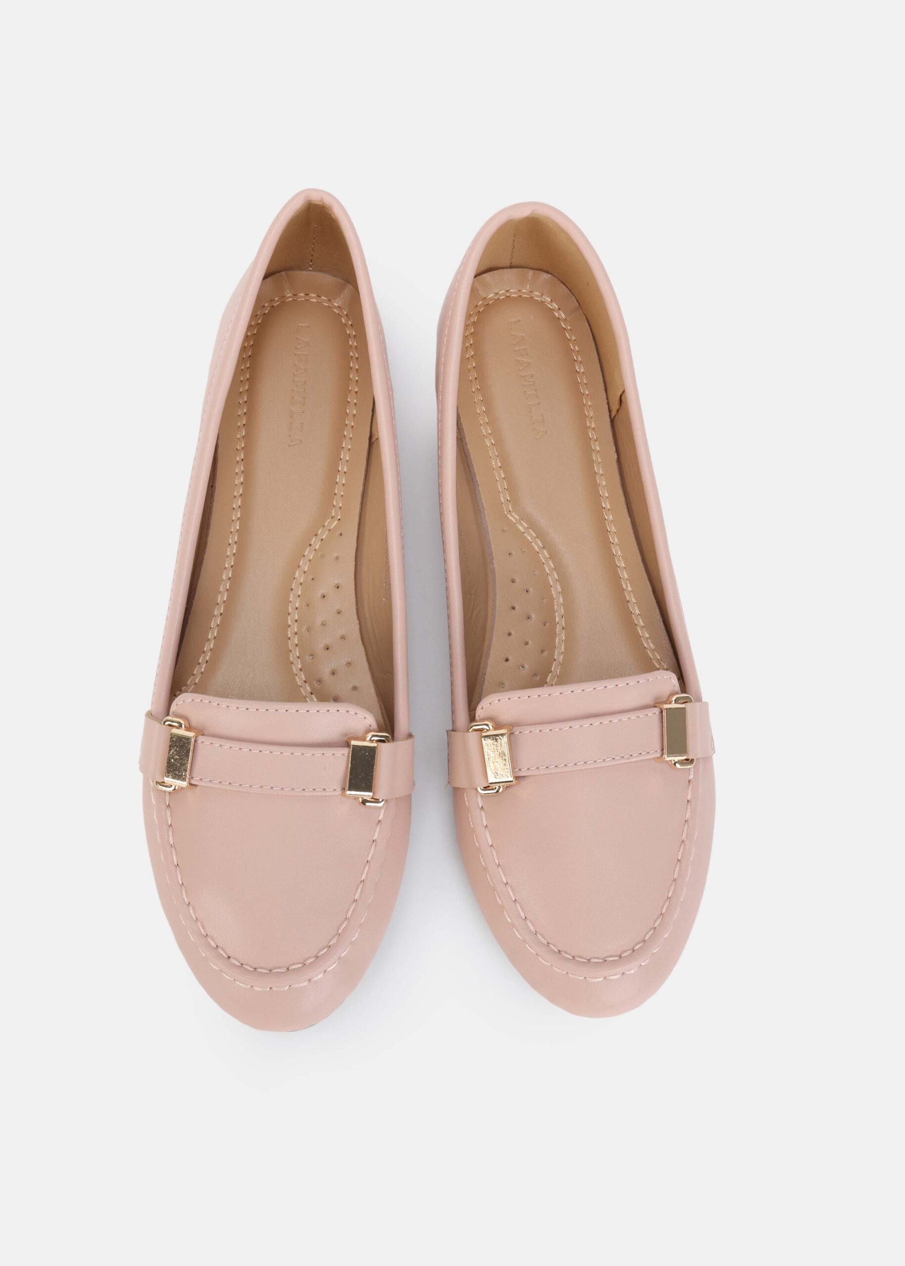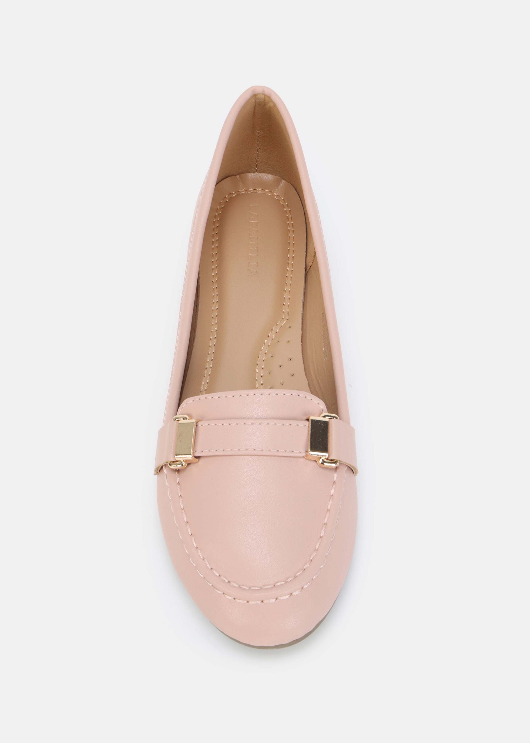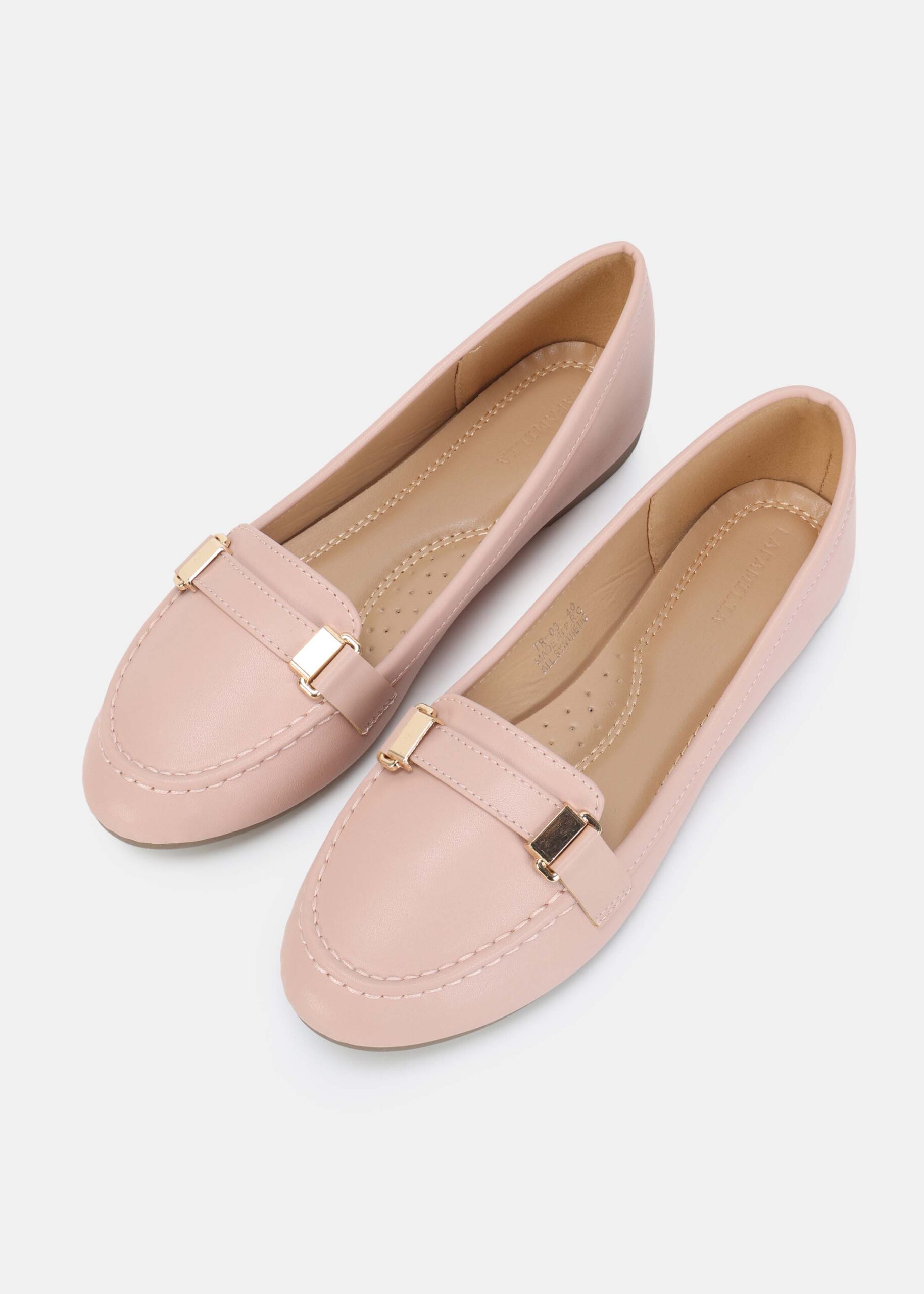 Women ballerina, leather, round toe, flat sole, upper strap decor with metal piece, unique and modern