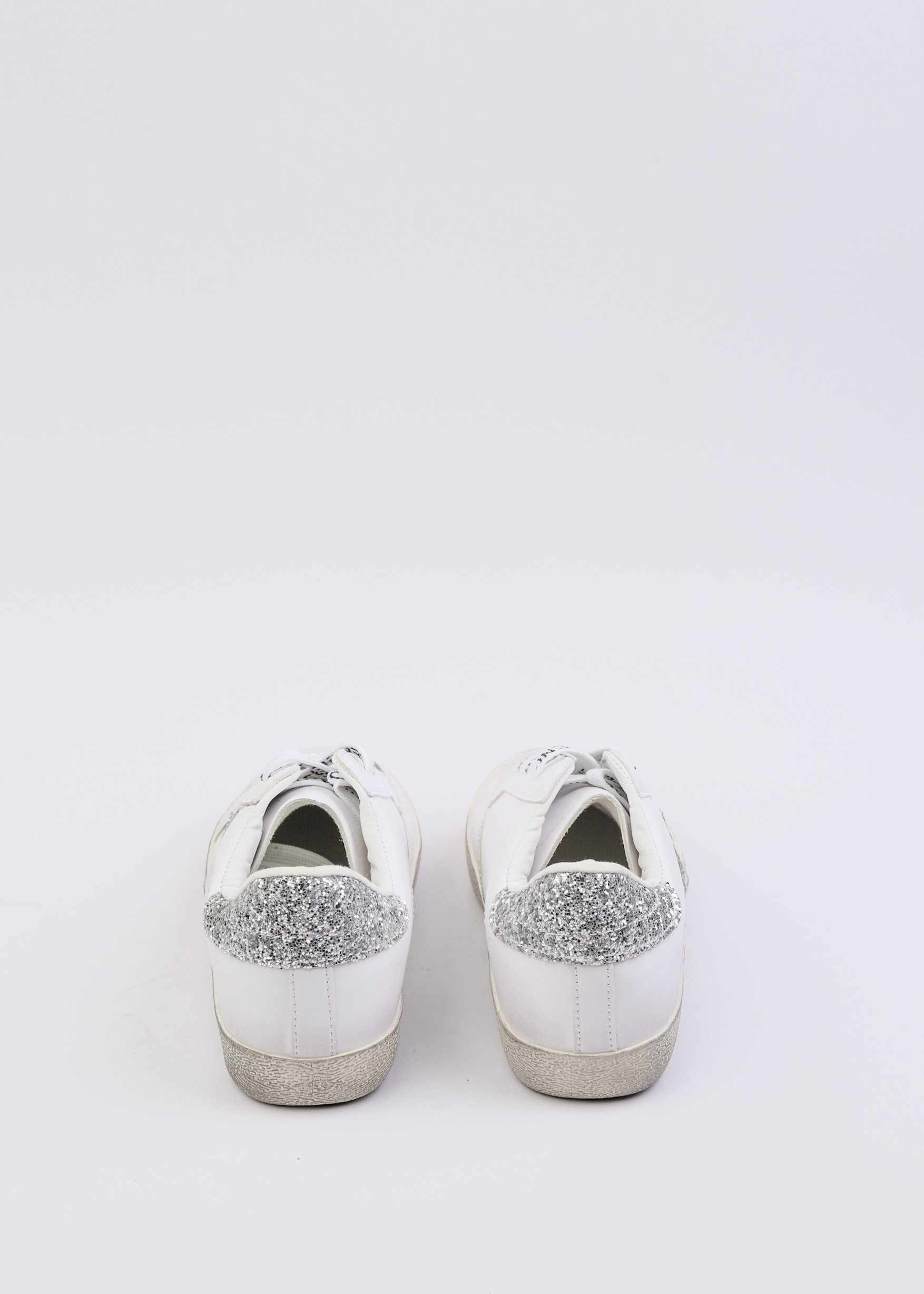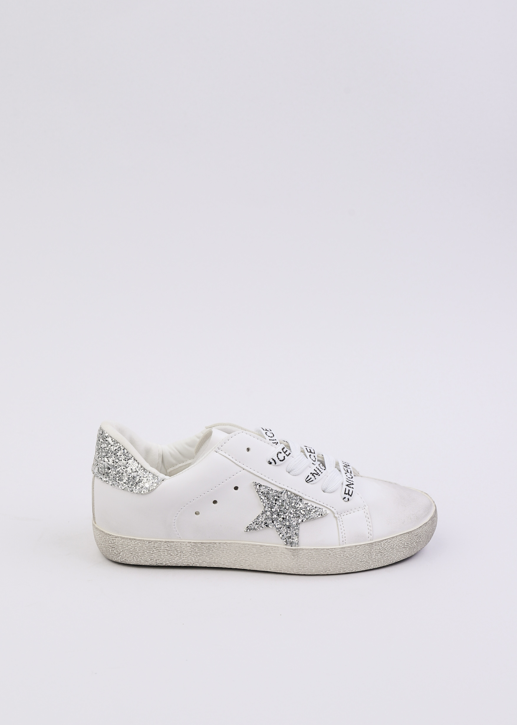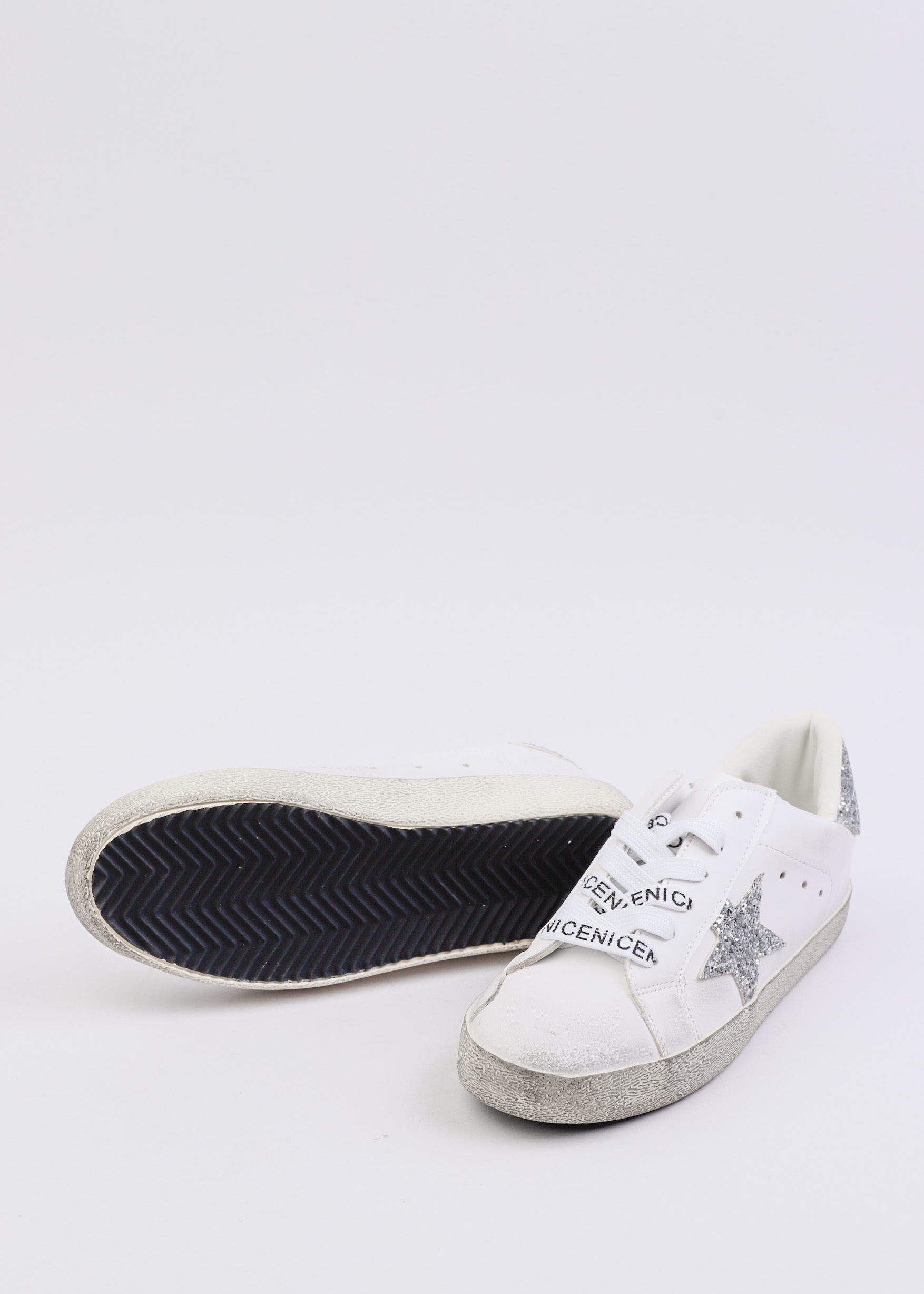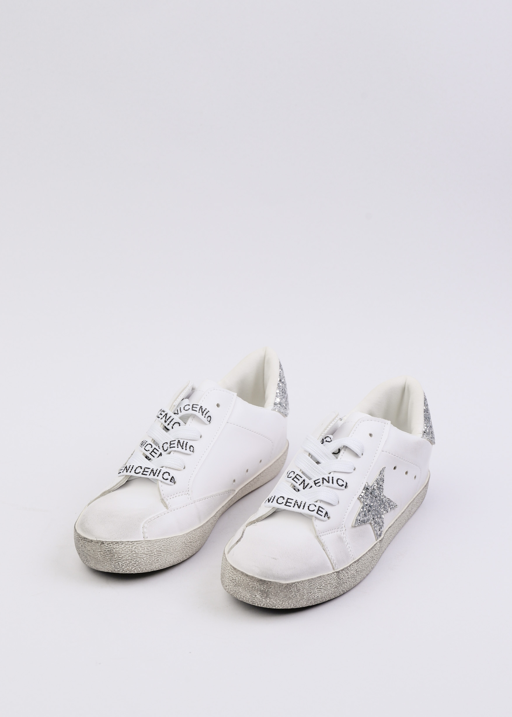 حذاء نسائي, رياضة, جلد, تصميم متسخ, مقدمة مدورة, نعل مطاطي, رباط أمامي مع كتابة مطبوعة, تصميم نجمة لامعة مطبوعة على الجانب, تصميم لامع من الخلف, عصري ومميز