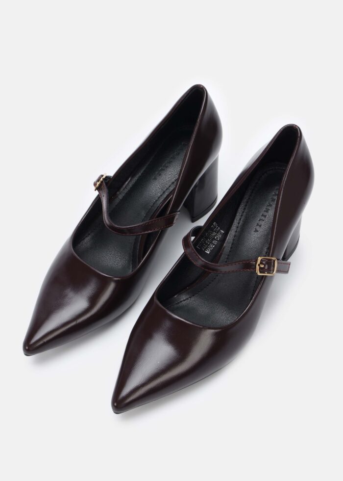 حذاء نسائي, جلد, كعب, مقدمة مدببة, حزام من الاعلى مع مشبك معدني من الجانب, انيق وعصري