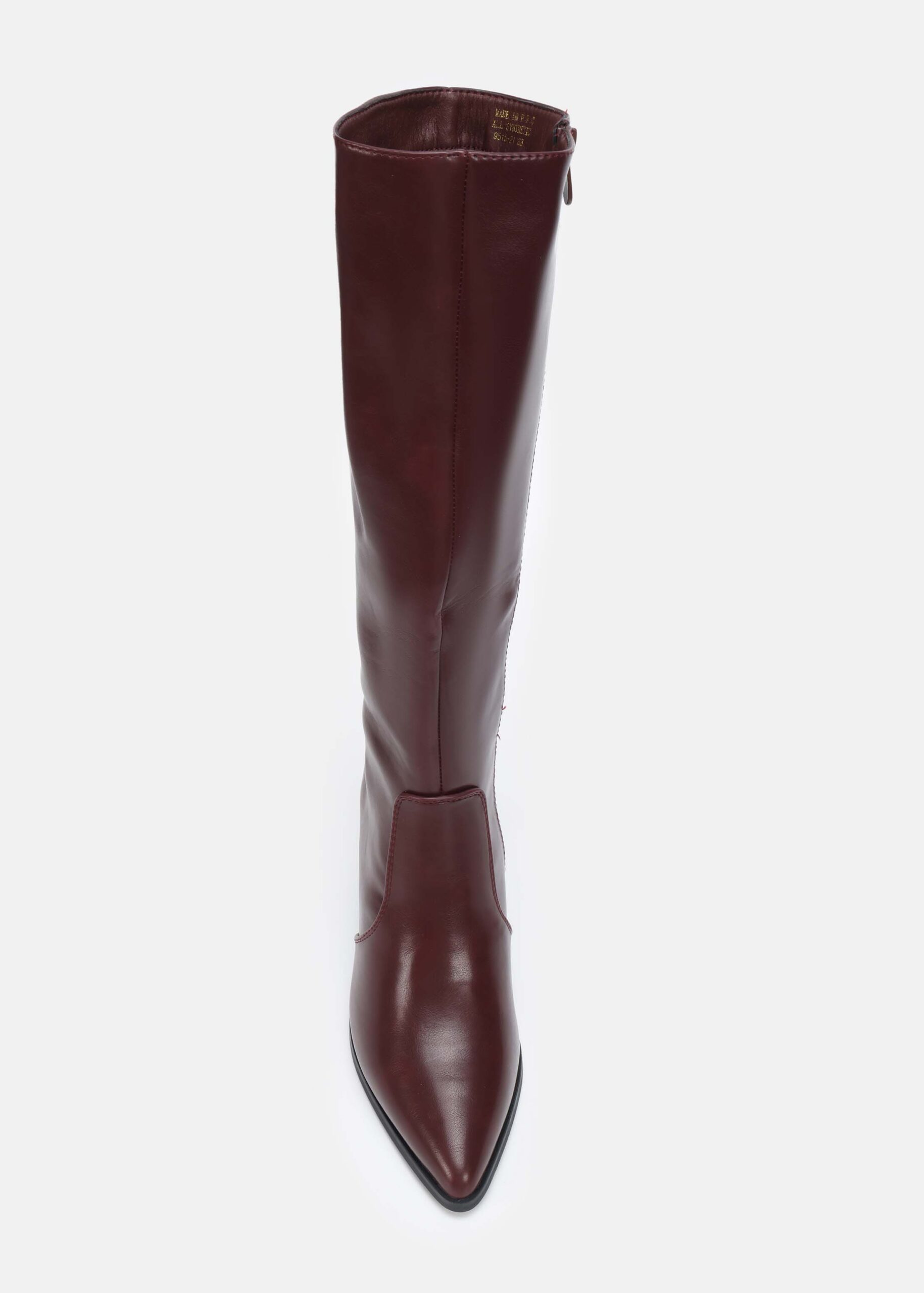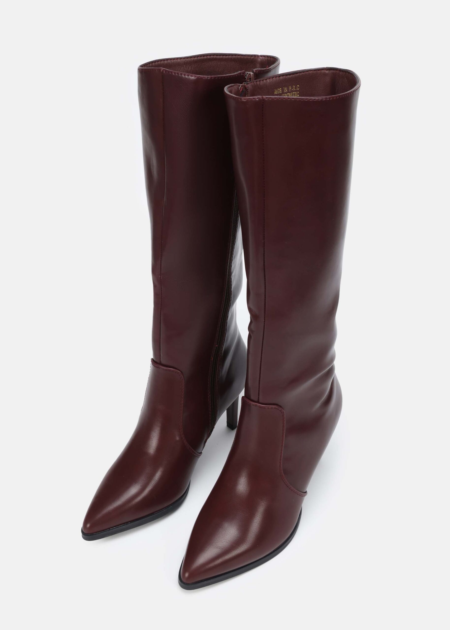 Women boots, leather, knee high, point toe, side zipper closure, heels, unique and modern