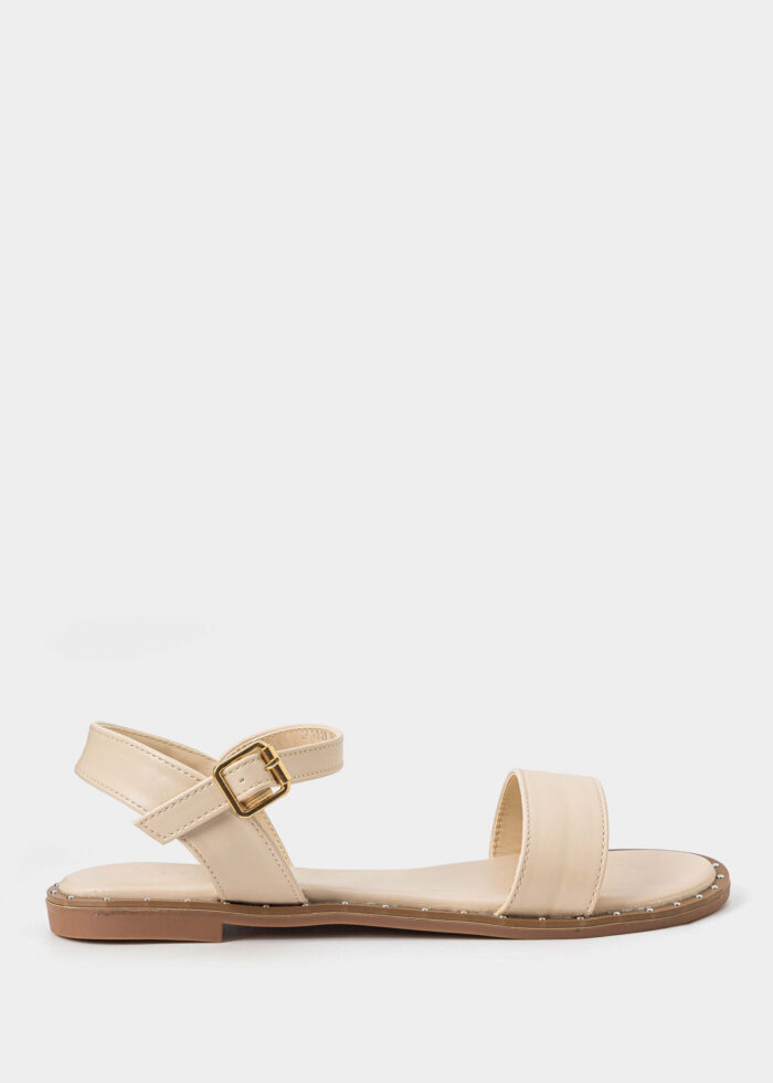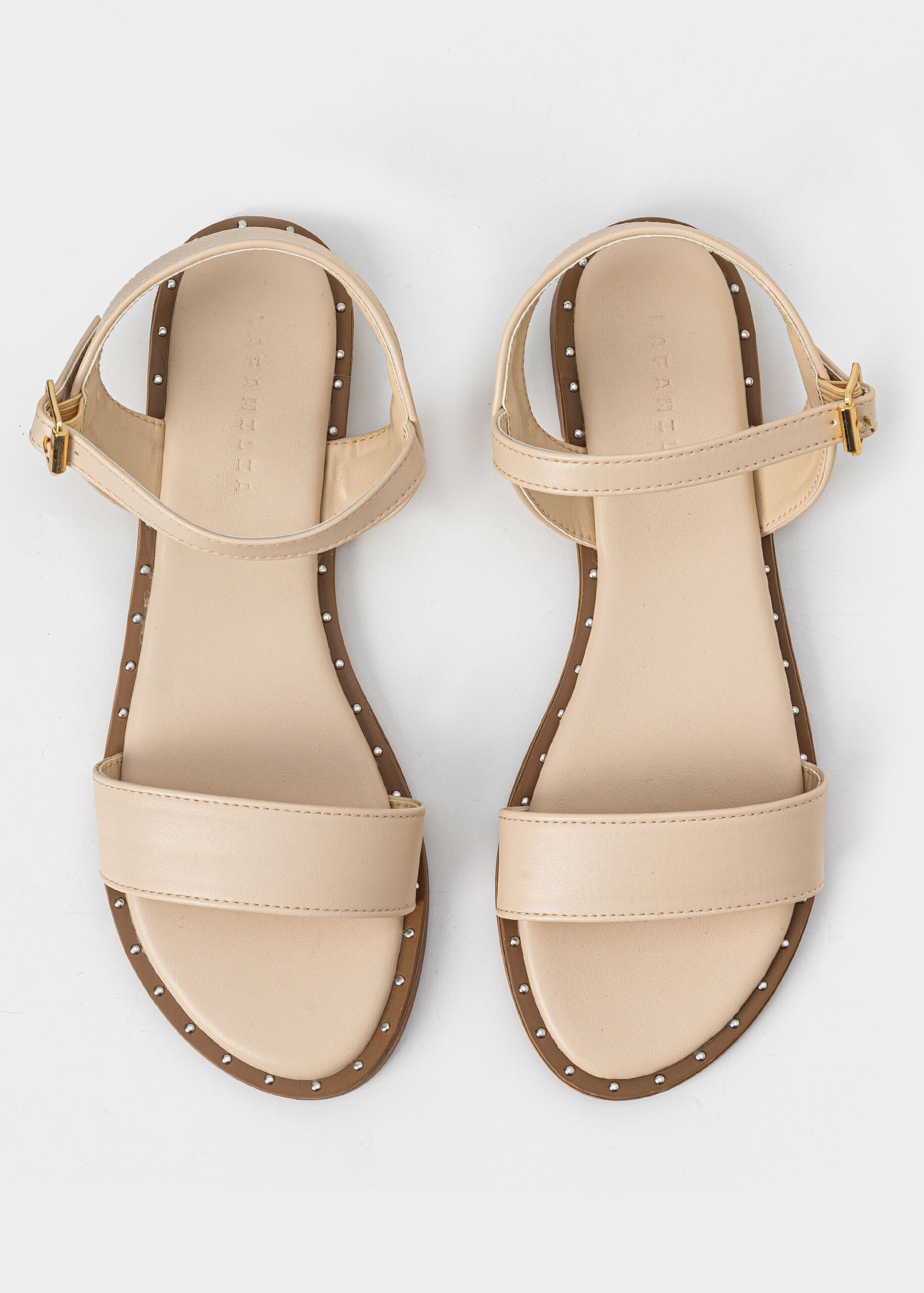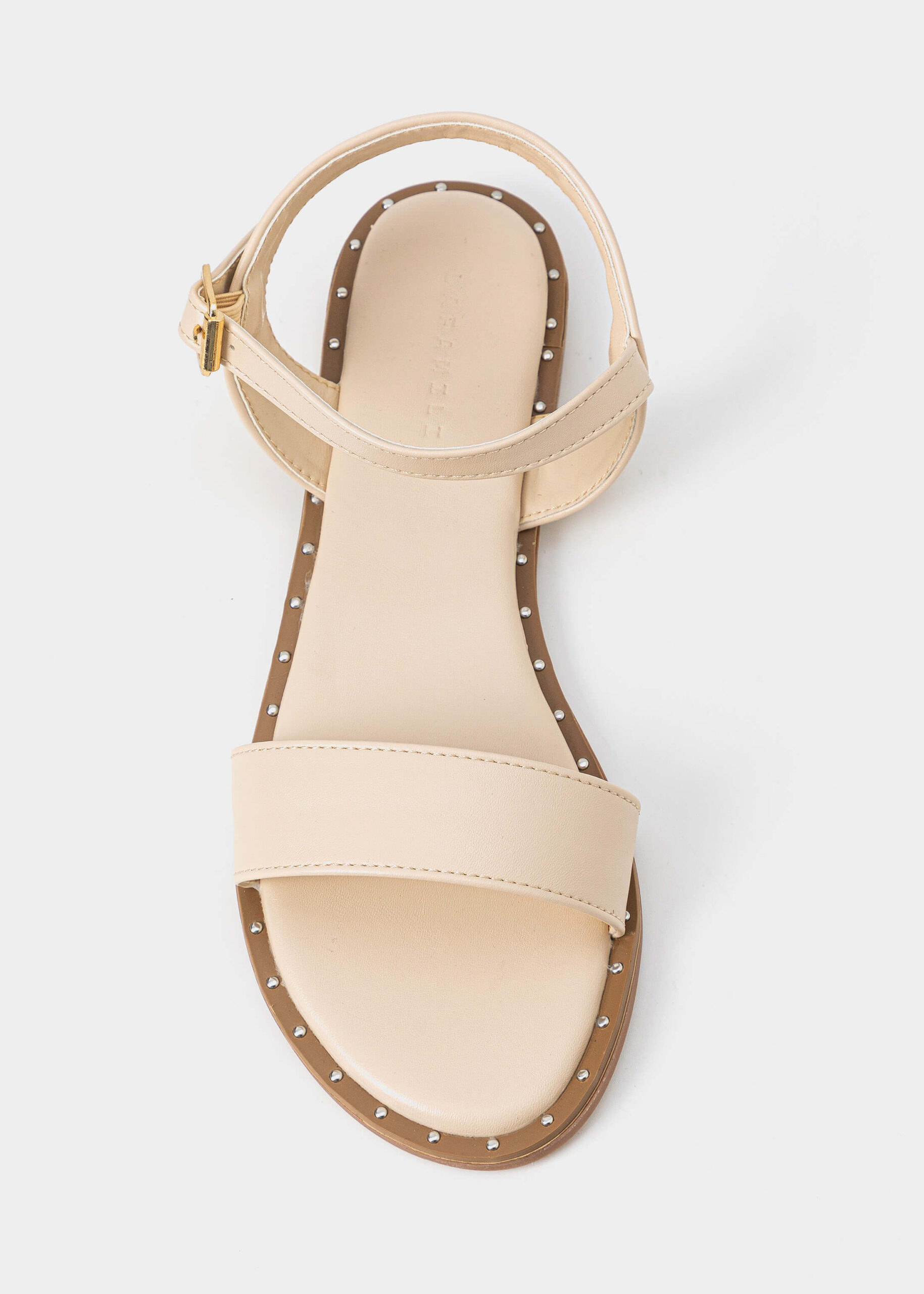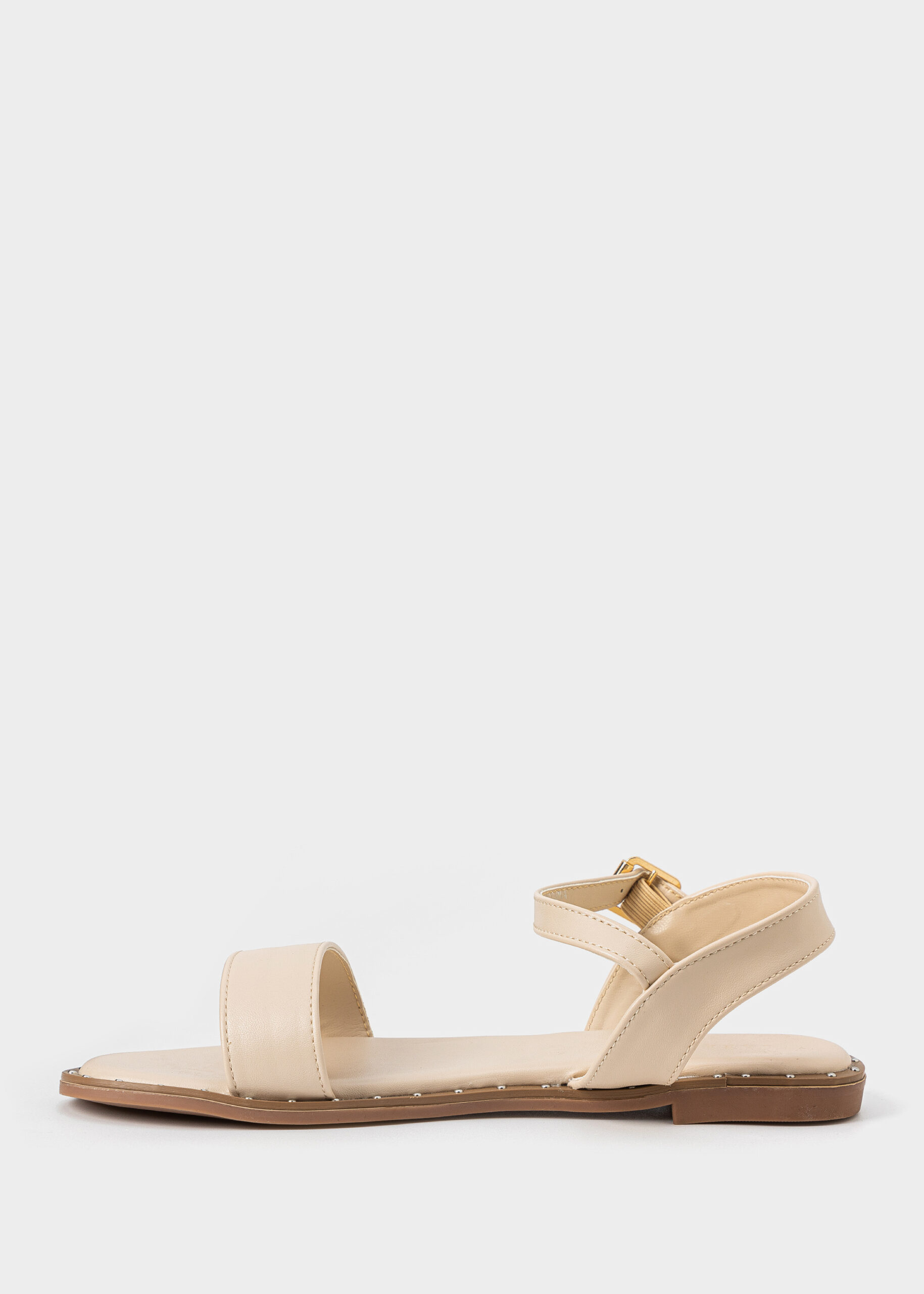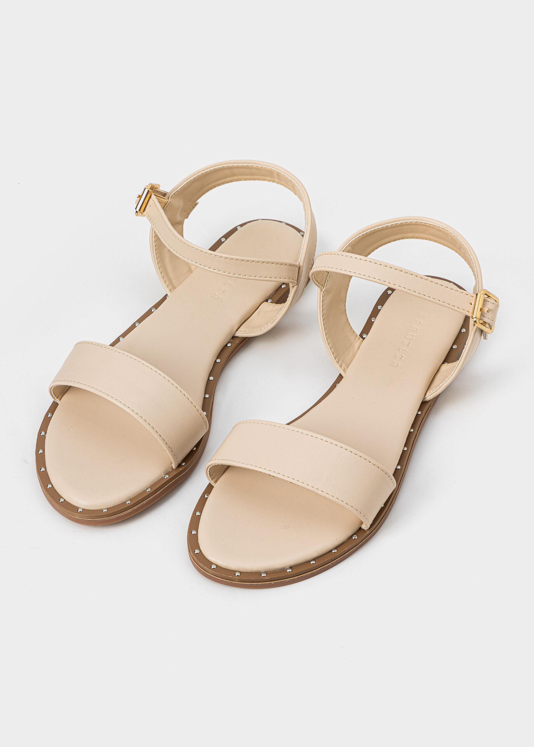 صندل نسائي, جلد, مسطح, مقدمة مدورة مفتوحة, شريط علوي, شريط كاحل مع مشبك للاغلاق, انيق ومريح
