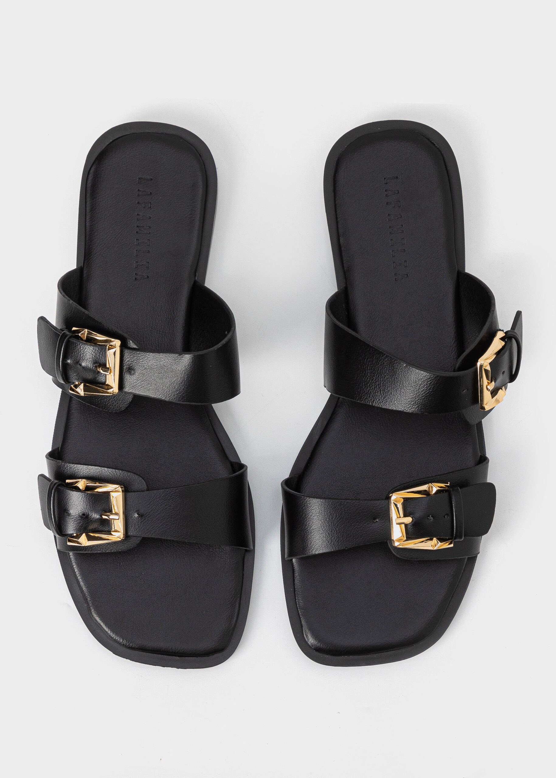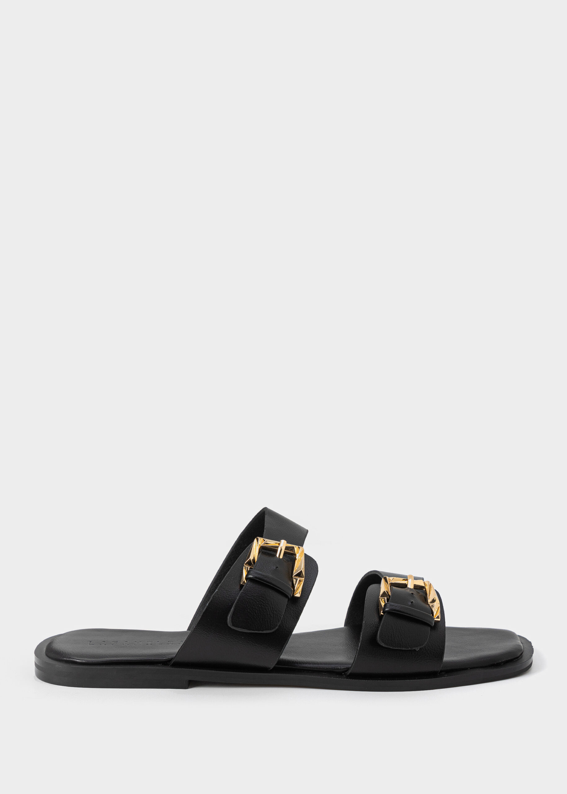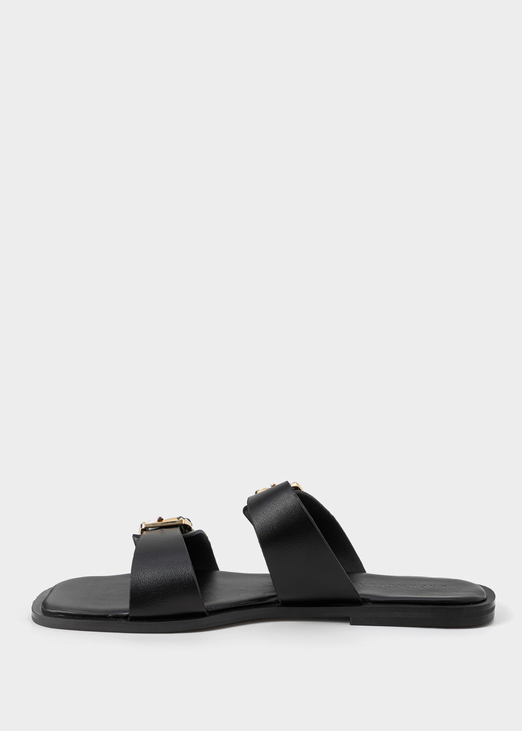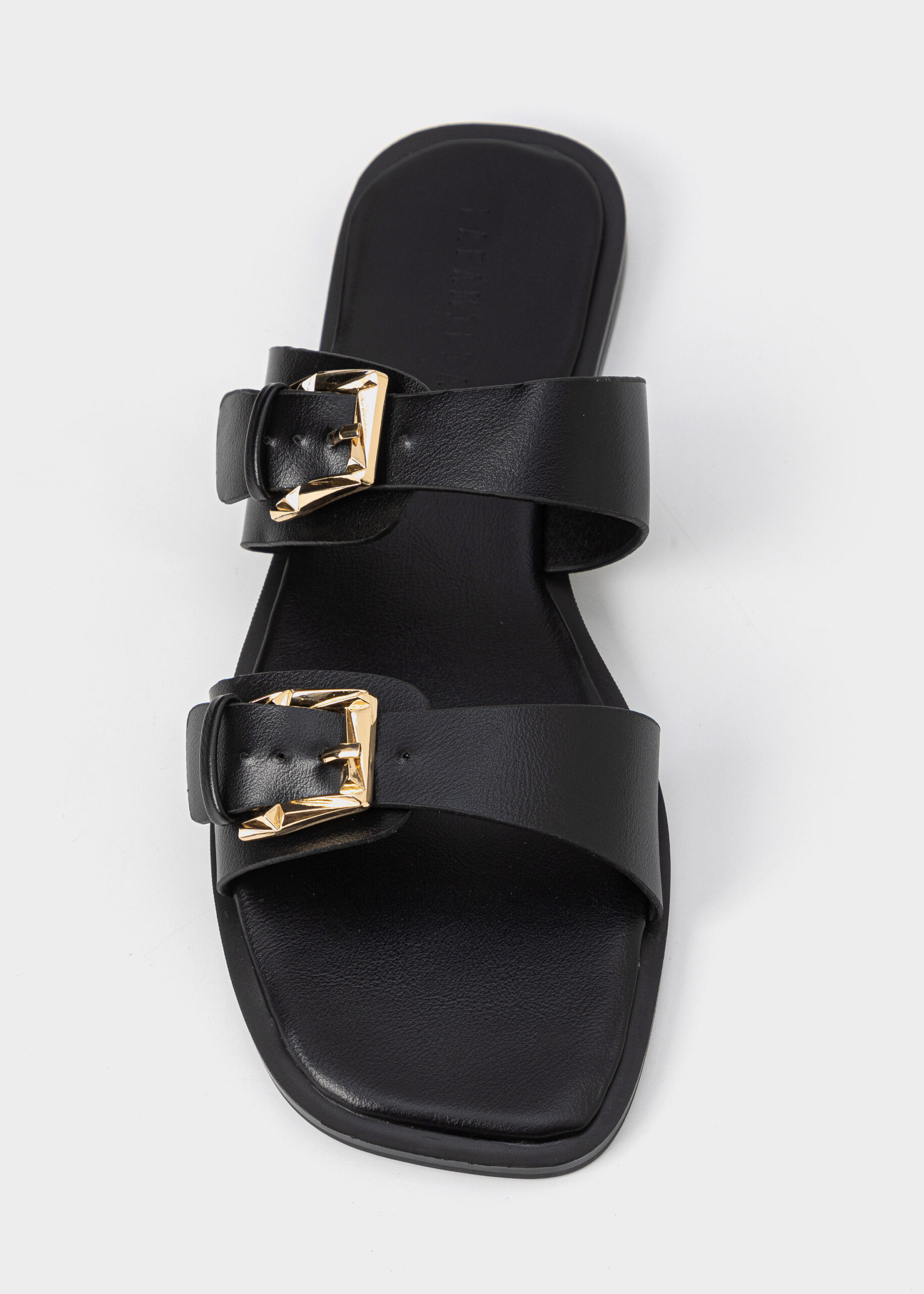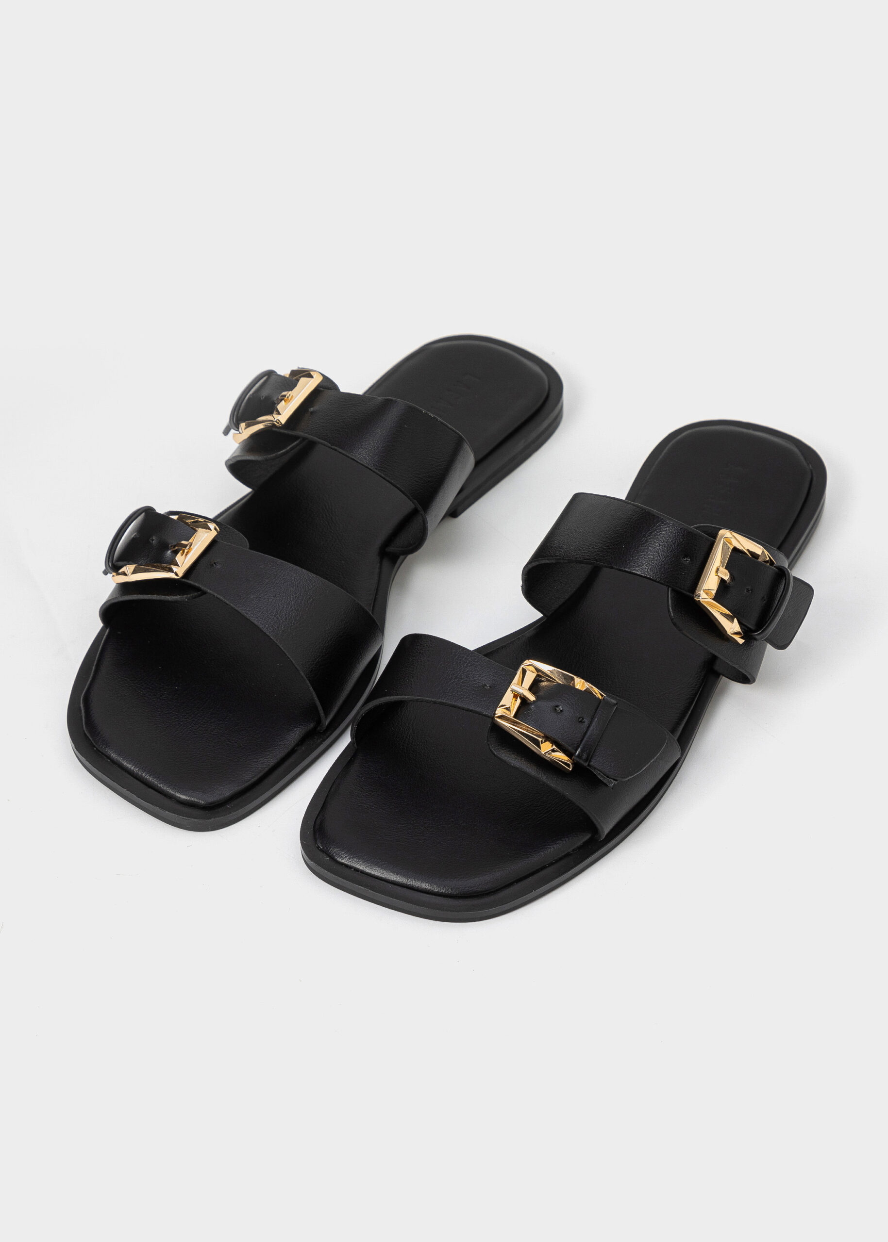سليبر نسائي, جلد, مسطح, احزمة علوية, مقدمة مربعة مفتوحة, انيق وعصري
