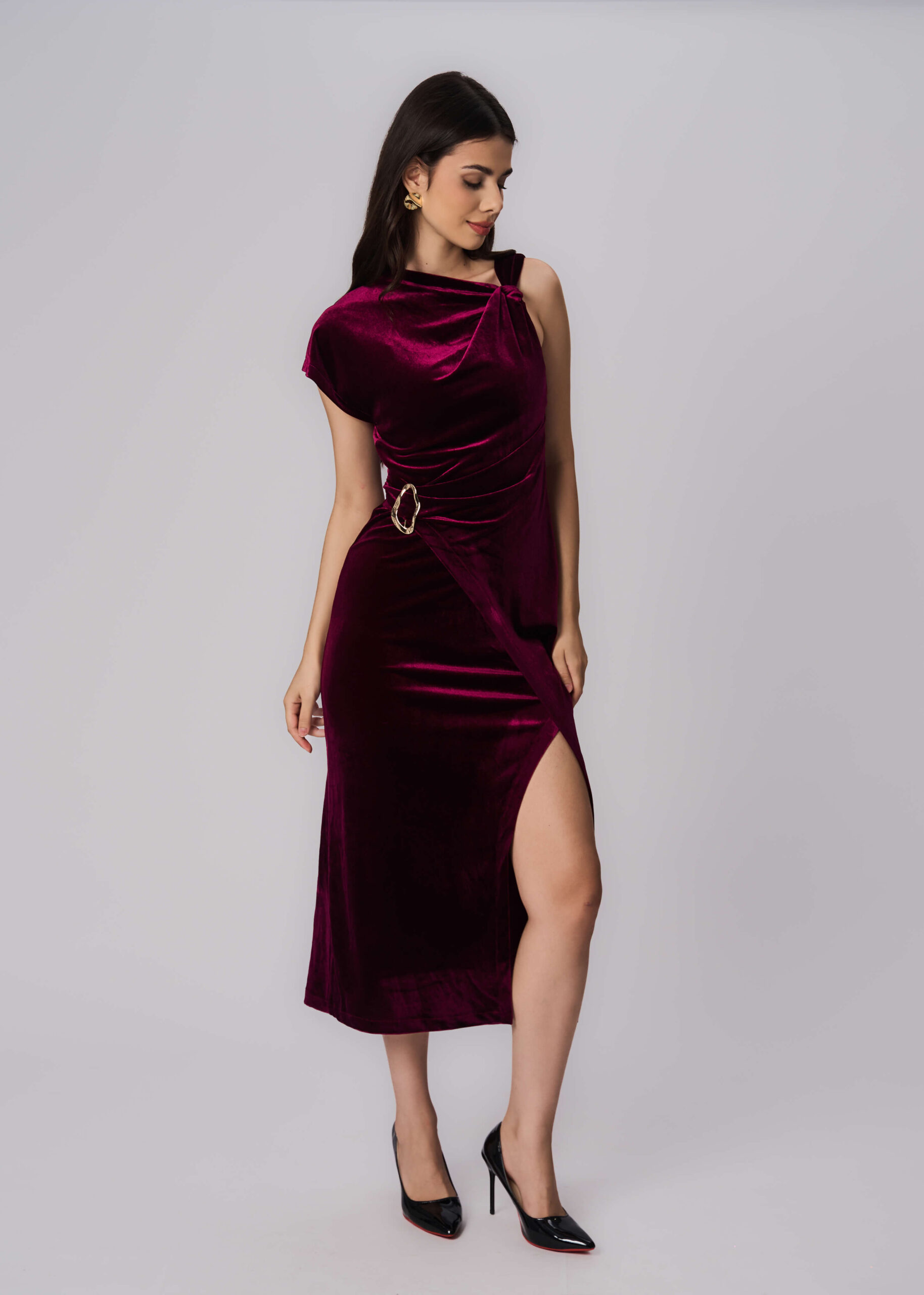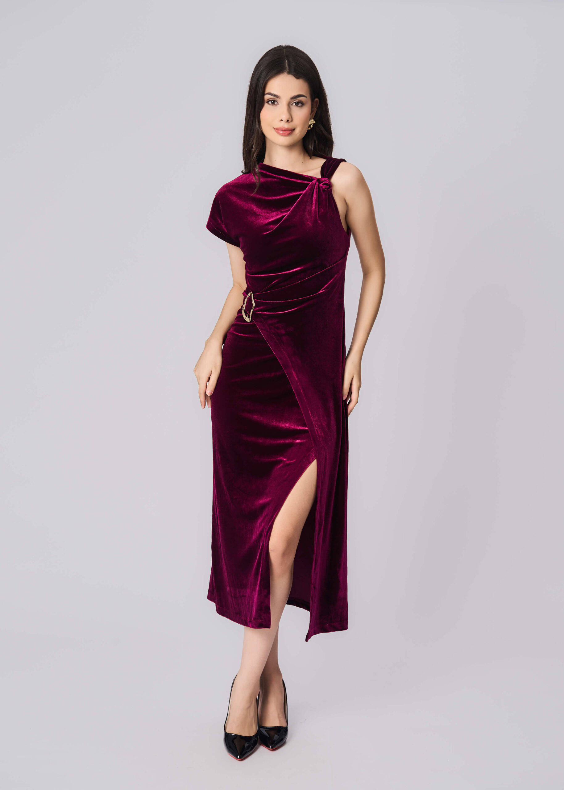 فستان نسائي, طويل, مخمل, بدون اكمام, ياقة مع تصميم عقدة جانبية, تصميم ملتف مزين بمشبك من الجانب, سحاب من الخلف للاغلاق, فتحة من الامام, انيق وعصري