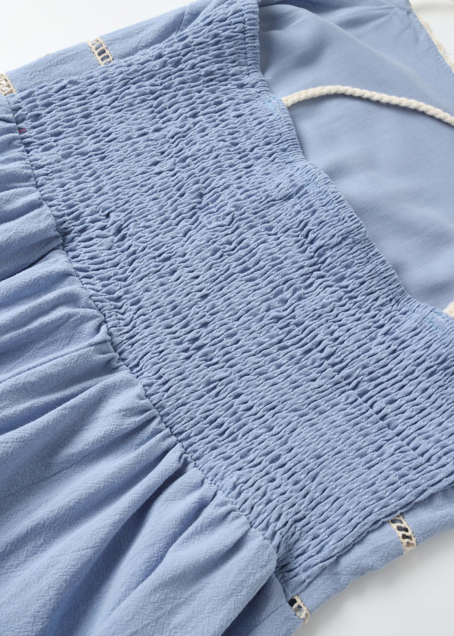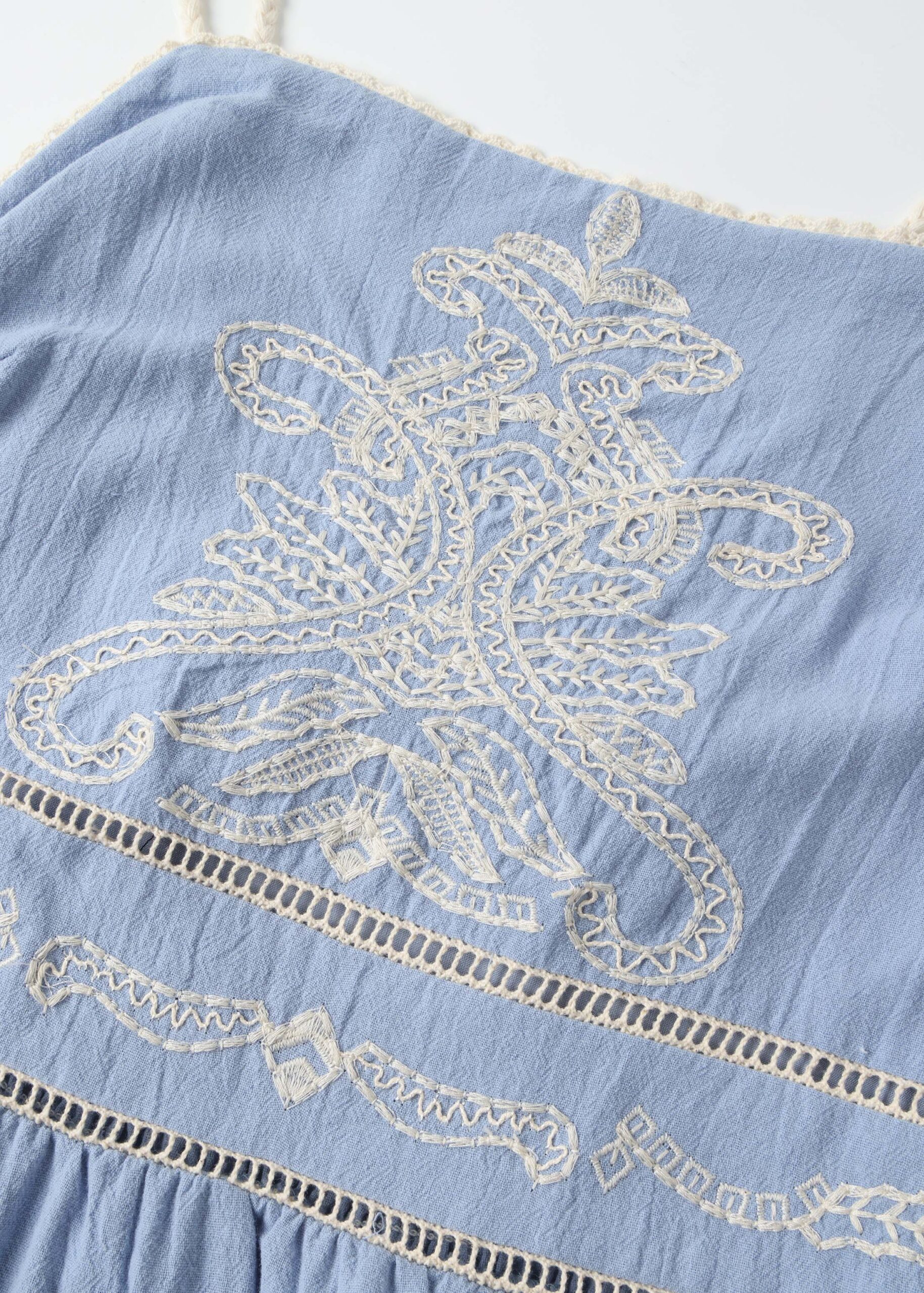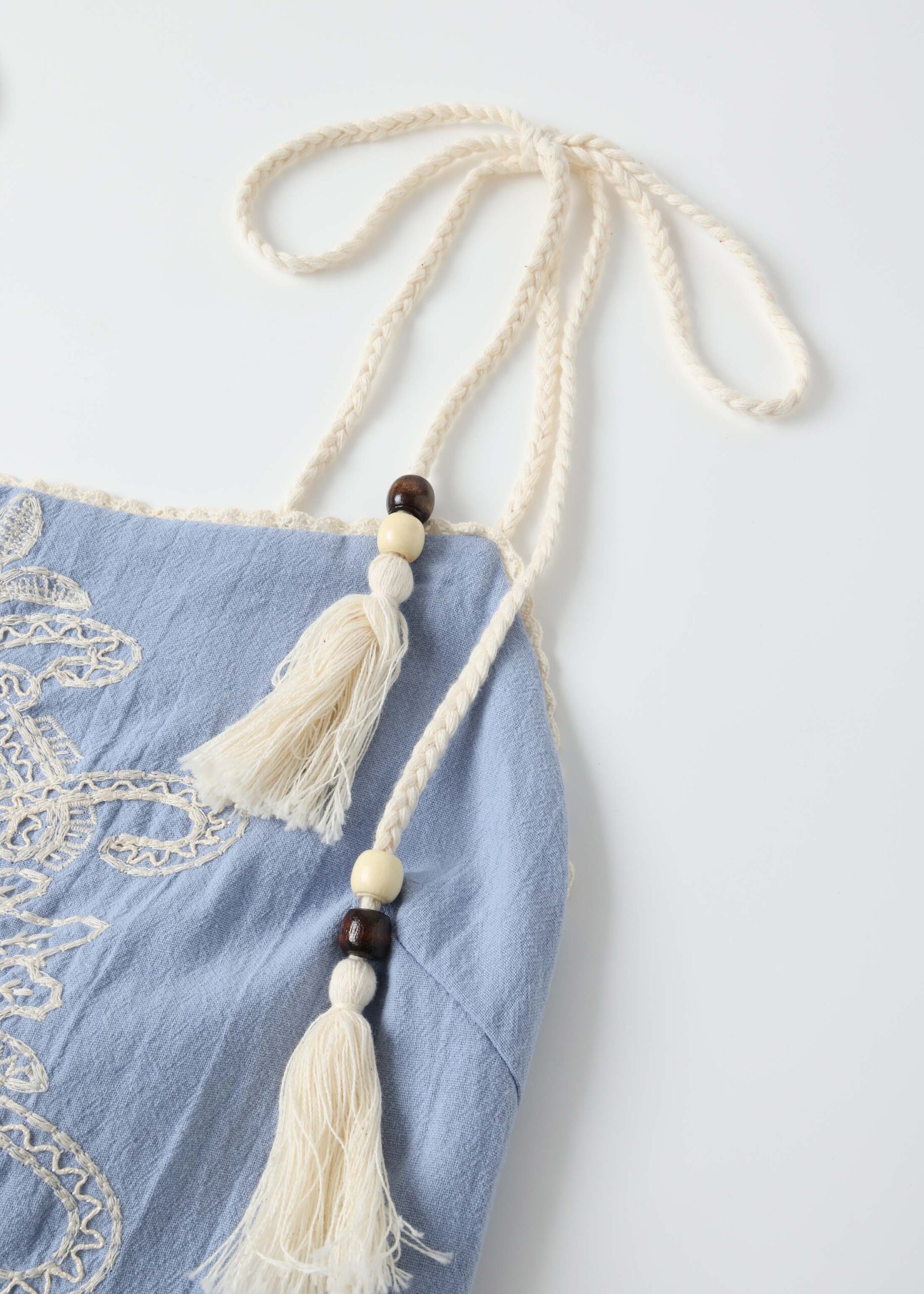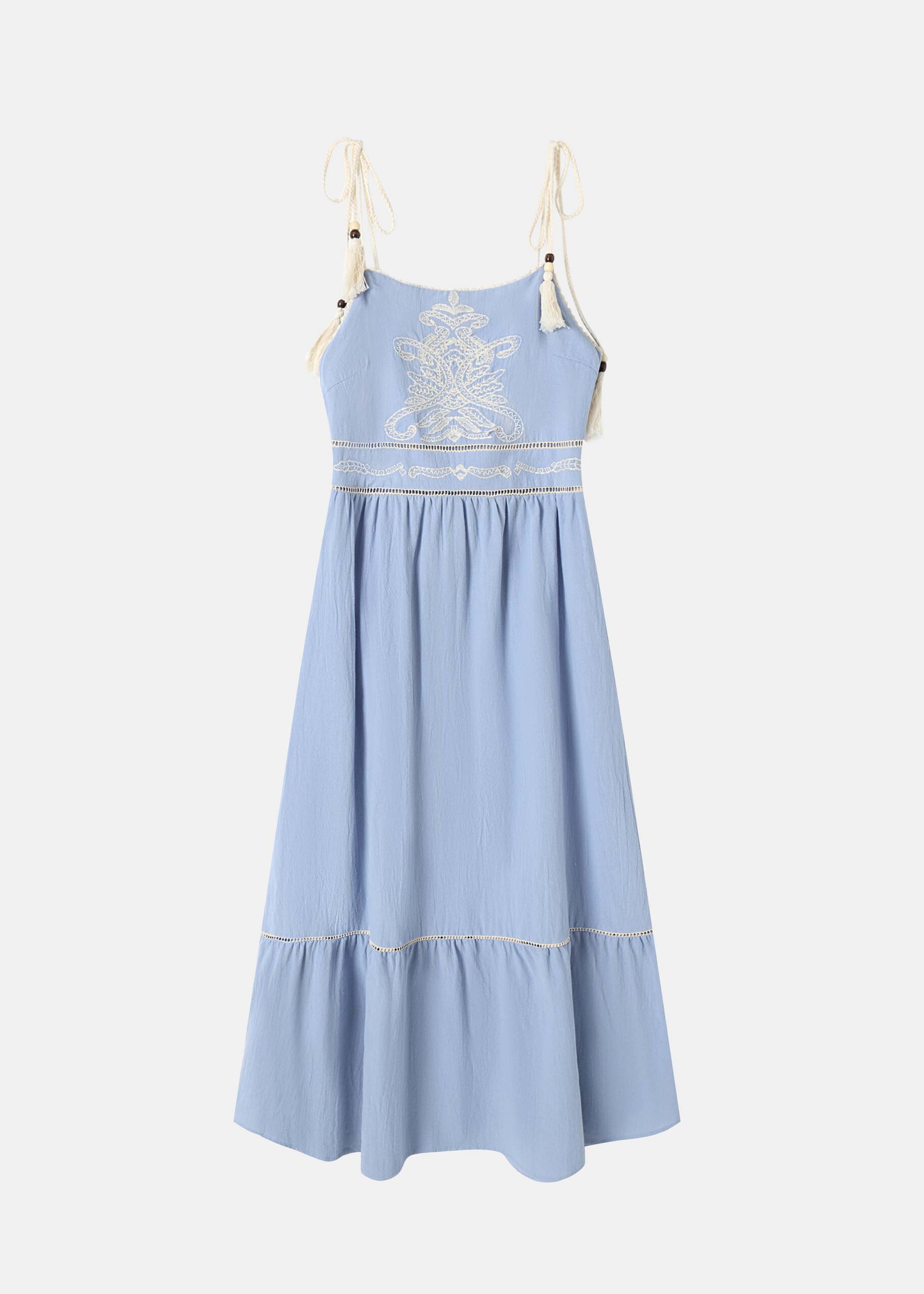Women dress, maxi, eyelet embroidery decor, tie-shoulder straps with tassel decor, elastic back, unique and modern