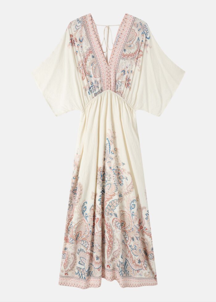 فستان نسائي, طويل, ياقة سبعة, اكمام واسعة بتصميم كيمونو, خصر مطاطي مرتفع, ربطة ياقة من الخلف, معرق بتصميم paisly, انيق وعصري