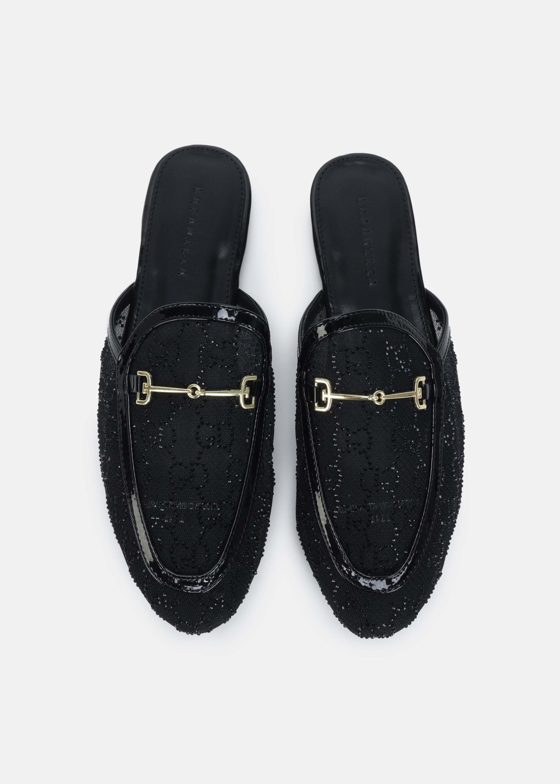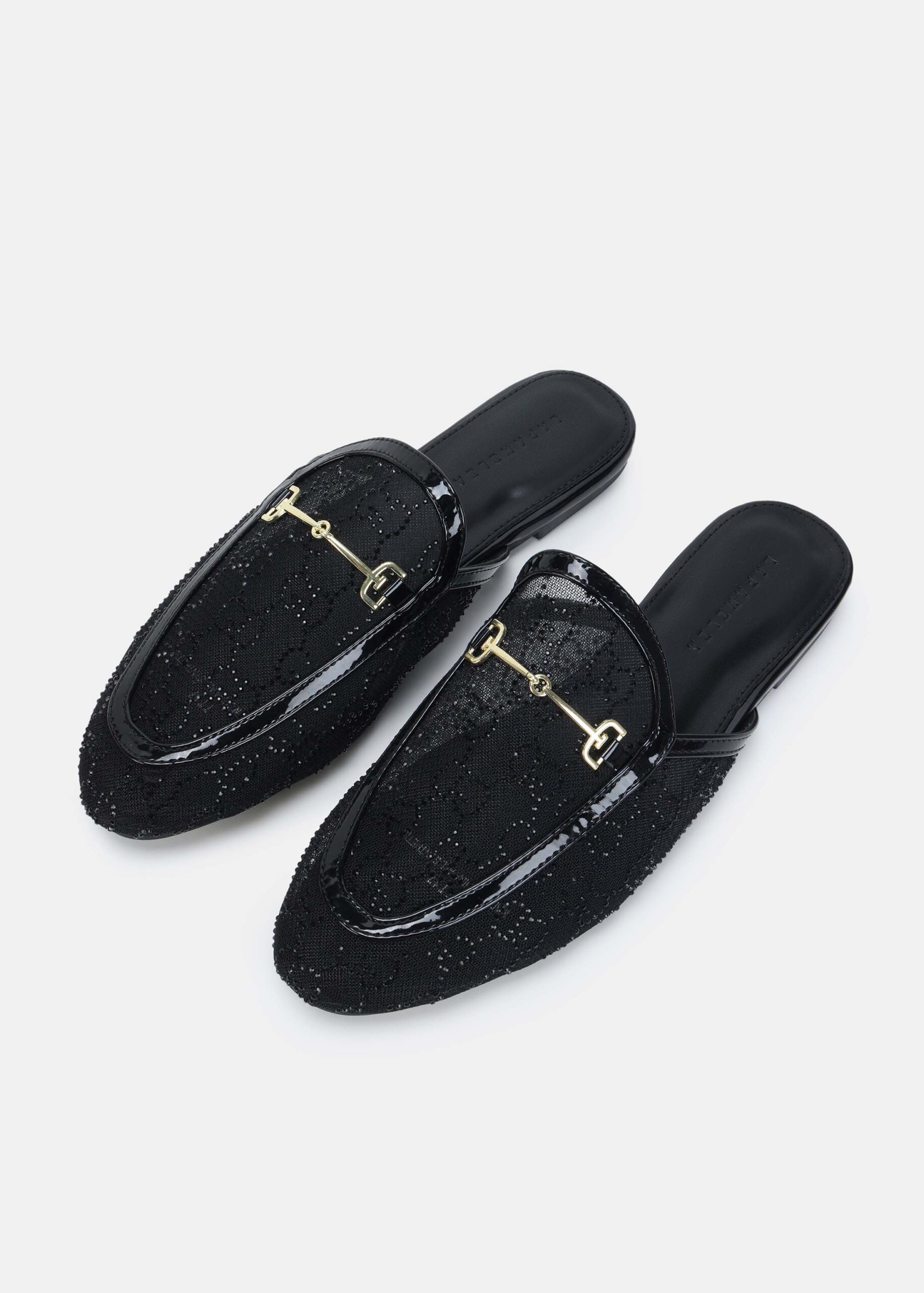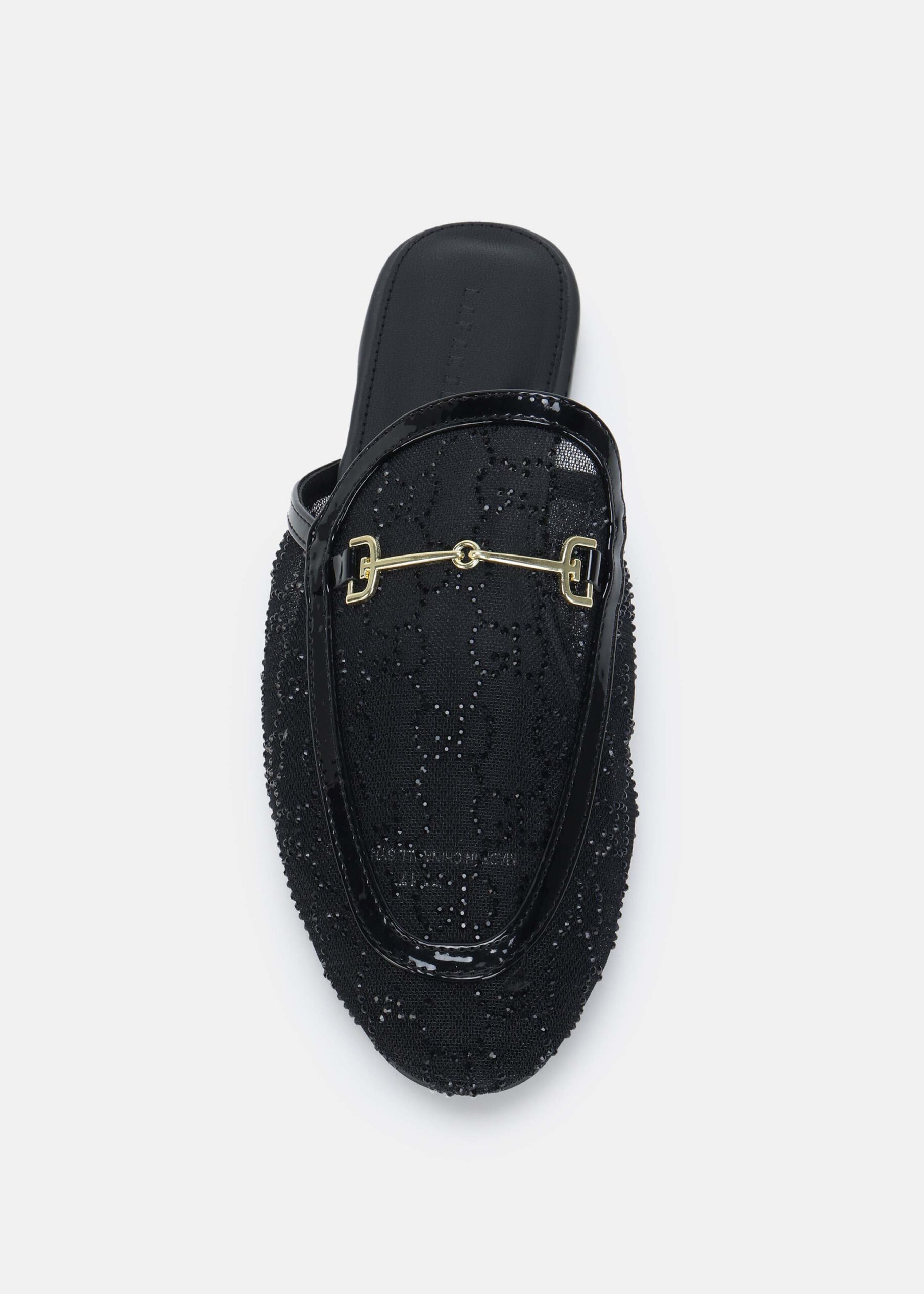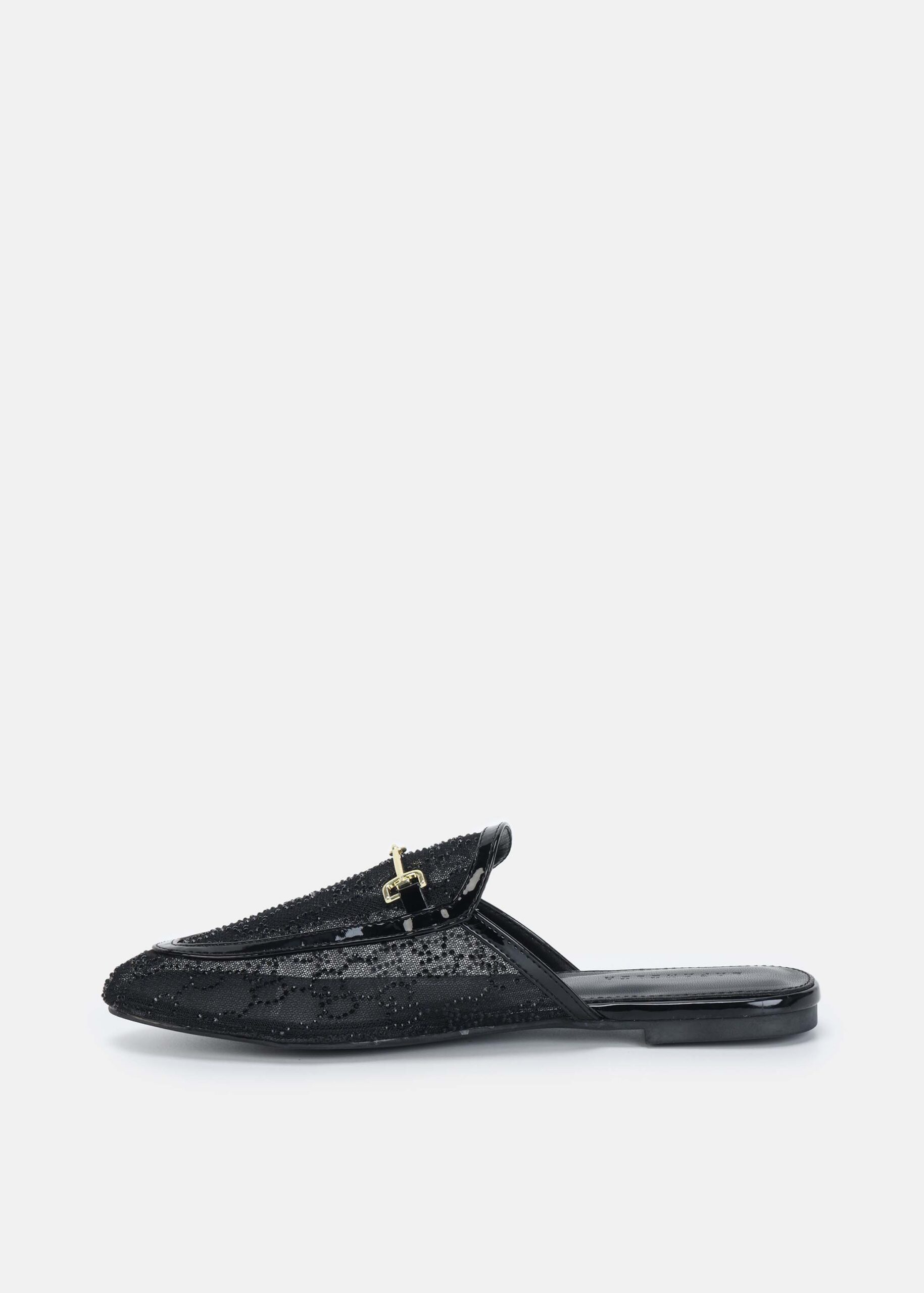 سليبر نسائي, نسيج شبكي مزين بالستراس, مقدمة مدورة, نعل مسطح, مزين بسلسلة معدنية من الاعلى, انيق وعصري