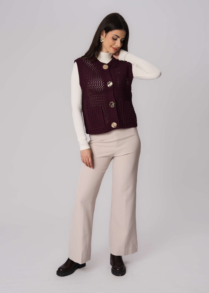 فيست نسائي, نسيج شبكي محبوك, ياقة مدورة, ازرار من الامام للاغلاق, بدون اكمام, جيوب من الامام, انيق وعصري