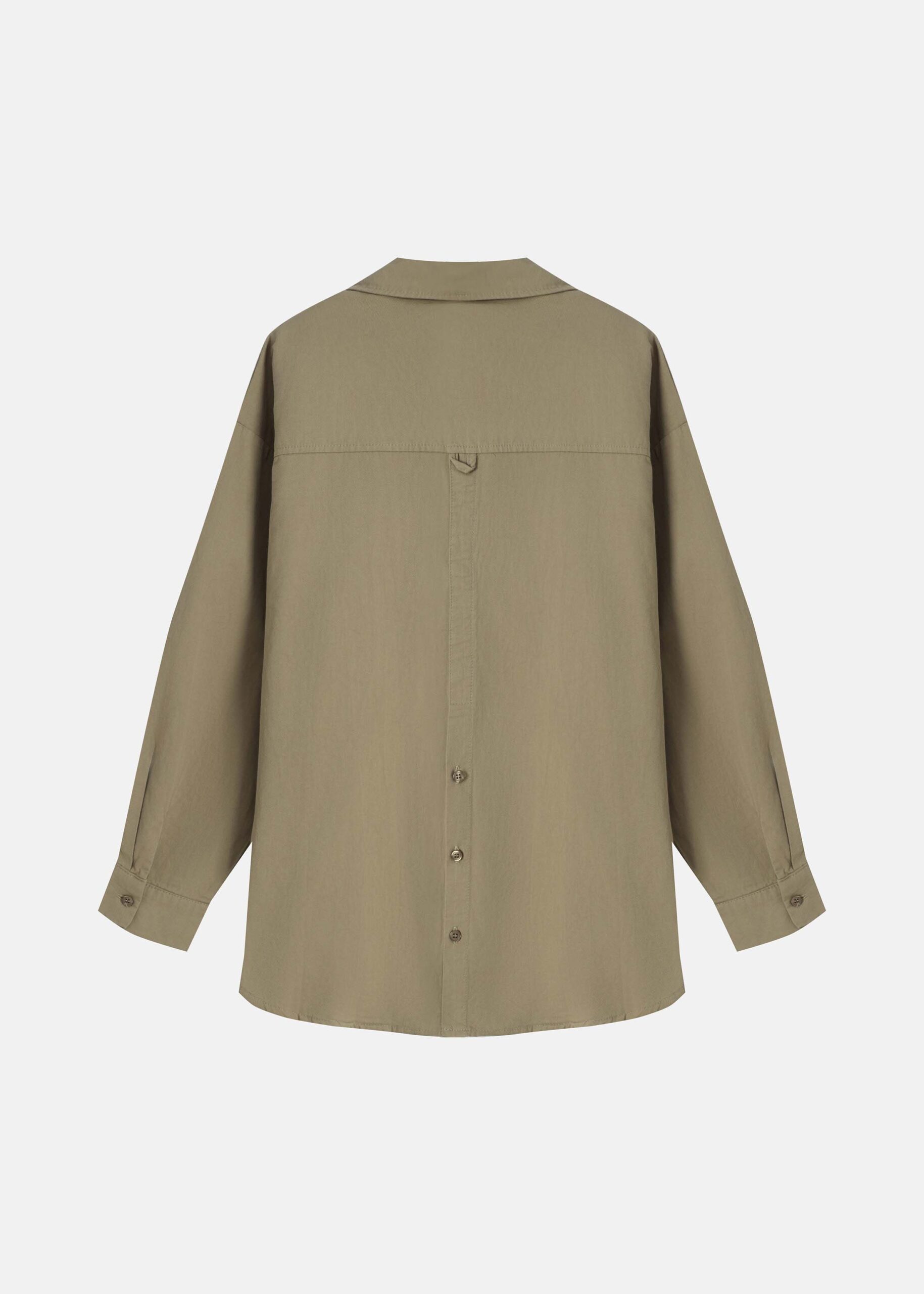 Women shirt, over-sized, plain, rolled collar, front buttons to close, long sleeves with tight cuff, back buttons decor, unique and practical