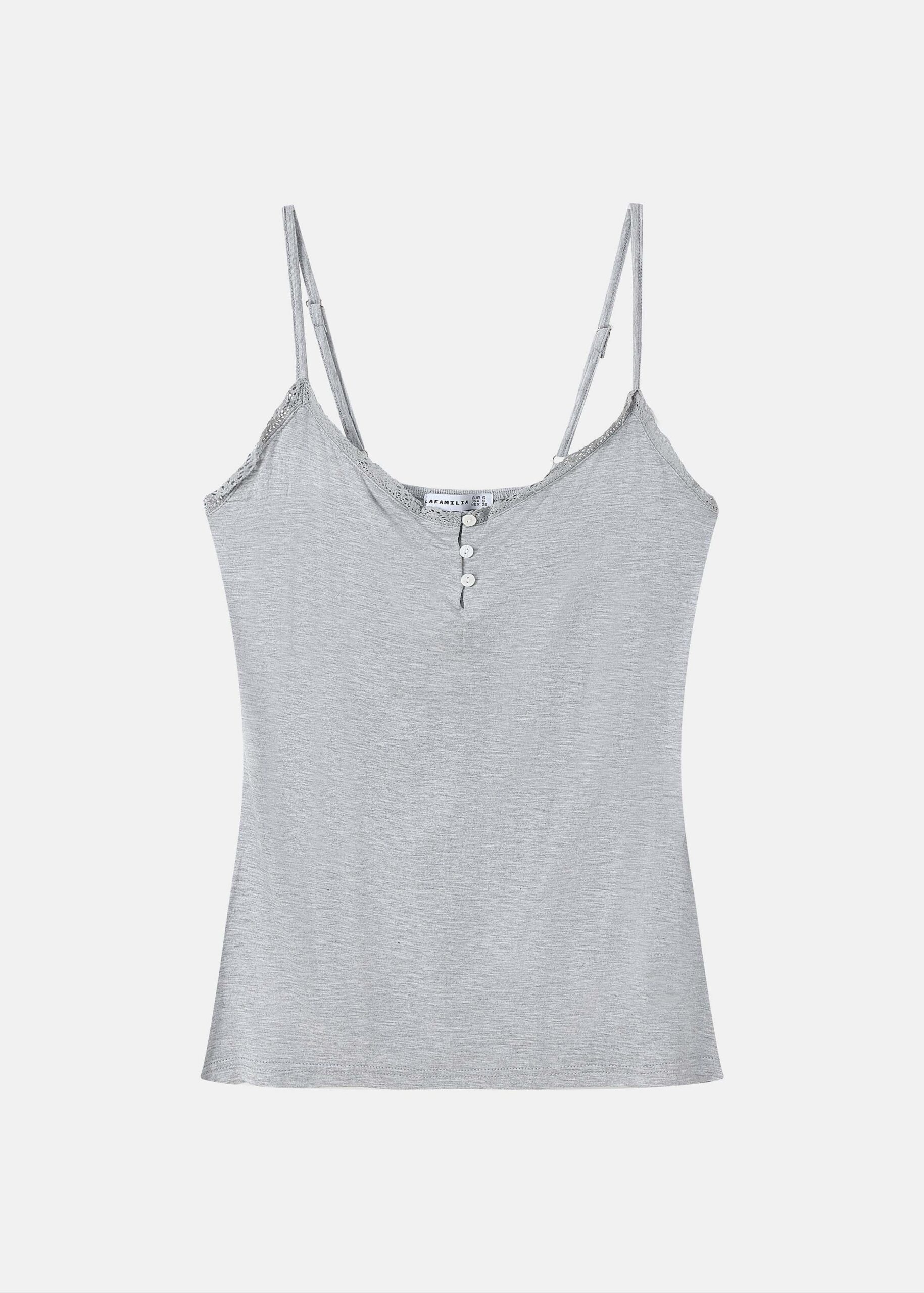 Women pajama, two-pieces, top, sleeveless, V neck with front fake buttons, lace detail, trouser, elastic waist, comfortable and practical