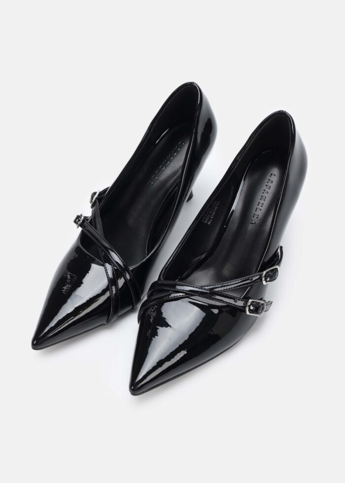 حذاء نسائي, جلد لامع, كعب عالي رفيع, مقدمة مدببة, مزين باحزمة من الاعلى, انيق وعصري