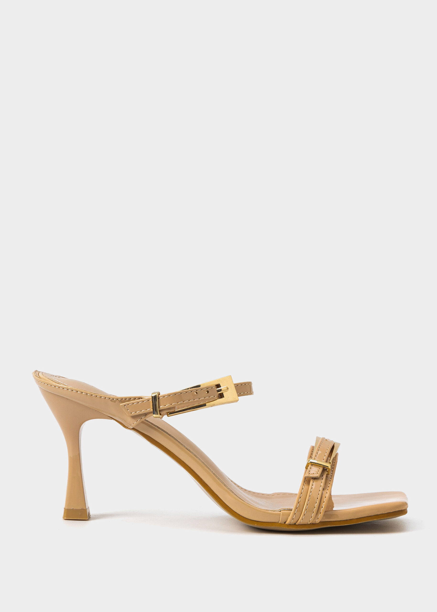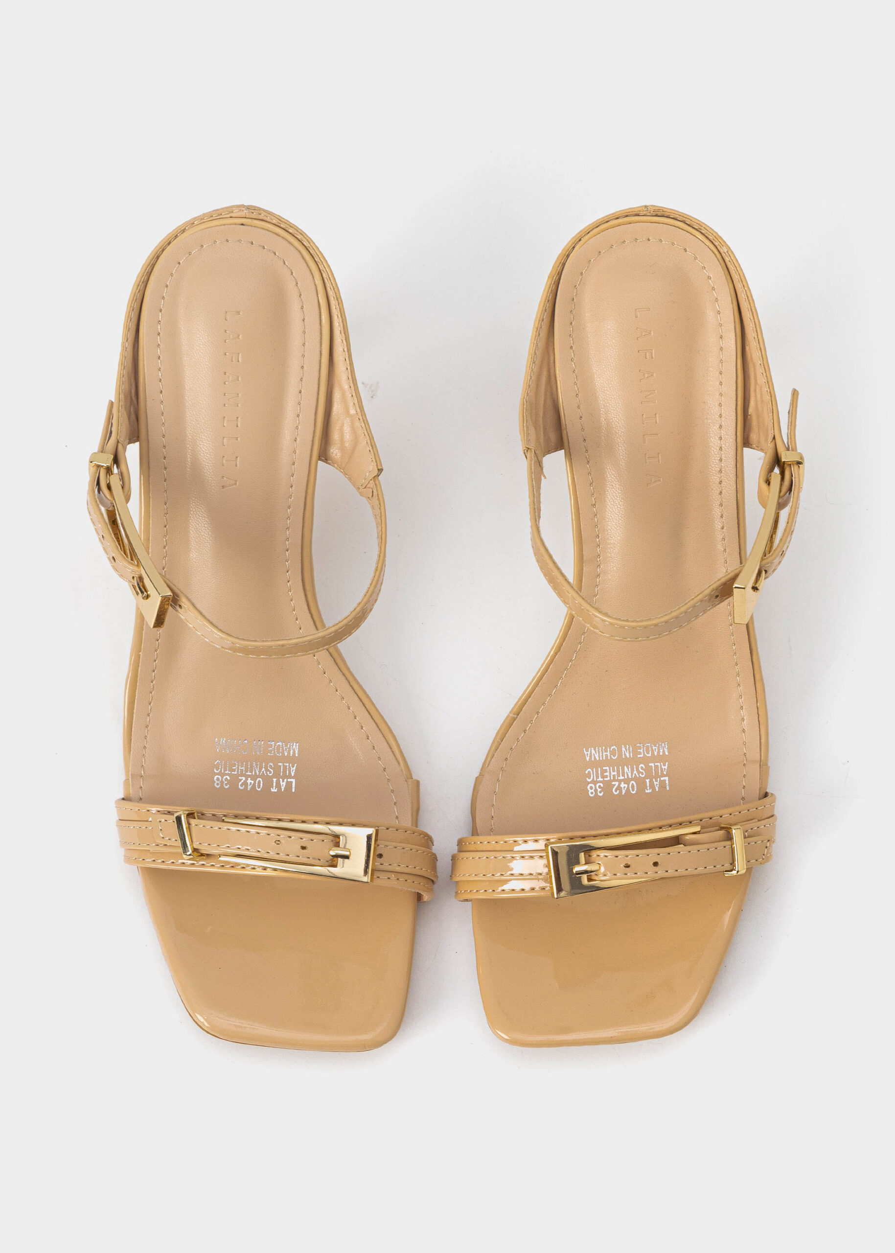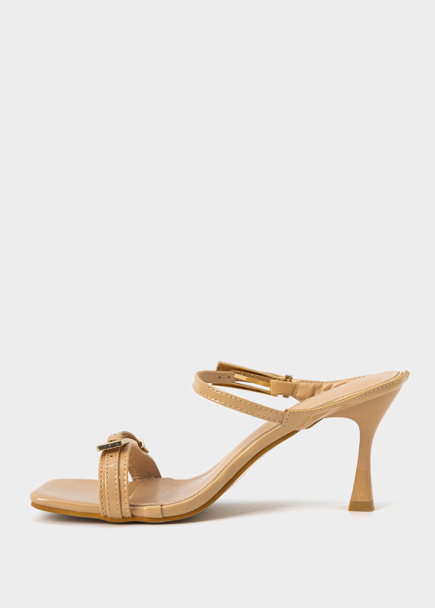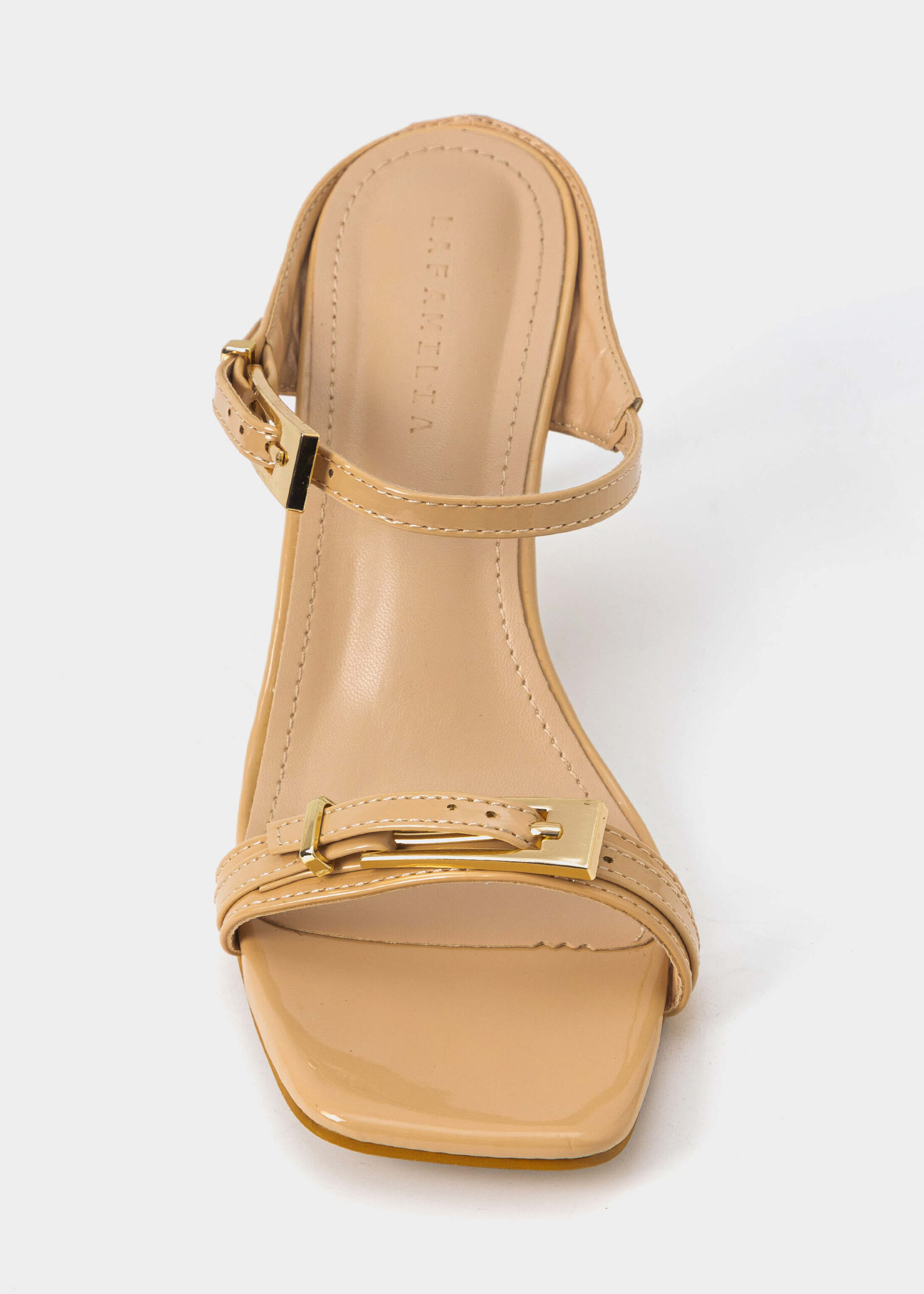 سليبر نسائي, جلد لامع, كعب, مقدمة مربعة مفتوحة, مزين باحزمة من الاعلى. انيق وعصري