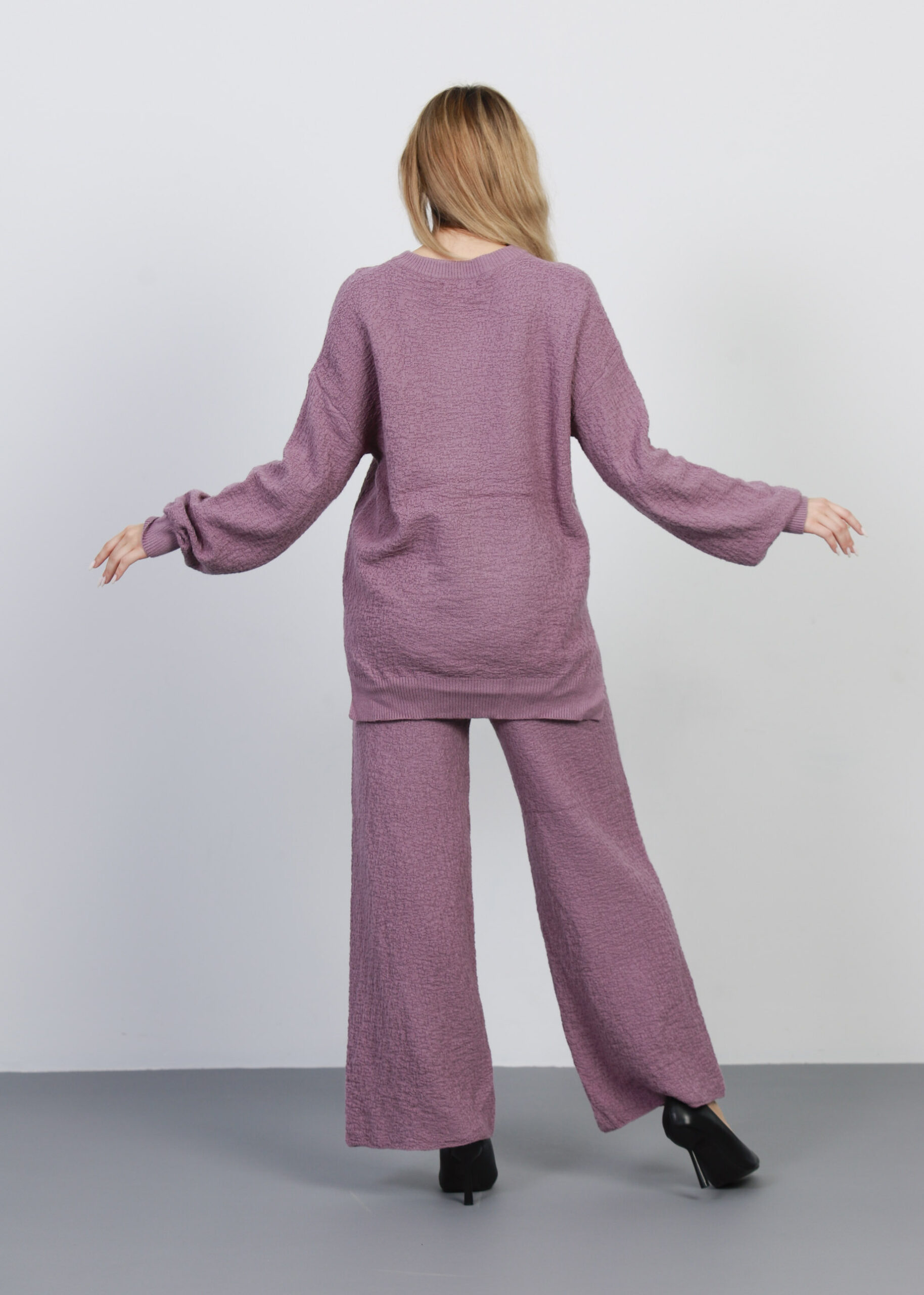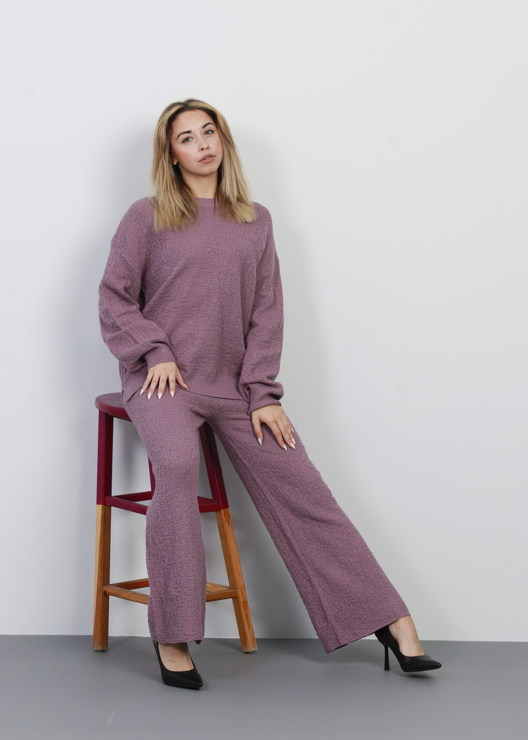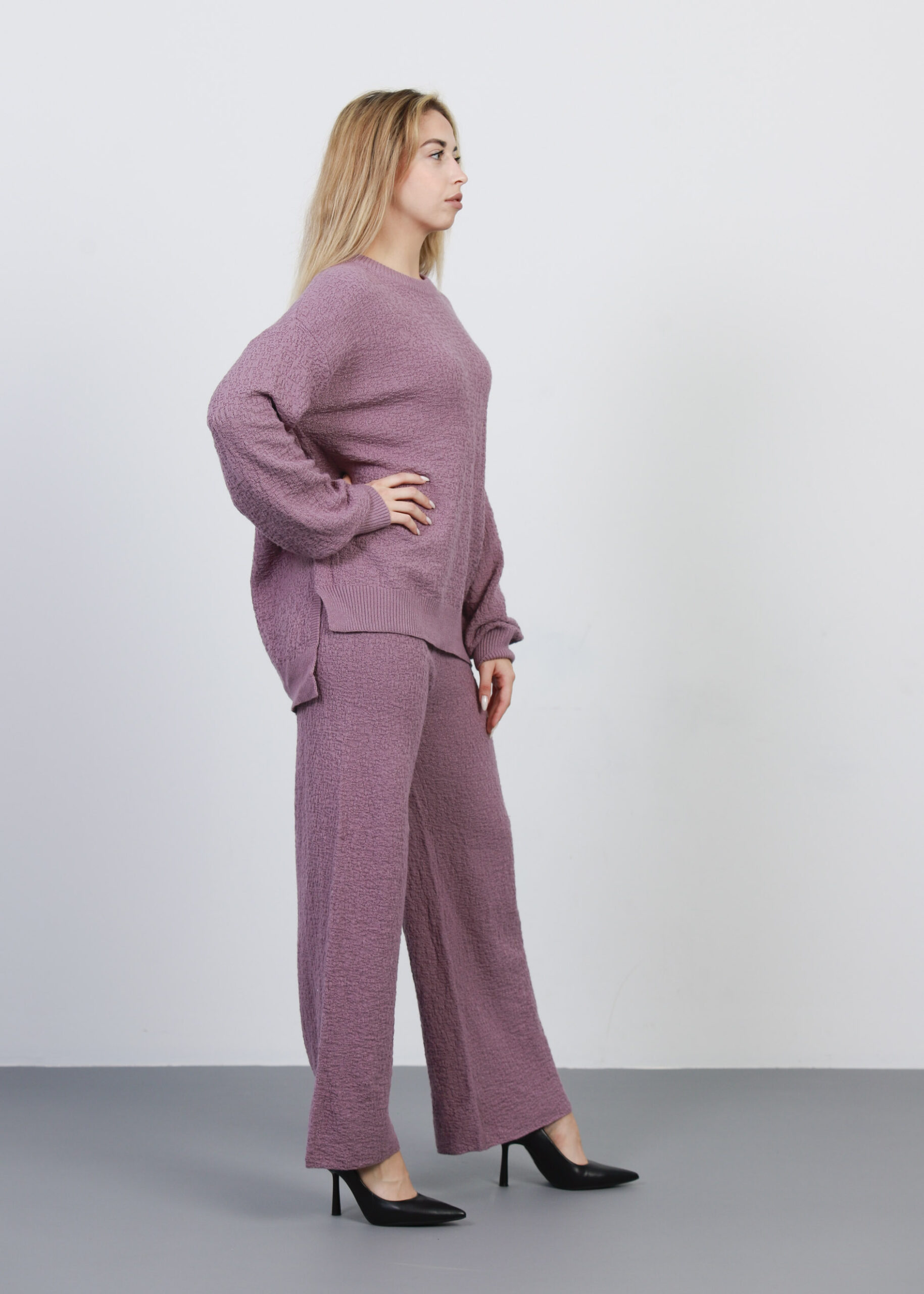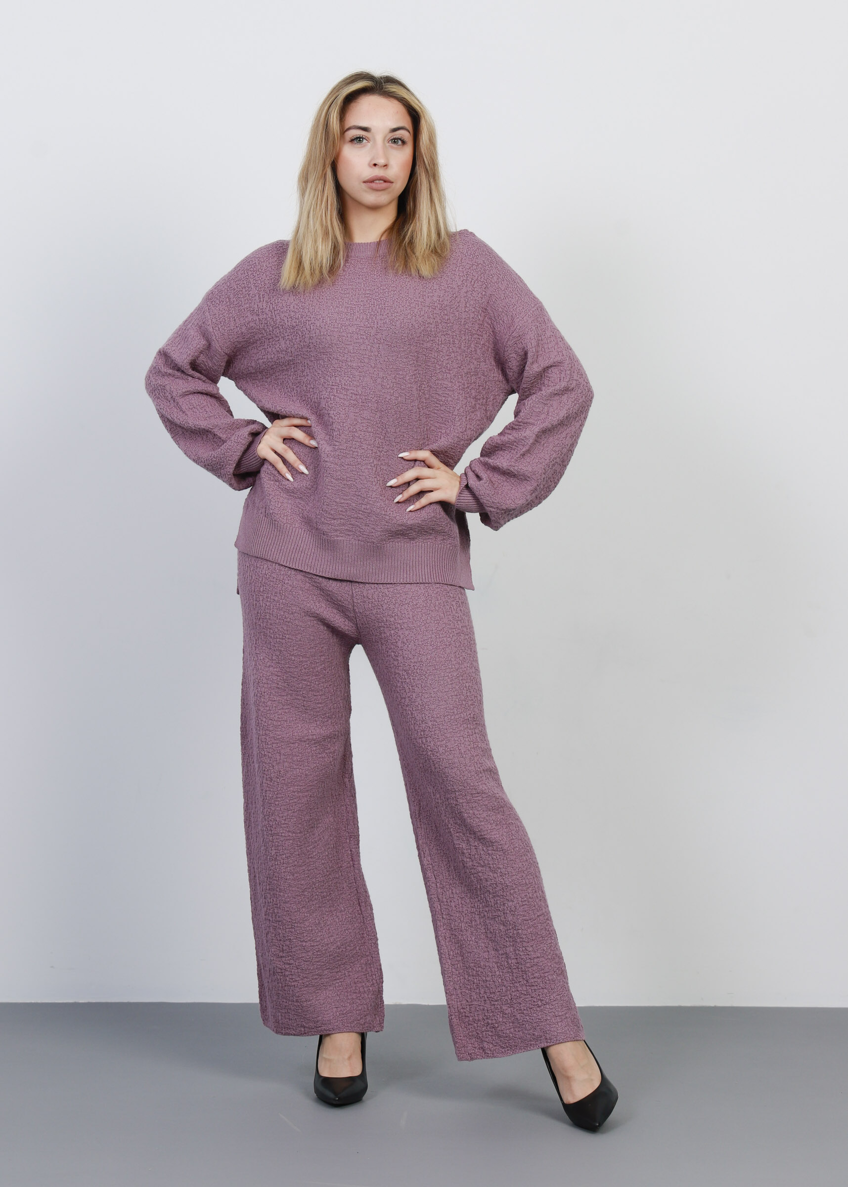 طقم نسائي, قطعتين, تصميم محبوك, بنقش, لون واحد, سادة, بلوزة, ياقة مدورة, اكمام طويلة مع معصم ضيق, بنطلون, خصر مطاطي, ساق واسعة, مريح وعملي