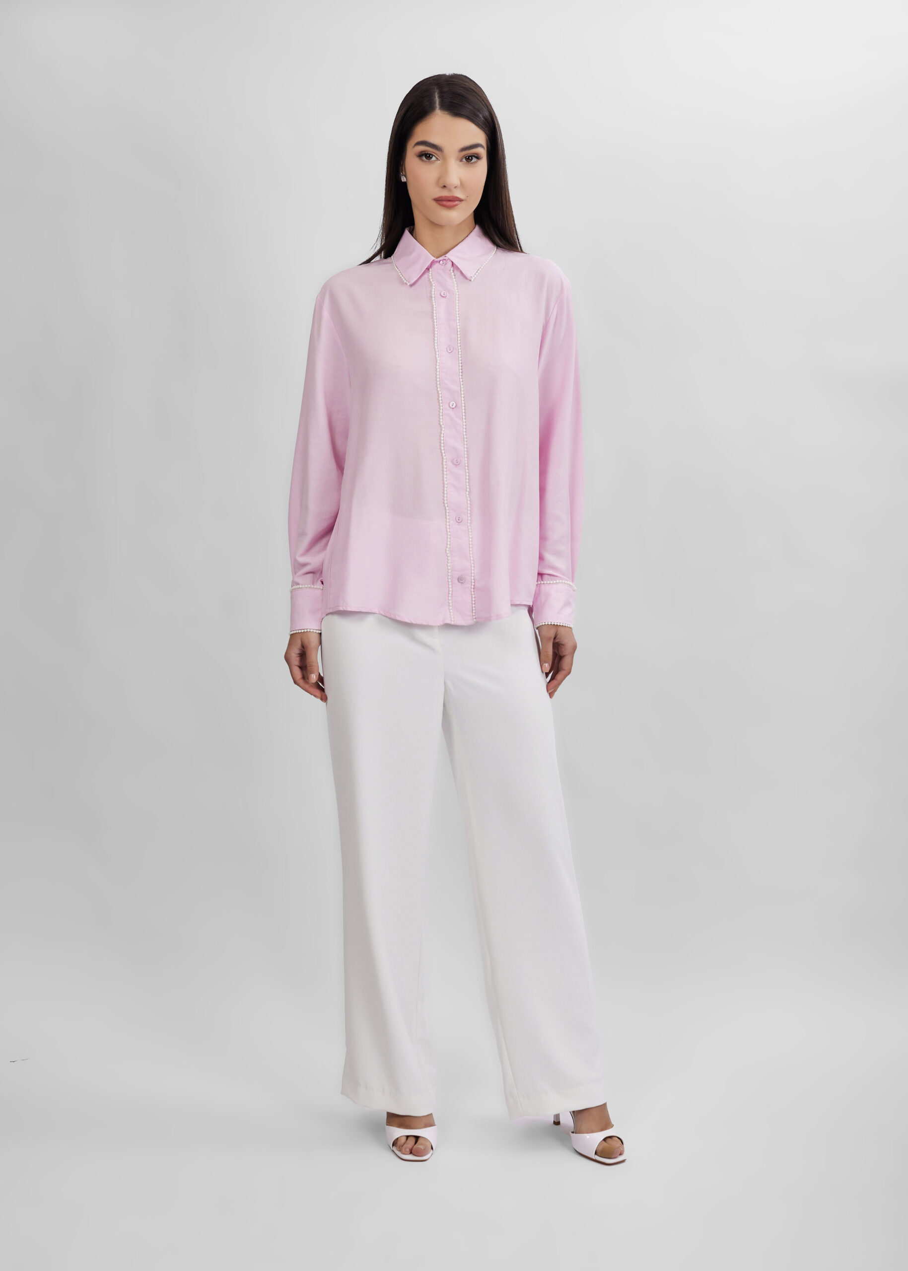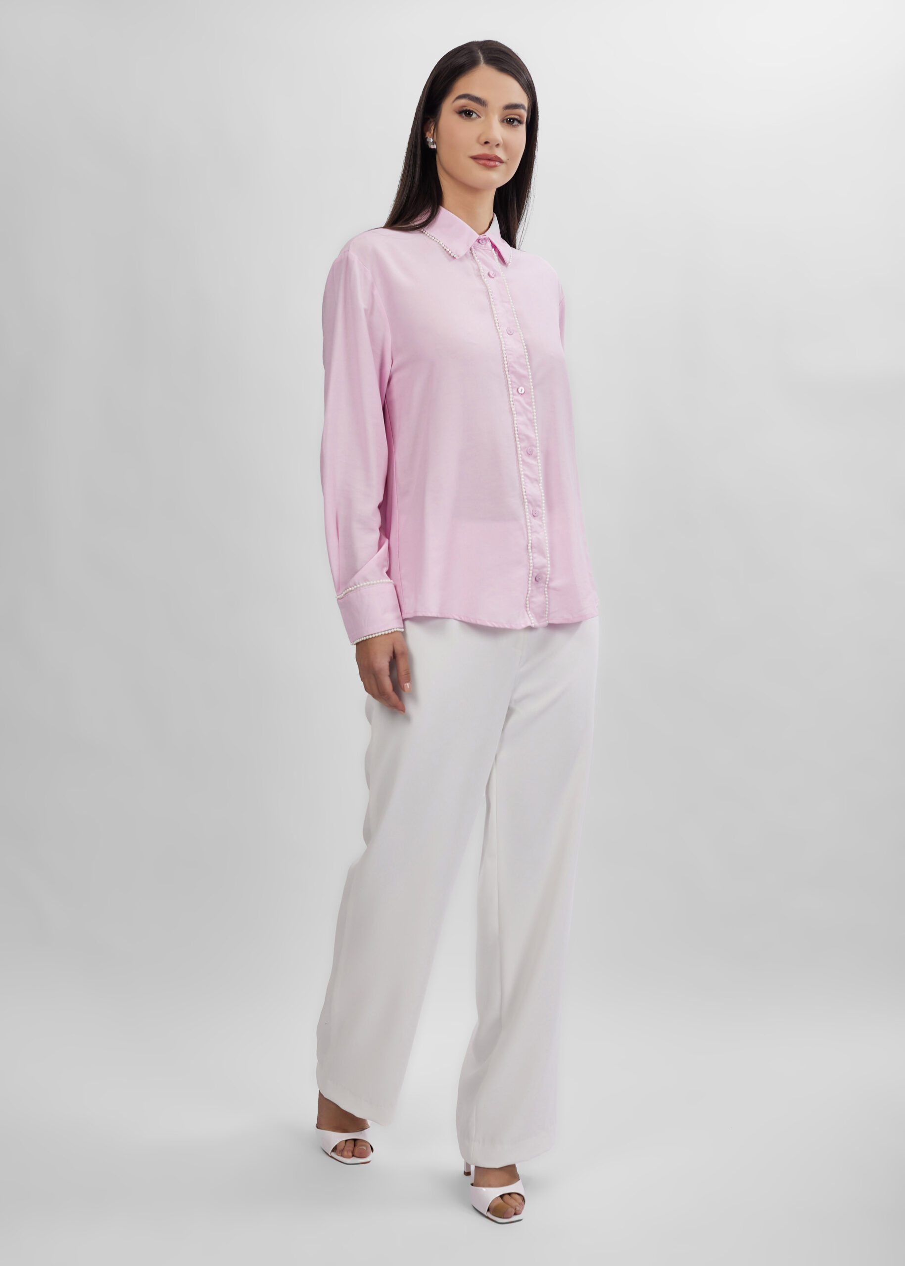قميص نسائي, سادة, مزين باللؤلؤ على الاطراف, ياقة مثنية مع زر من الامام, ازرار من الامام للاغلاق, اكمام طويلة مع معصم ضيق, انيق وعملي