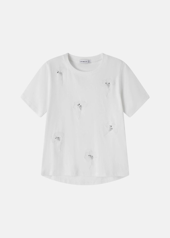 توب نسائي, مزين باللؤلؤ مع تطريز الورود من الامام, ياقة مدورة, اكمام قصيرة, انيق وعصري