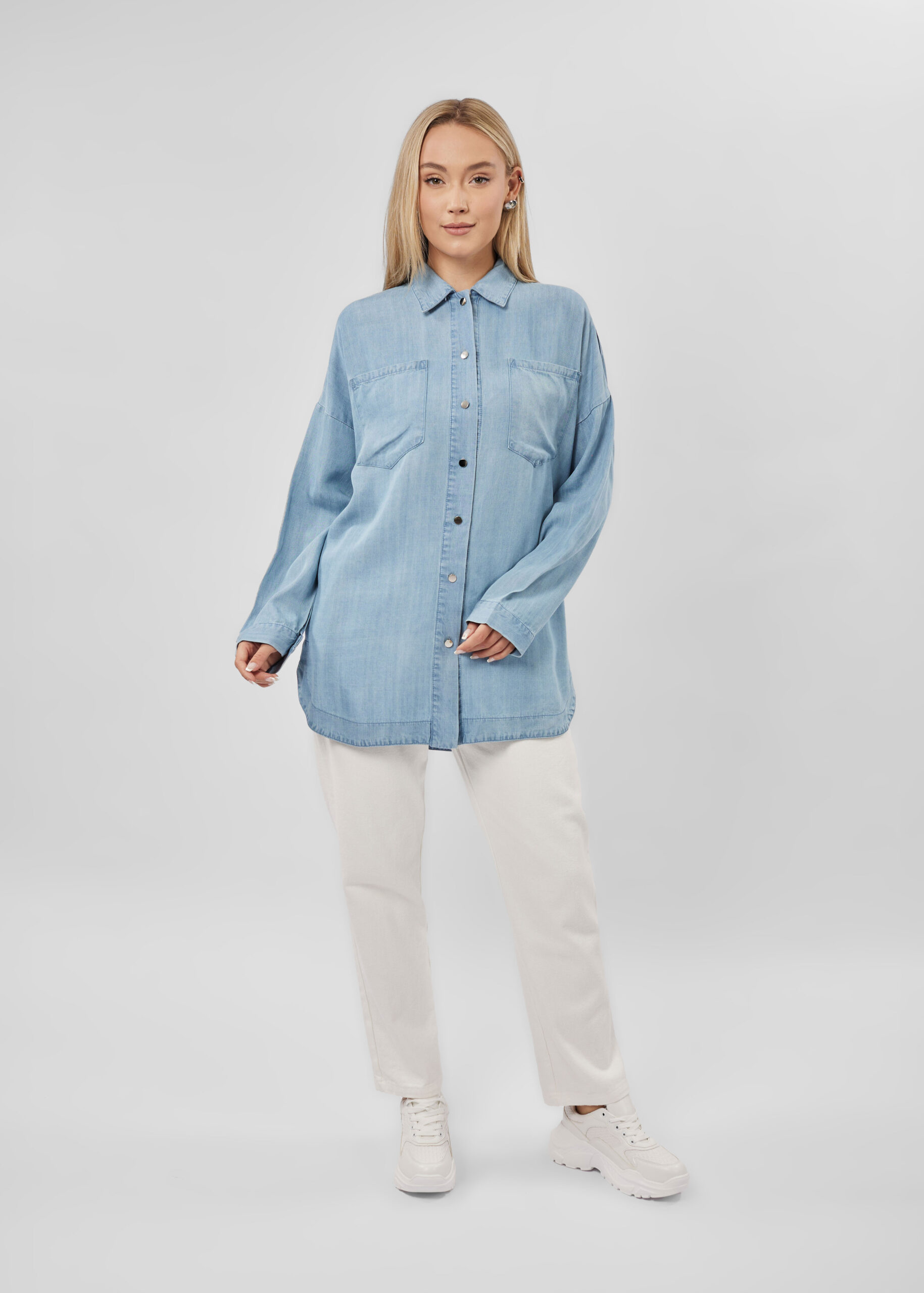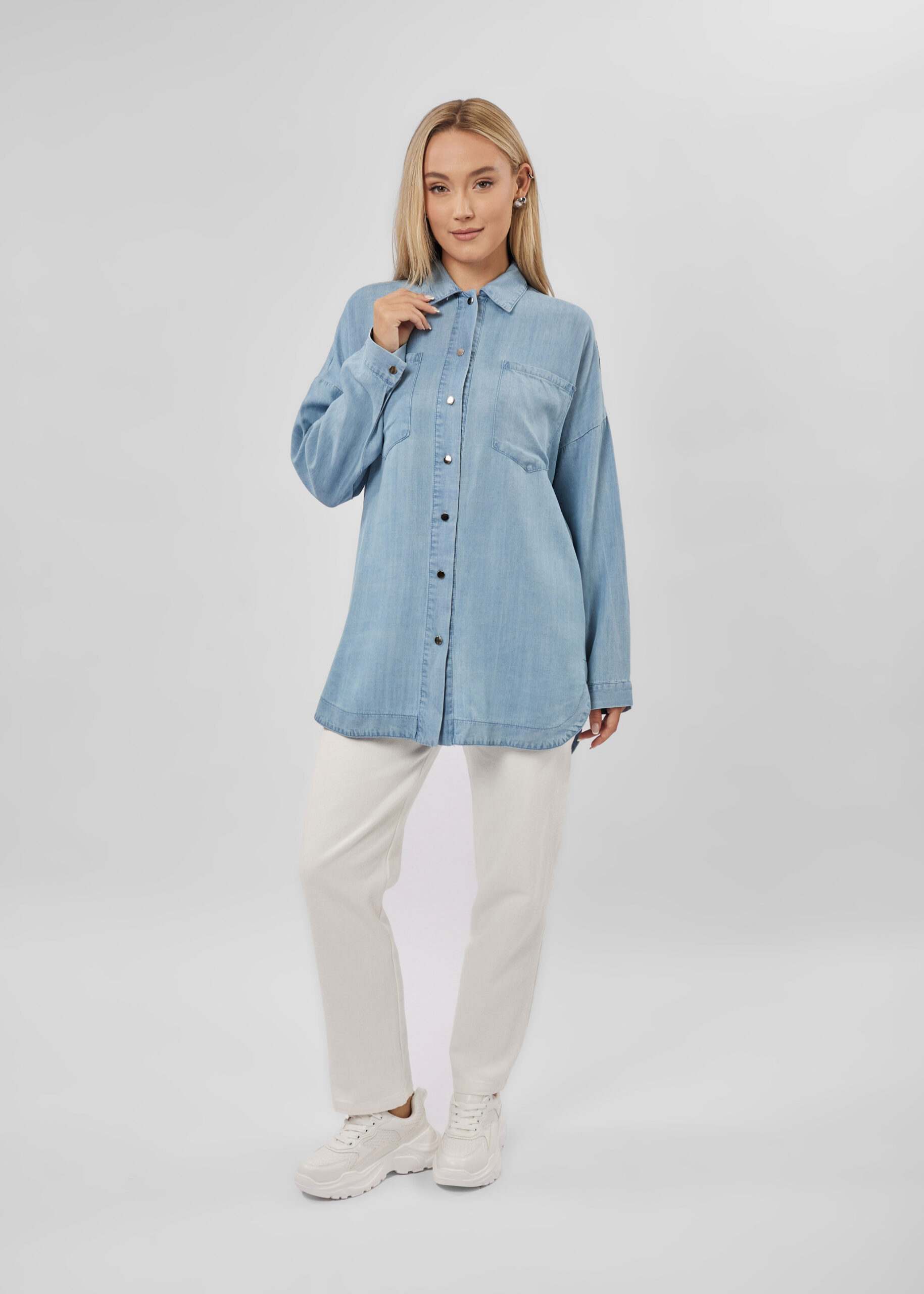 قميص نسائي, جينز, سادة, ازرار من الامام للاغلاق, ياقة مثنية, اكمام طويلة مع معصم ضيق, جيوب امامية, انيق وعملي