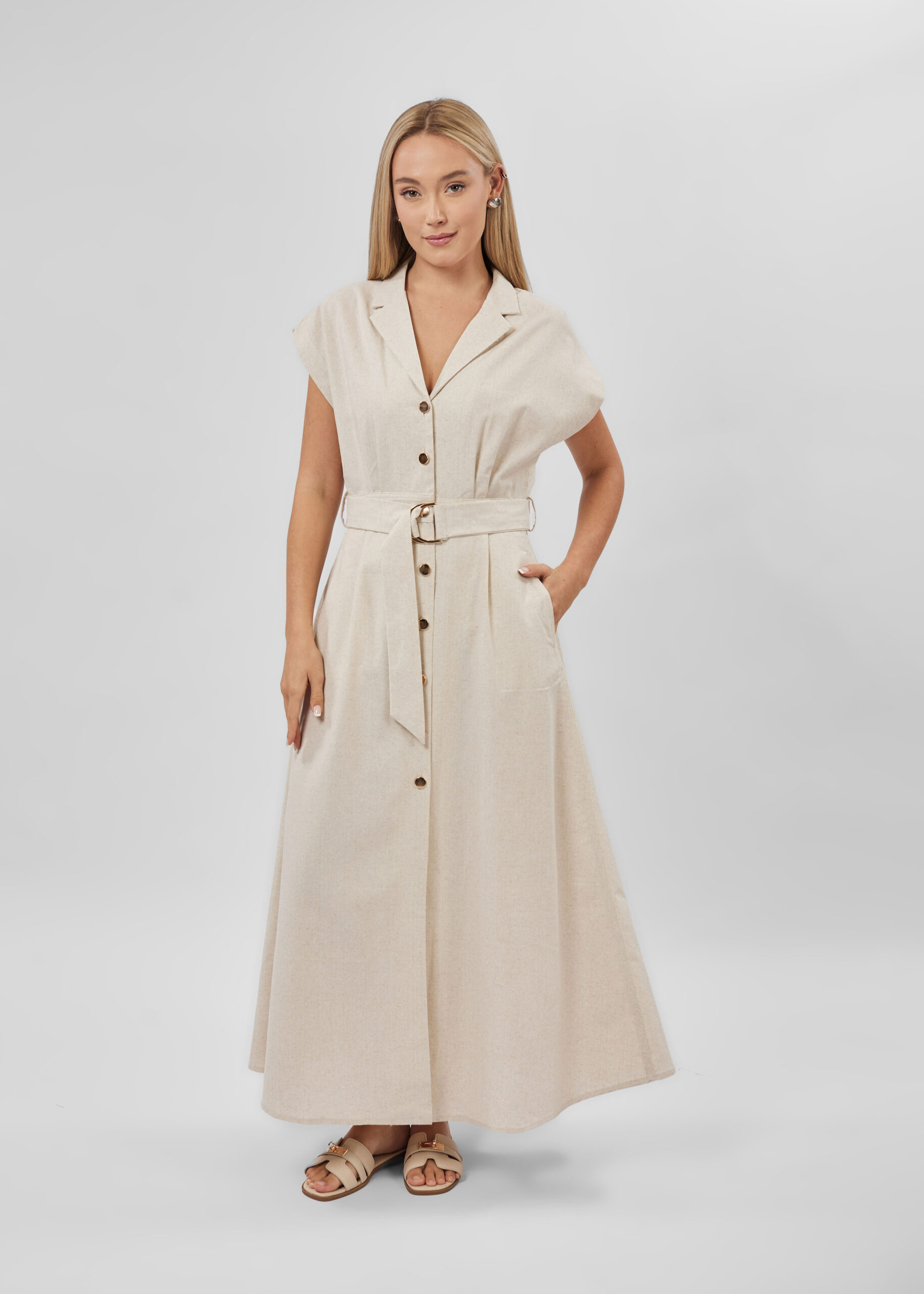 فستان نسائي, سادة, بدون اكمام, ياقة سبعة, ازرار من الامام للاغلاق, حزام خصر, انيق ومناسب لعدة مناسبات