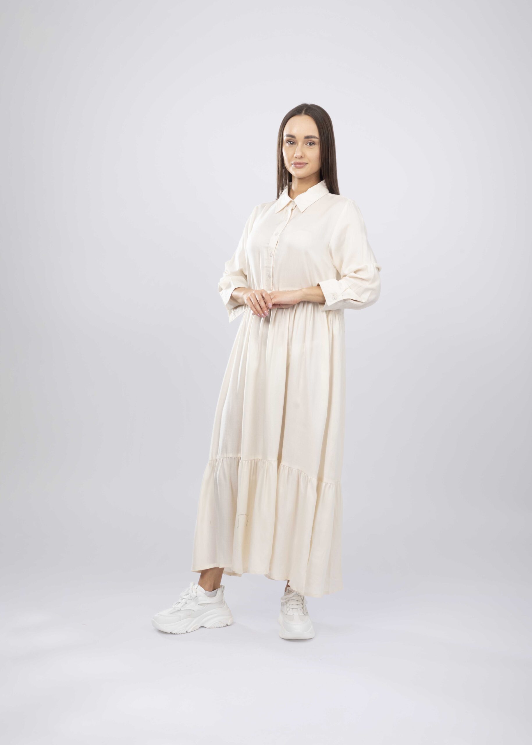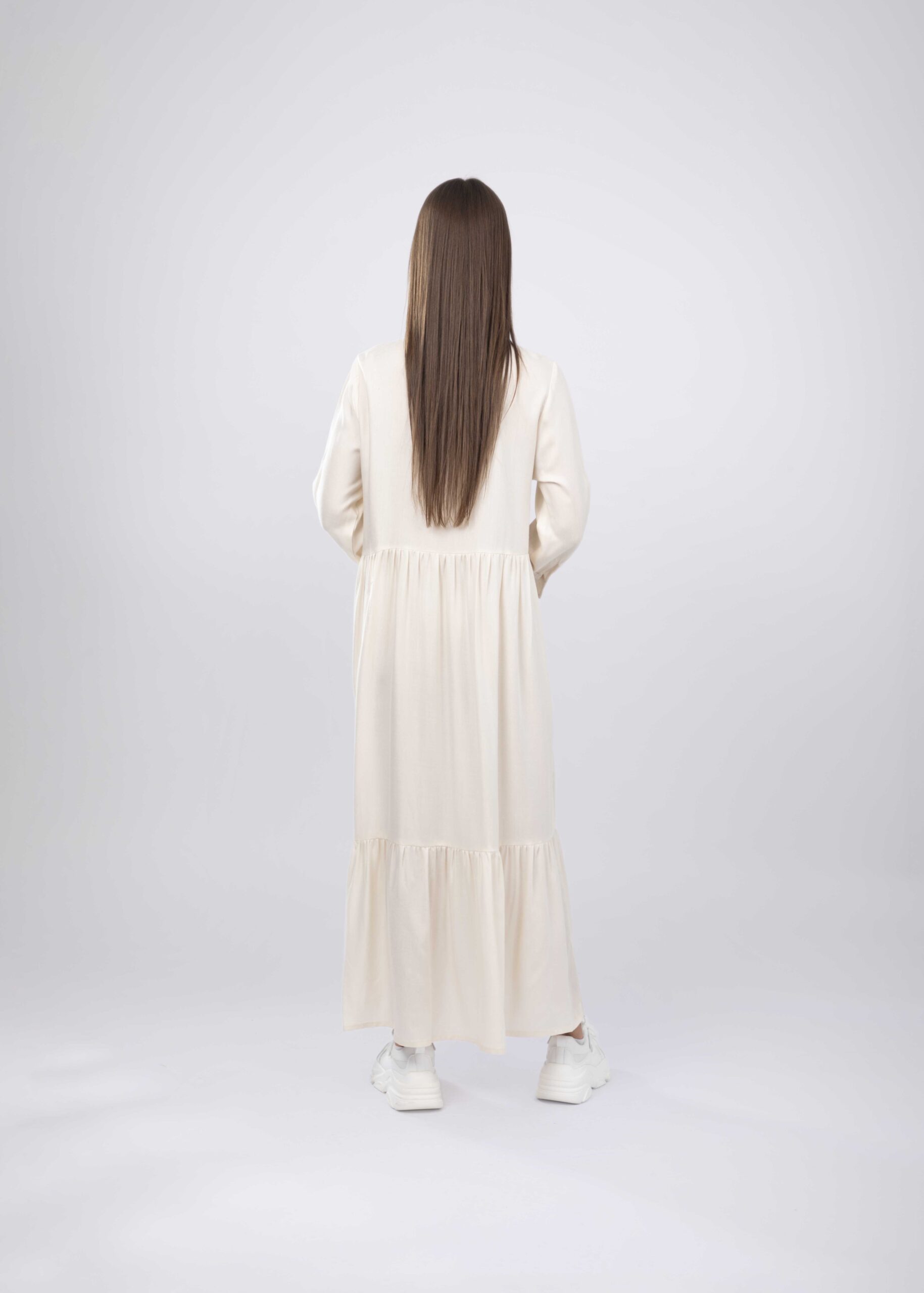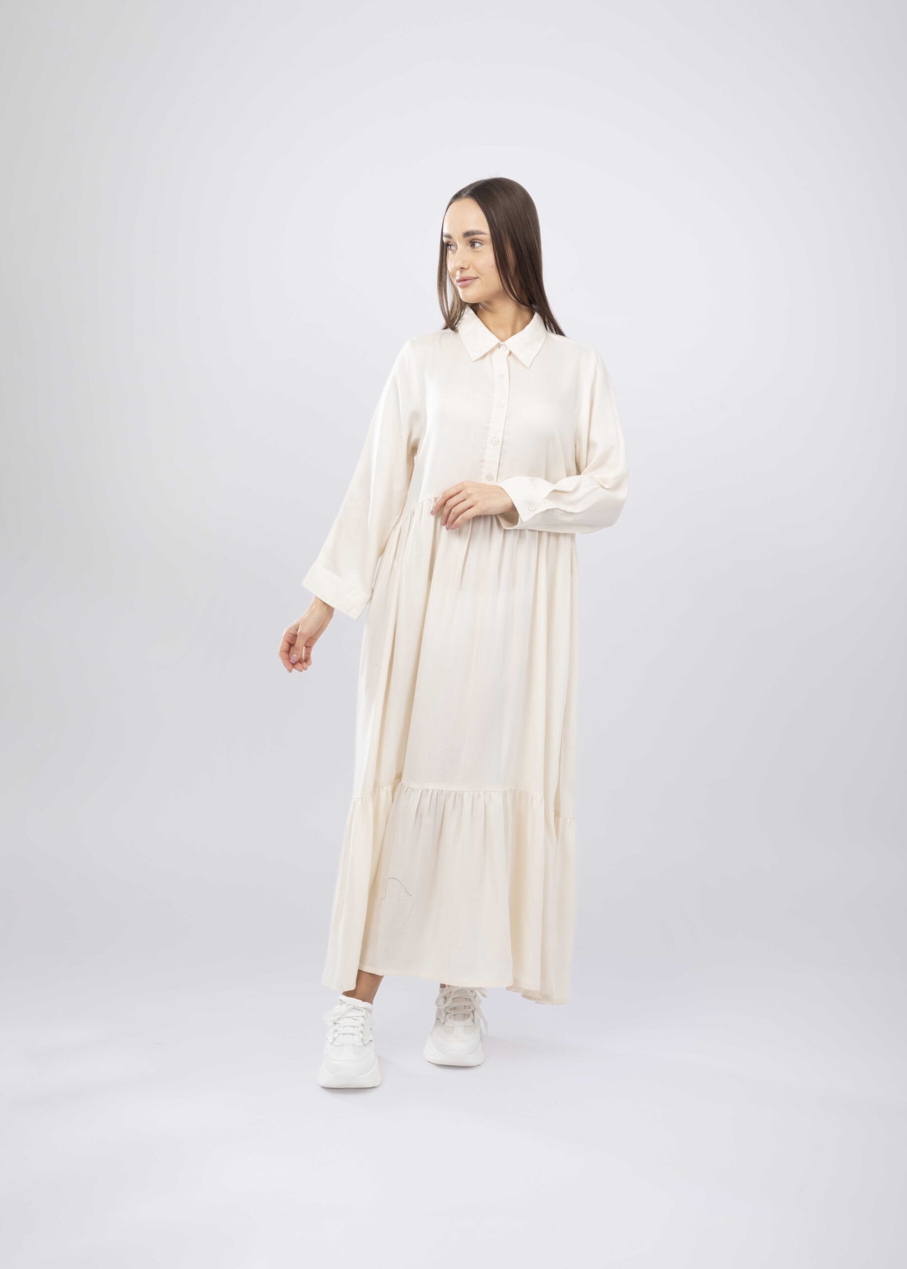 فستان نسائي, طويل, سادة, طبقات, ياقة مثنية مع ازرار من الامام, اكمام طويلة مع معصم ضيق, انيق وعملي