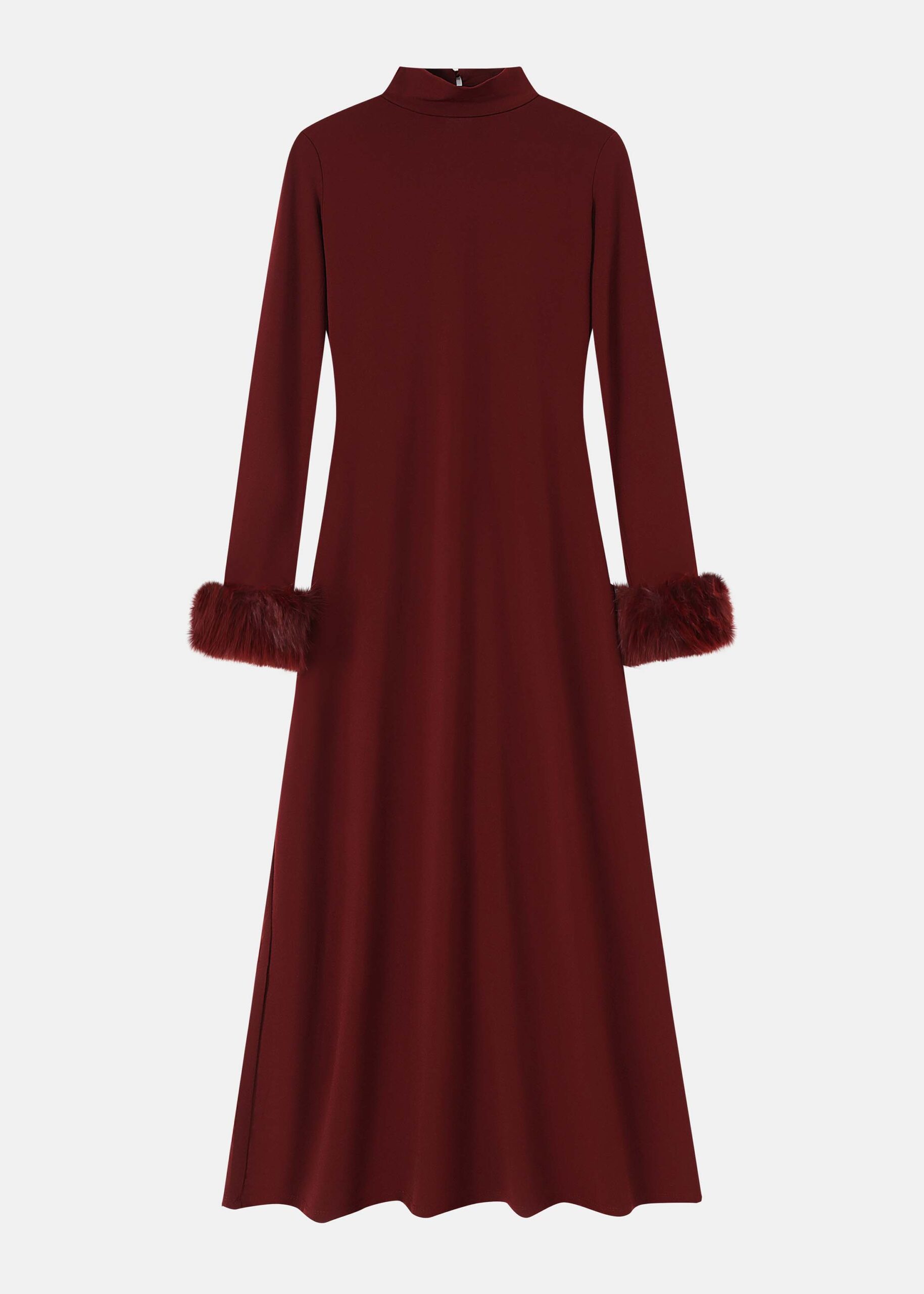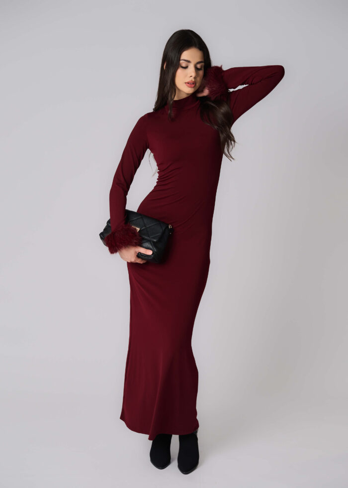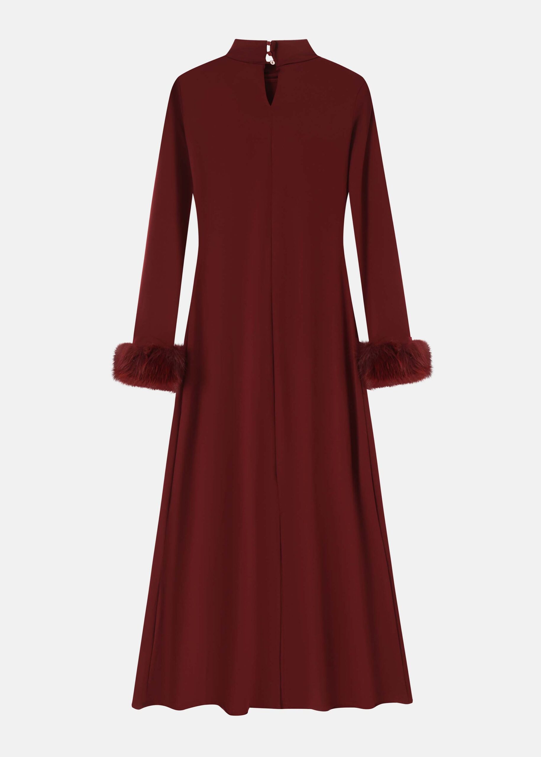 فستان نسائي, سادة, طويل, ياقة مرتفعة مع زر من الخلف, اكمام طويلة مع معصم فرو, انيق وعصري