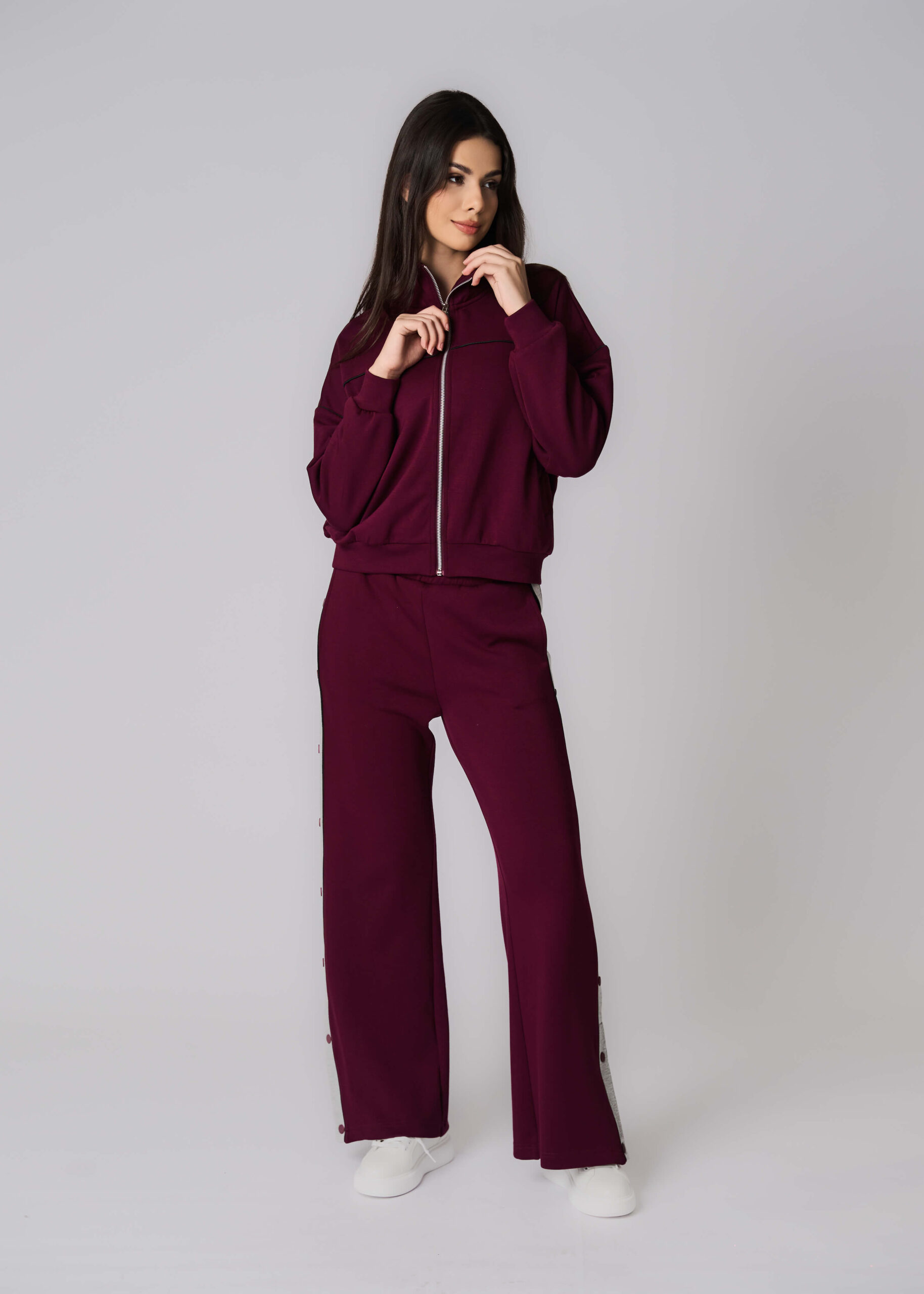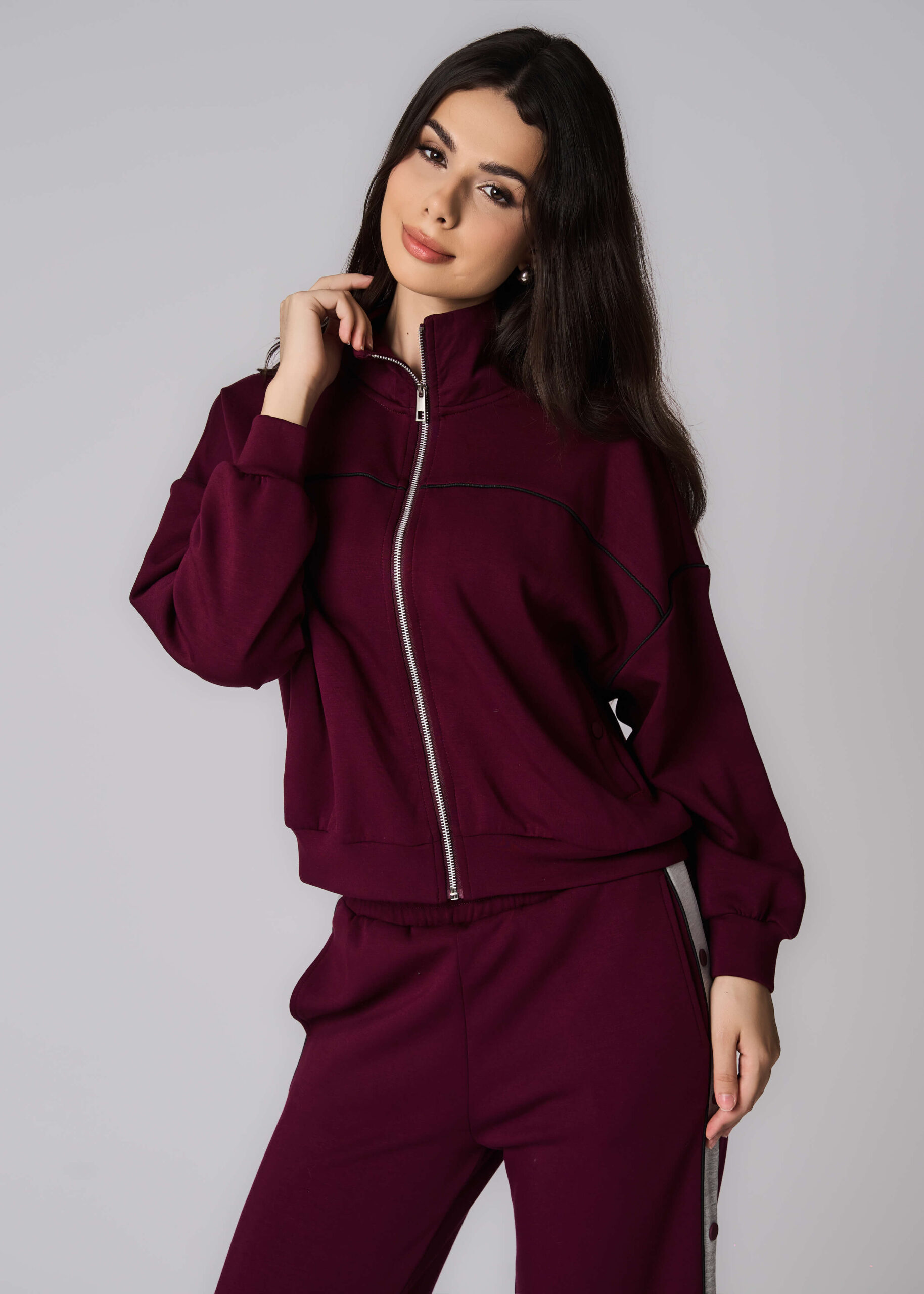 جاكيت نسائي, نسيج السكوبا, سادة, ياقة مرتفعة, سحاب للاغلاق من الامام, اكمام طويلة مع معصم ضيق, جيوب من الامام مع ازرار, مريح وعملي