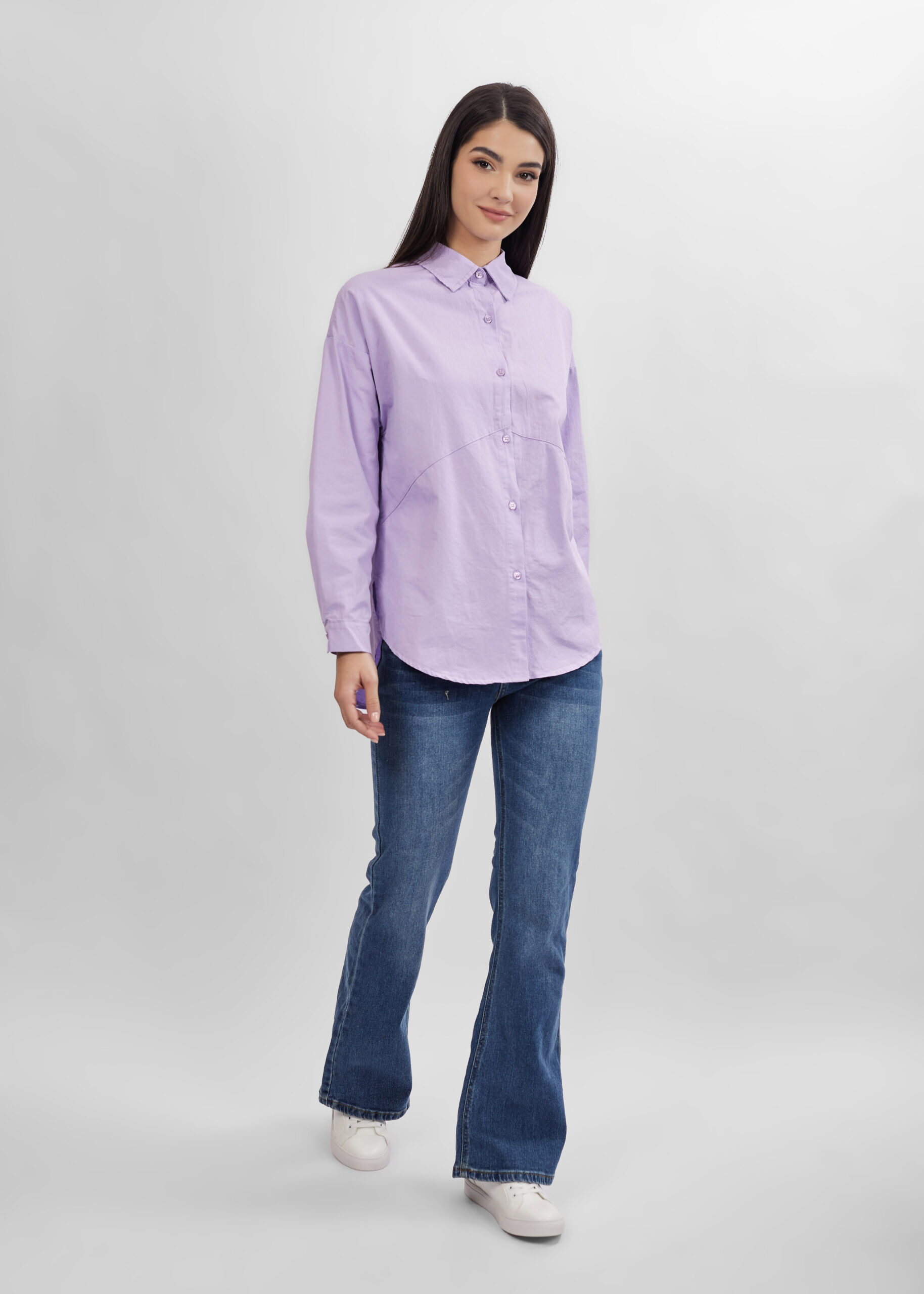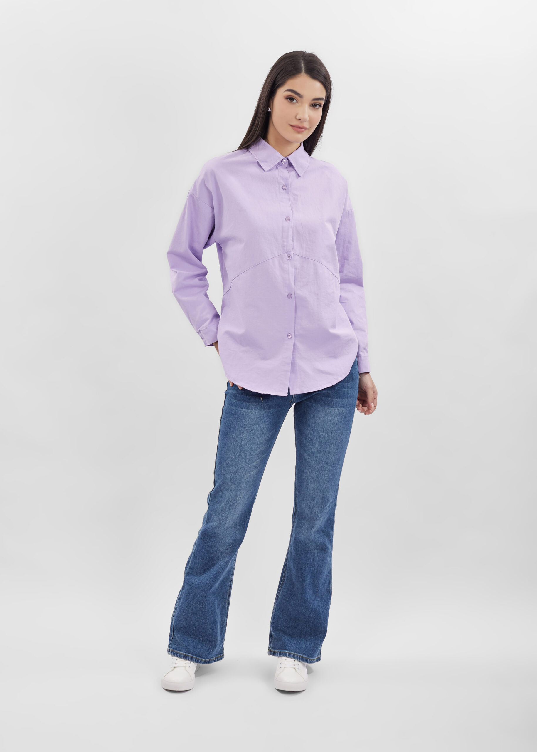 قميص نسائي, سادة, ازرار من الامام للاغلاق, اكمام طويلة مع معصم ضيق, ياقة مثنية مع زر من الامام, انيق وعصري
