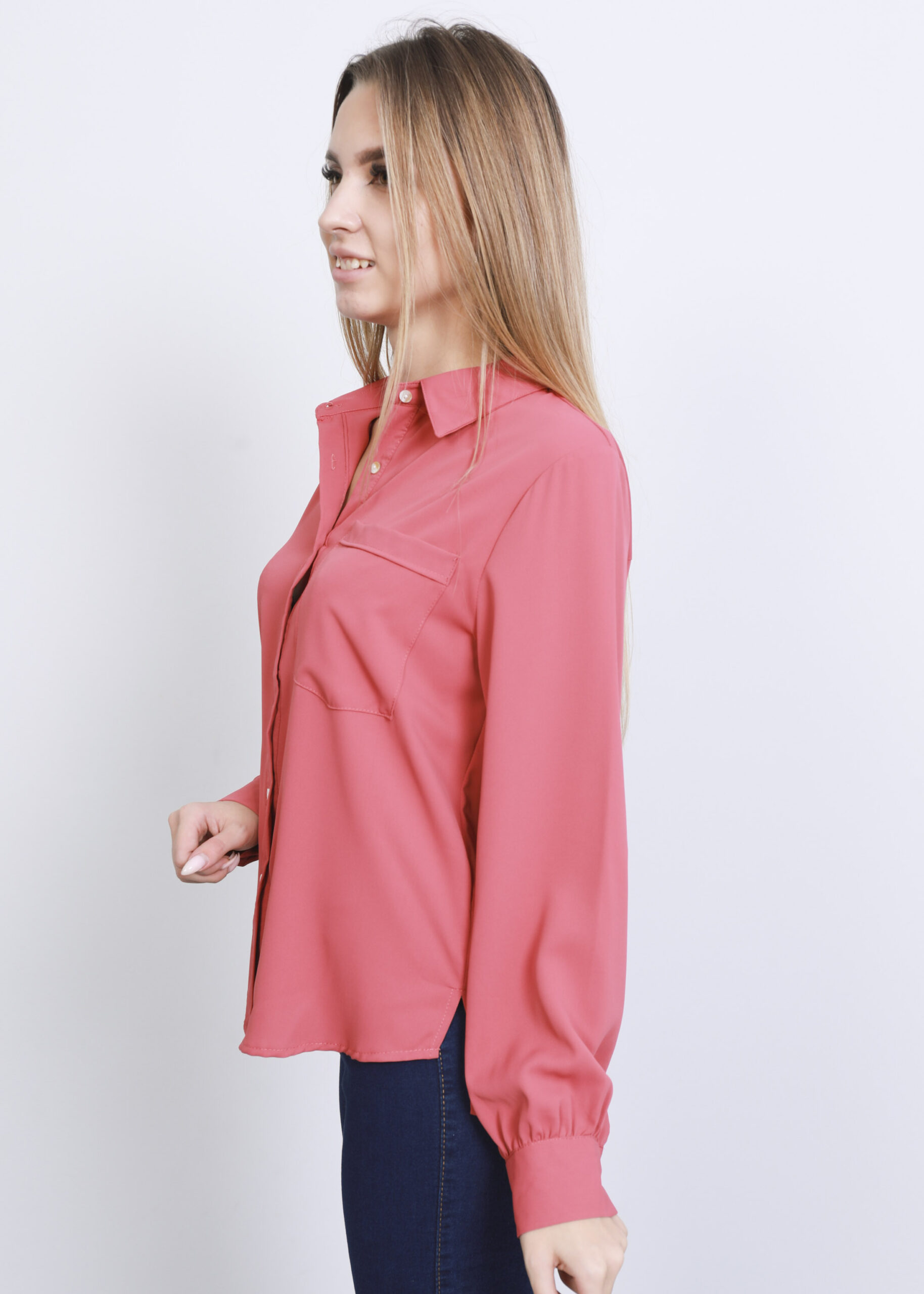 قميص نسائي, سادة, أكمام طويلة مع معصم ضيق, أزرار أمامية, ياقة مثنية مع زر أمامي, جيب أمامي صغير, 100% بوليستر