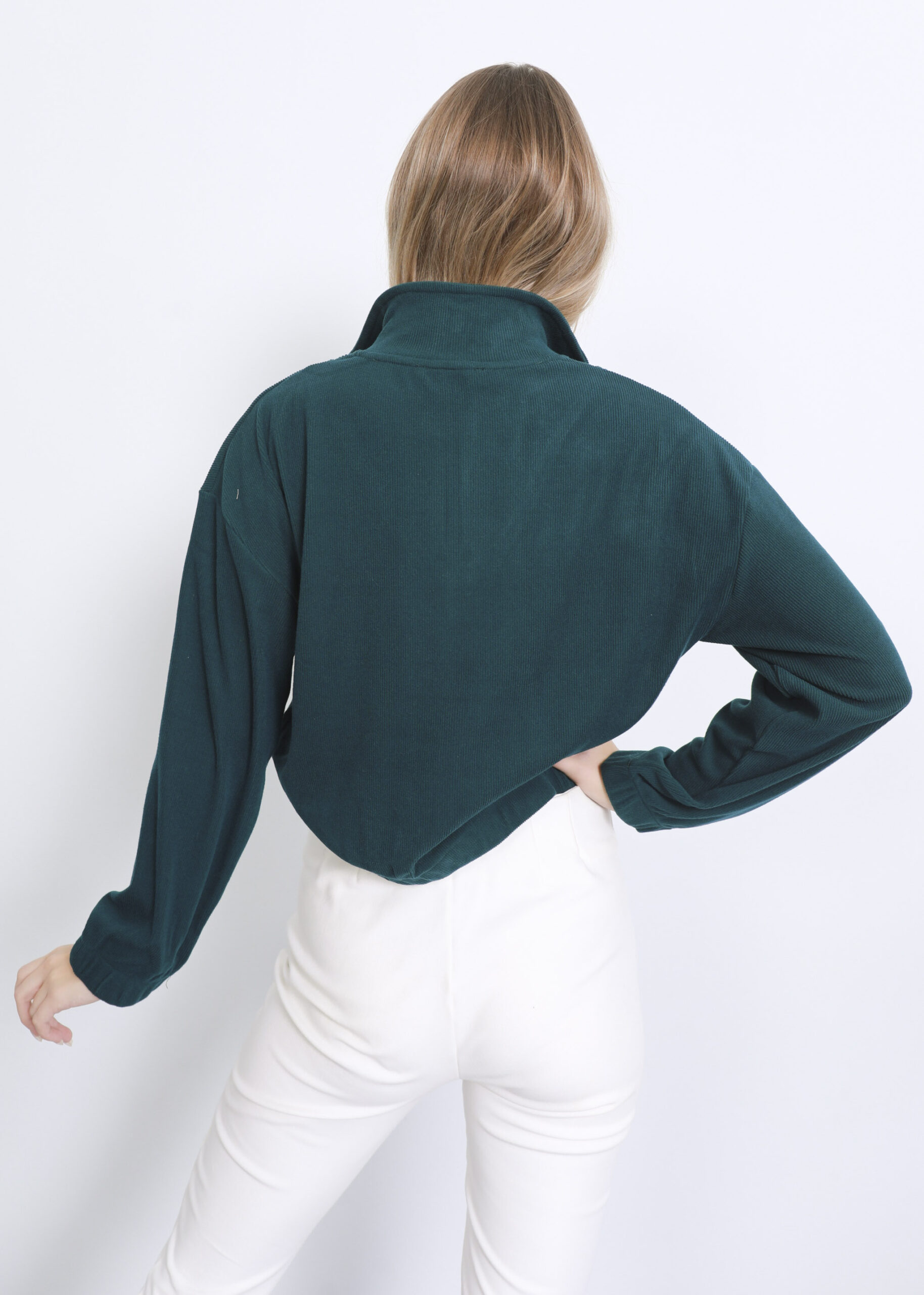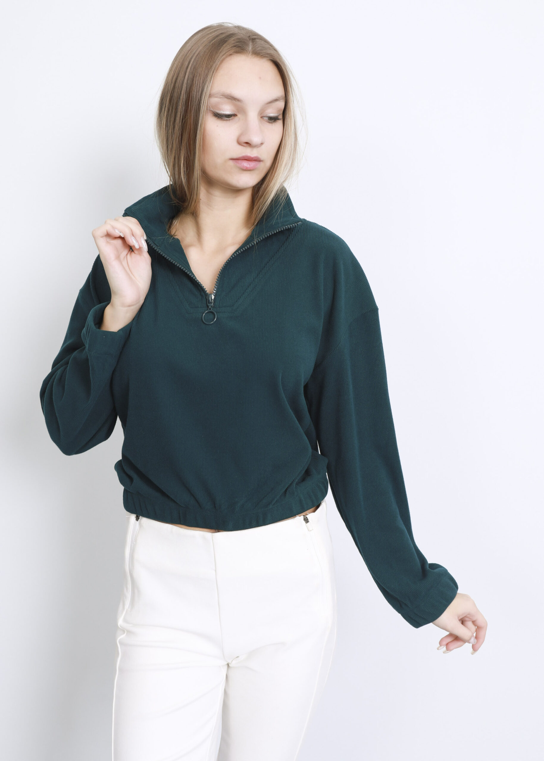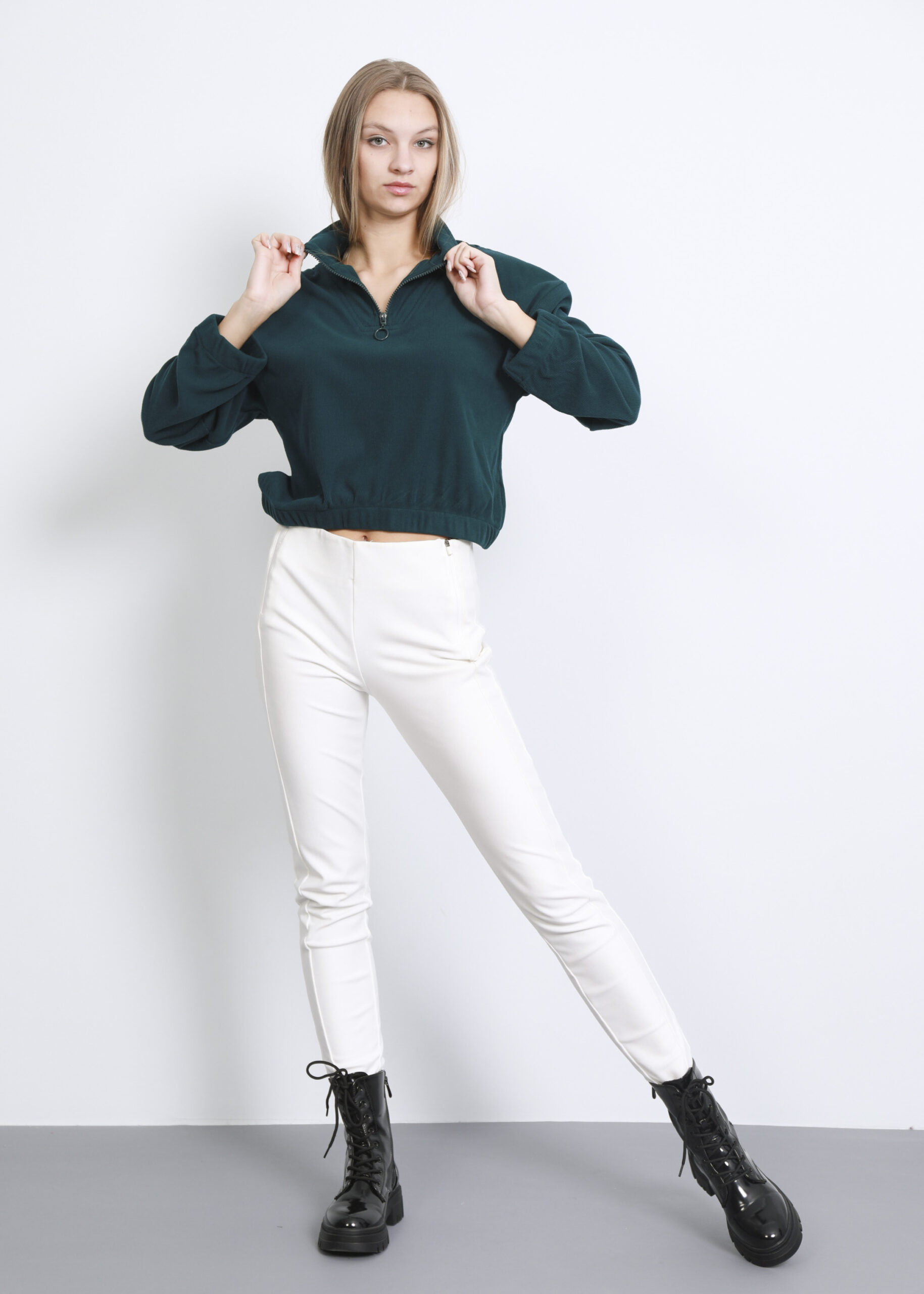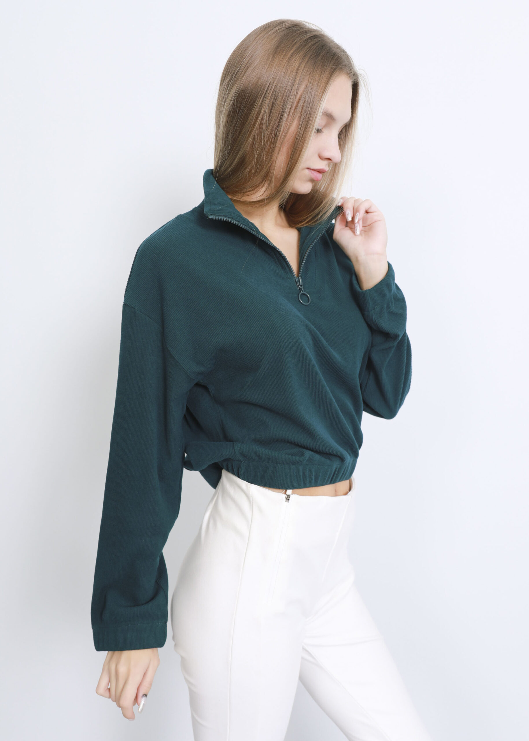 بلوزة نسائي, سادة, قصيرة, اكمام طويلة مع معصم مطاطي, خصر مطاطي, ياقة مثنية مع سحاب امامي للاغلاق, انيقة وعصرية, 85% بوليستر 15% سباندكس