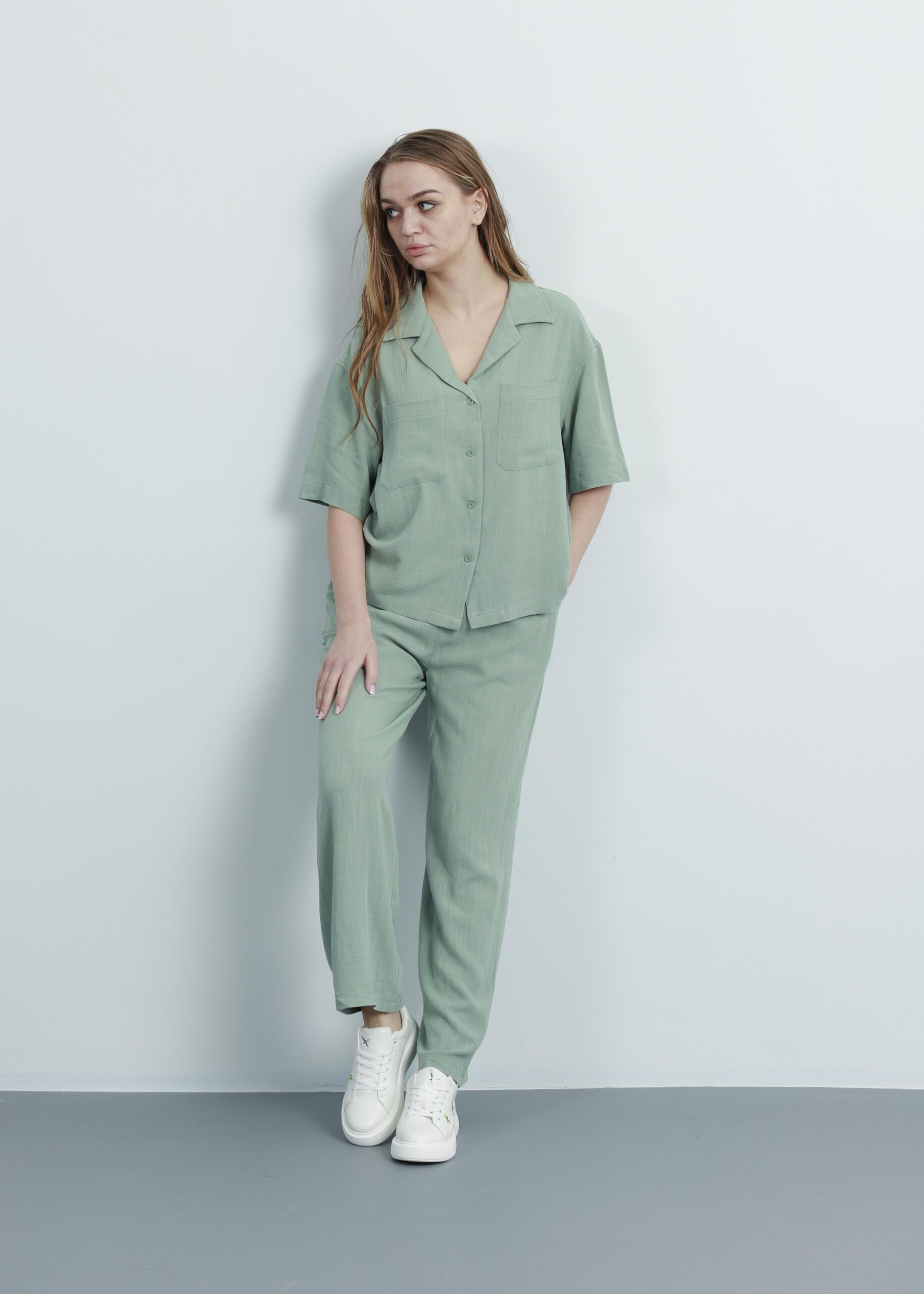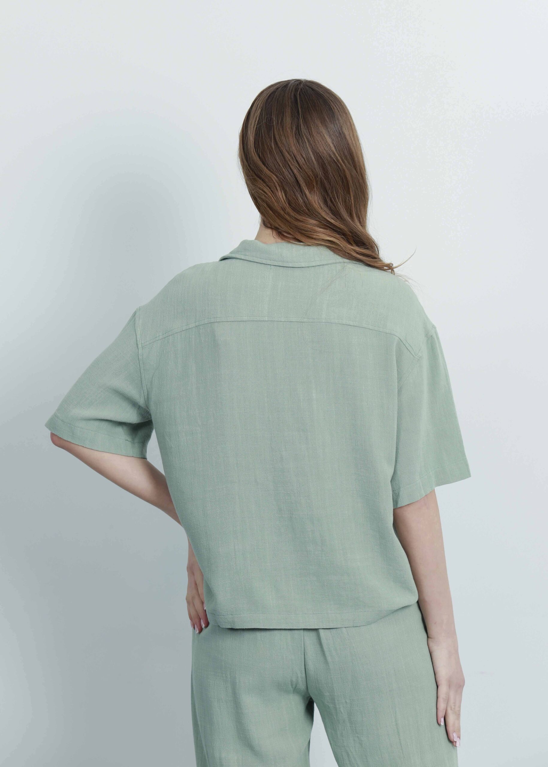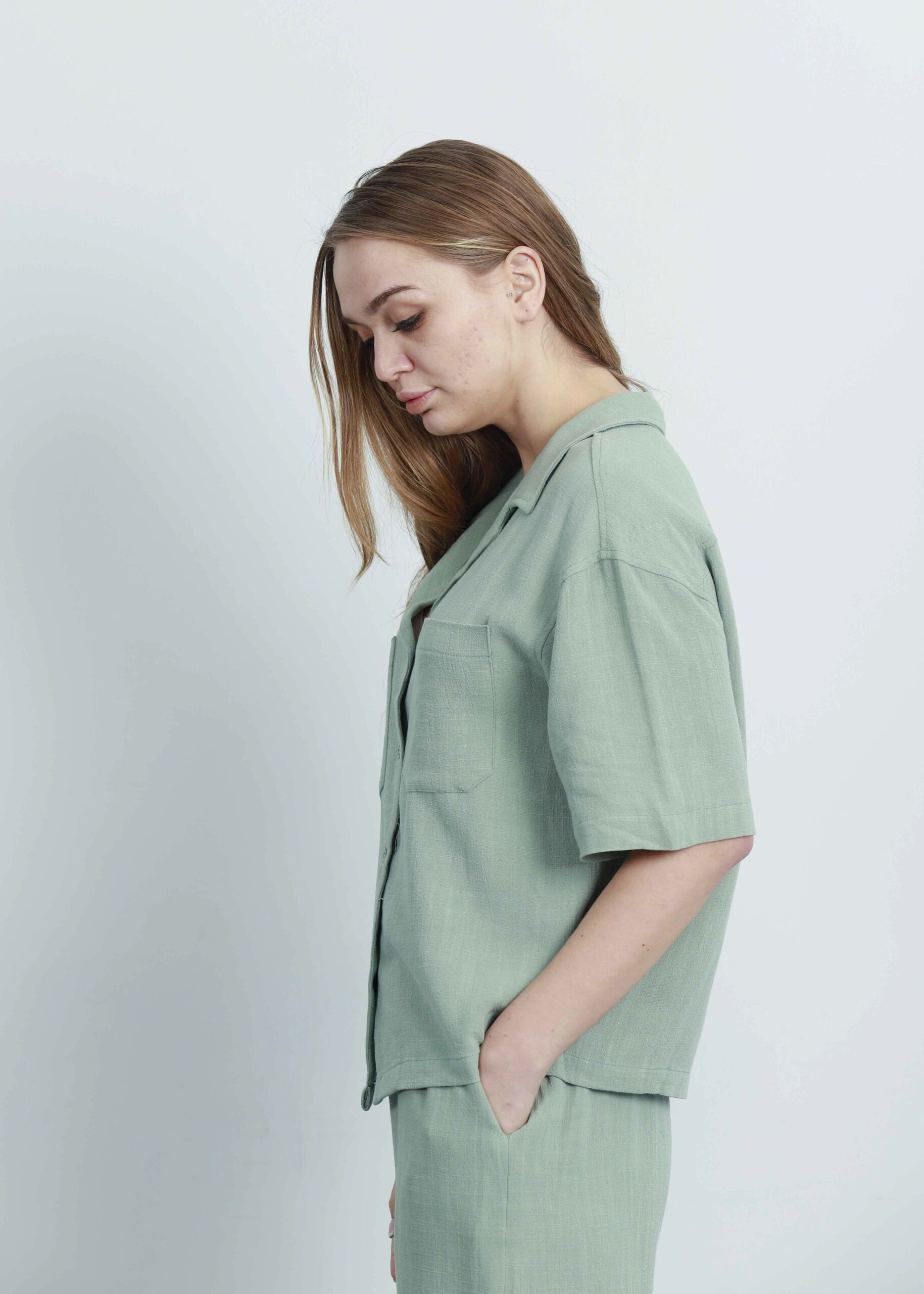 قميص نسائي, سادة, اكمام قصيرة, جيوب امامية, ازرار امامية للاغلاق, ياقة مثنية من الخلف وسبعة من الامام, مريح وعملي, 30% كتان 70% فيسكوز