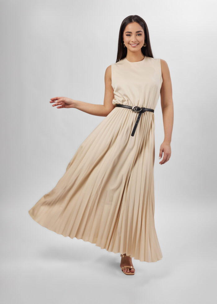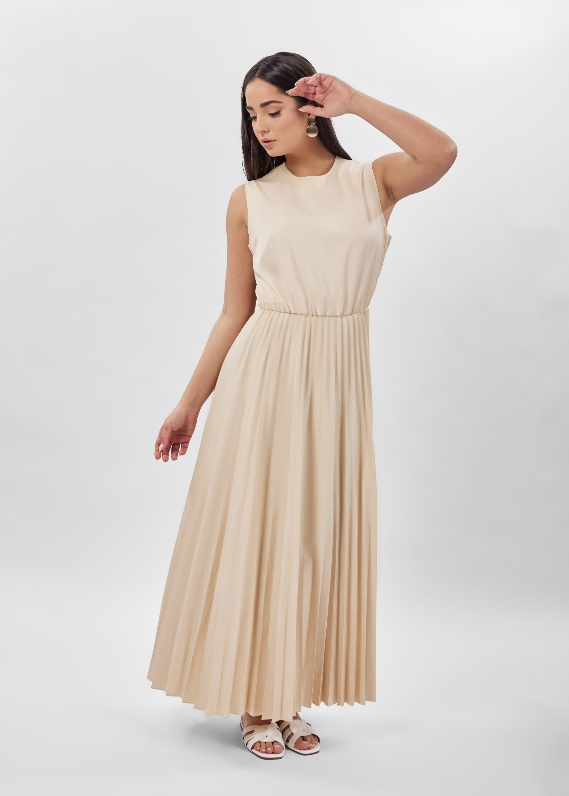 فستان نسائي, طويل, سادة, كسرات, ياقة مدورة مع سحاب من الخلف للاغلاق, بدون اكمام, انيق وعصري