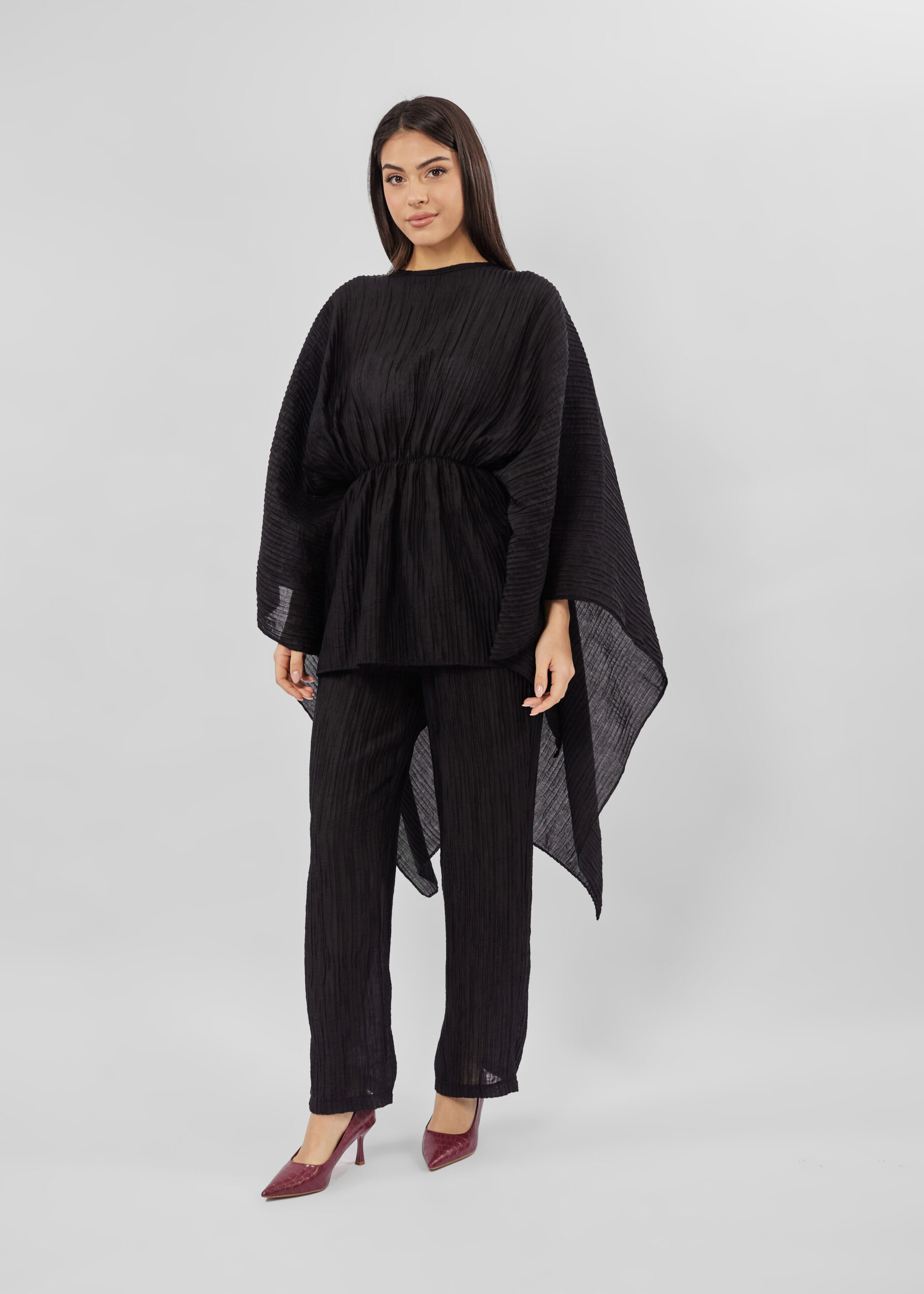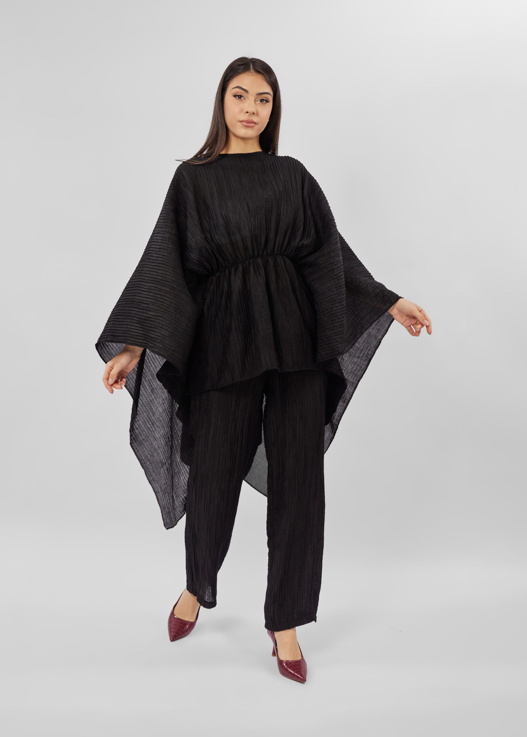 بلوزة نسائي, كسرات, واسعة, ياقة مدورة مع سحاب من الخلف للاغلاق, خصر مطاطي مع حبل للربط من الخلف, اكمام واسعة طويلة, انيقة وعصرية