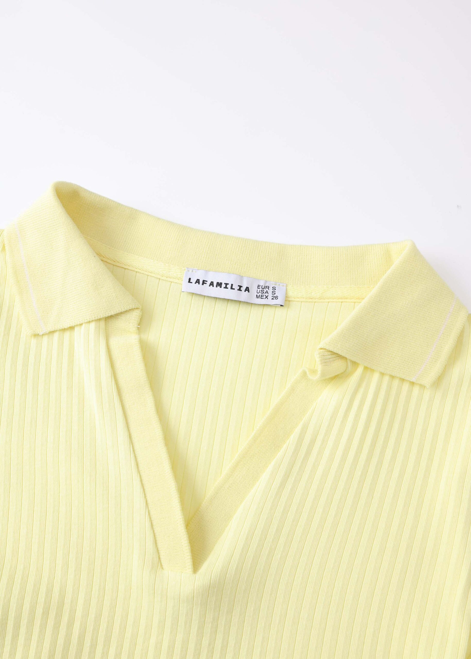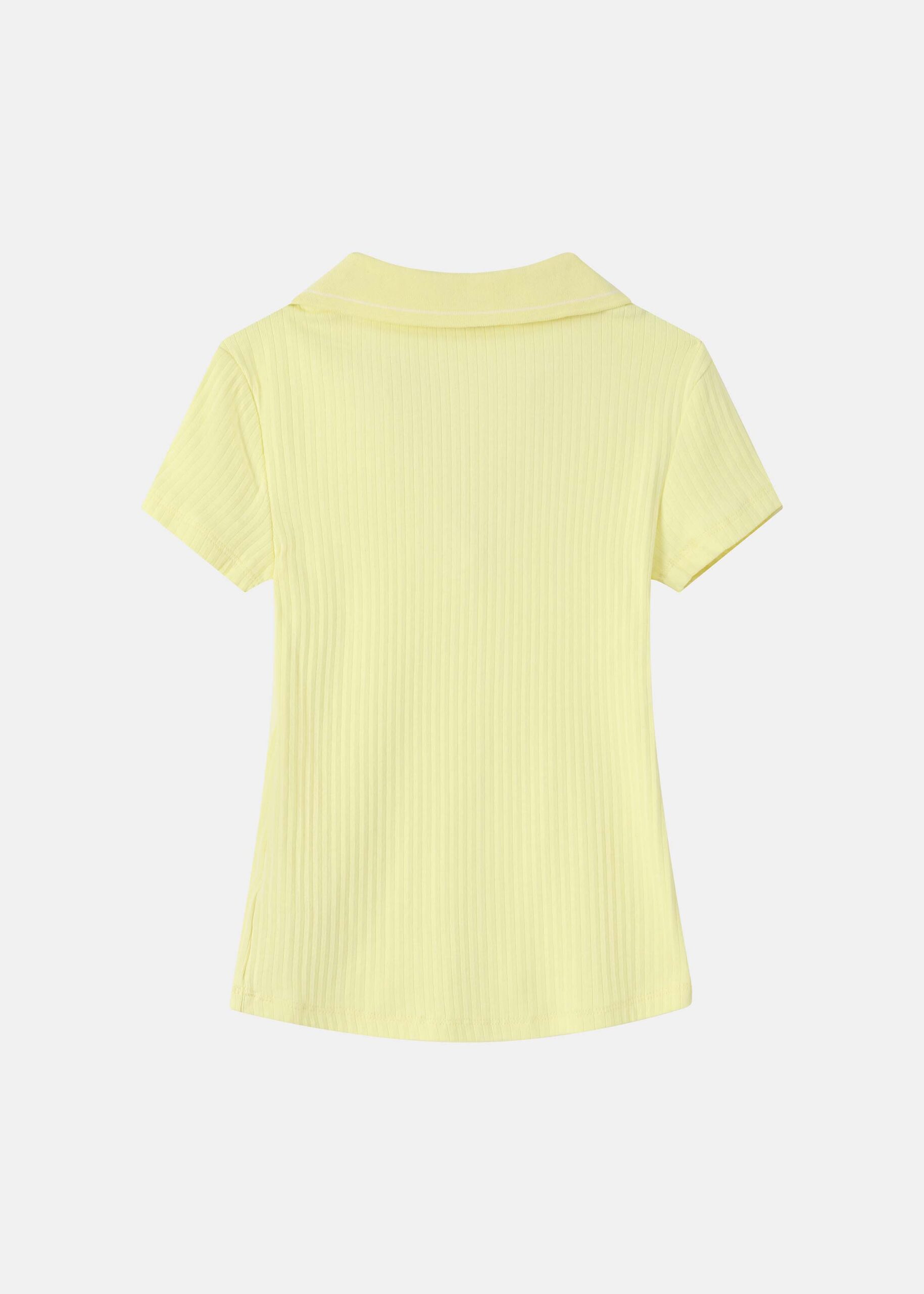Women polo shirt, ribbed fabric, rolled collar V neck, short sleeves, unique and modern